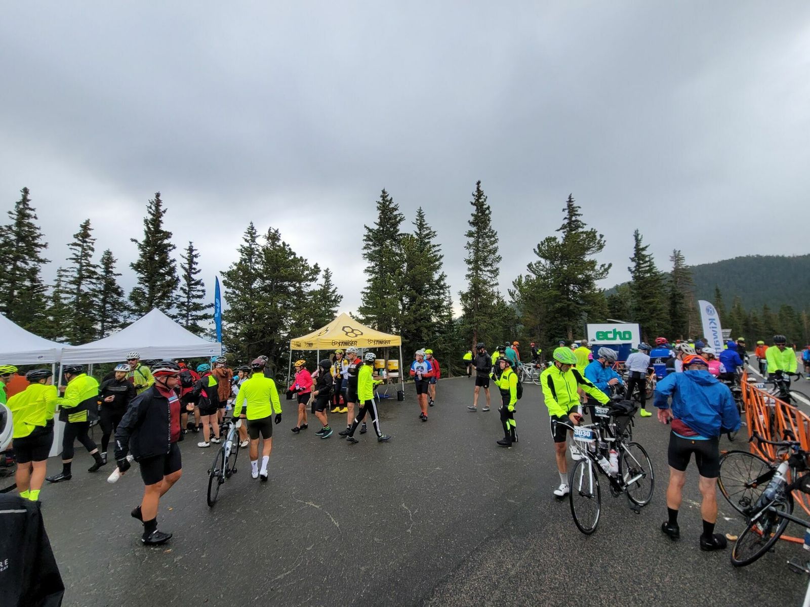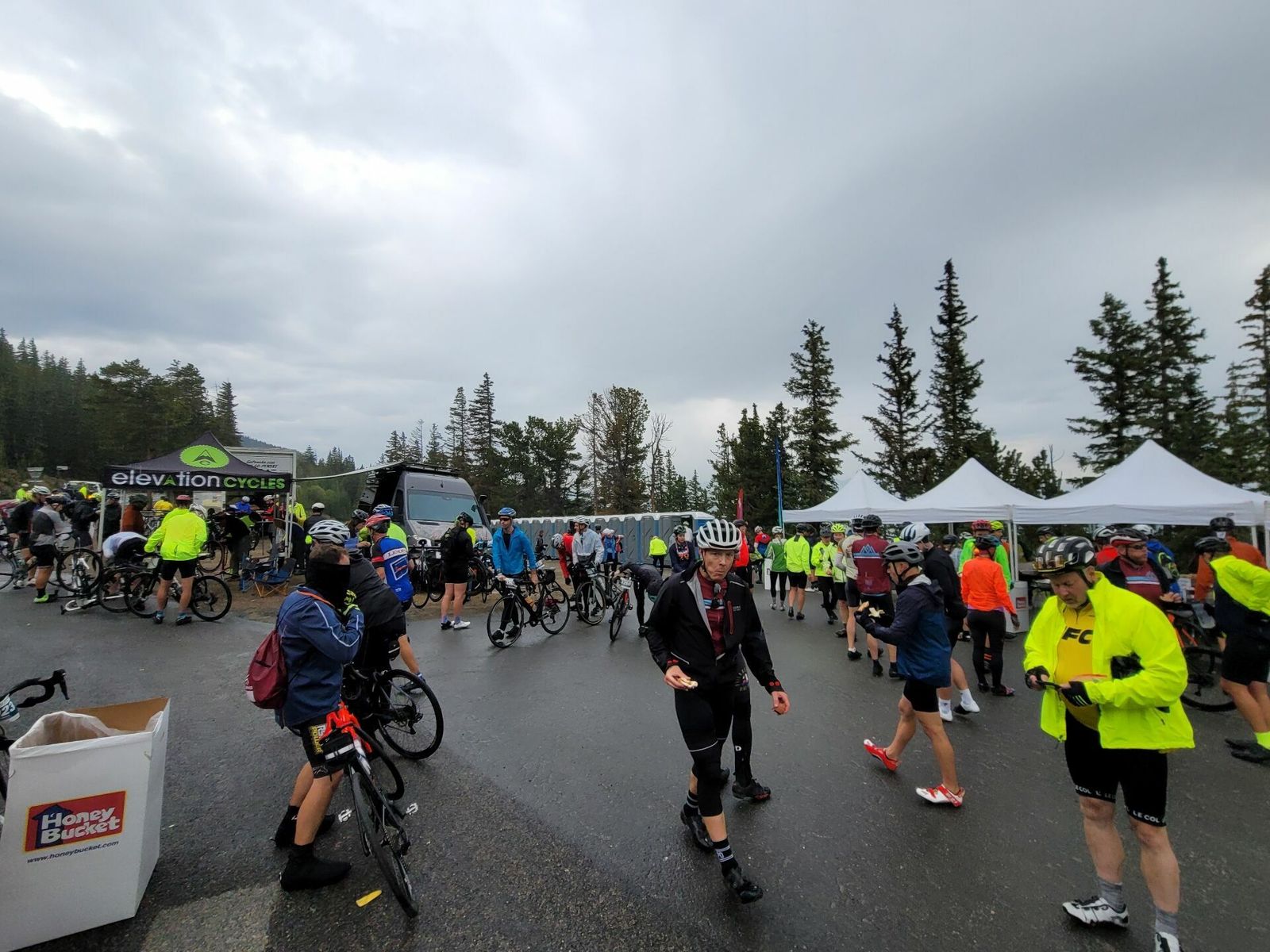 At Bakerville now. Roads dry here. Watch out for painted lines + rain = slippery. Not long to downhill!