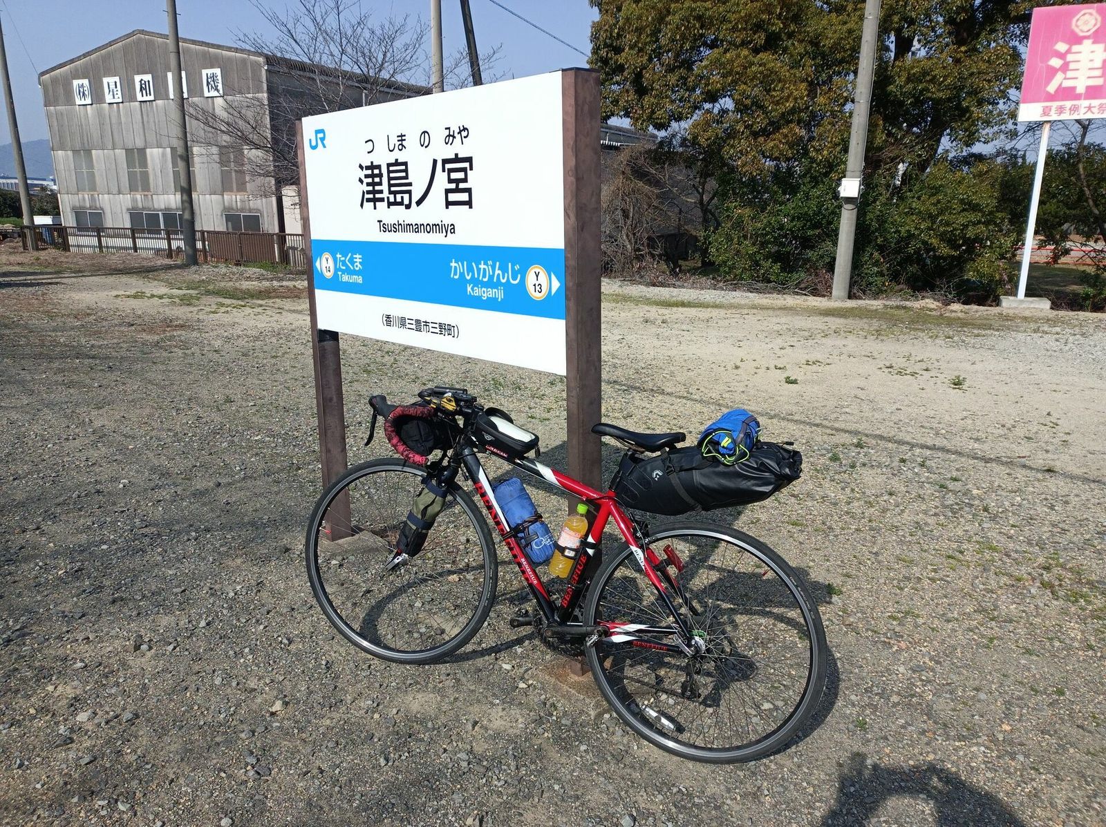 高松から今治まで、峠は2つくらいでそれほどの高低差はないが、県道161号で高松市と坂出市の境を越えるトンネルは、狭い上に長いので、自転車で通行するのはかなり恐怖を感じた。出来れば通らない方がよい。香川県内は道路沿いにセルフうどん屋が所々にあり、補給に好適だった。