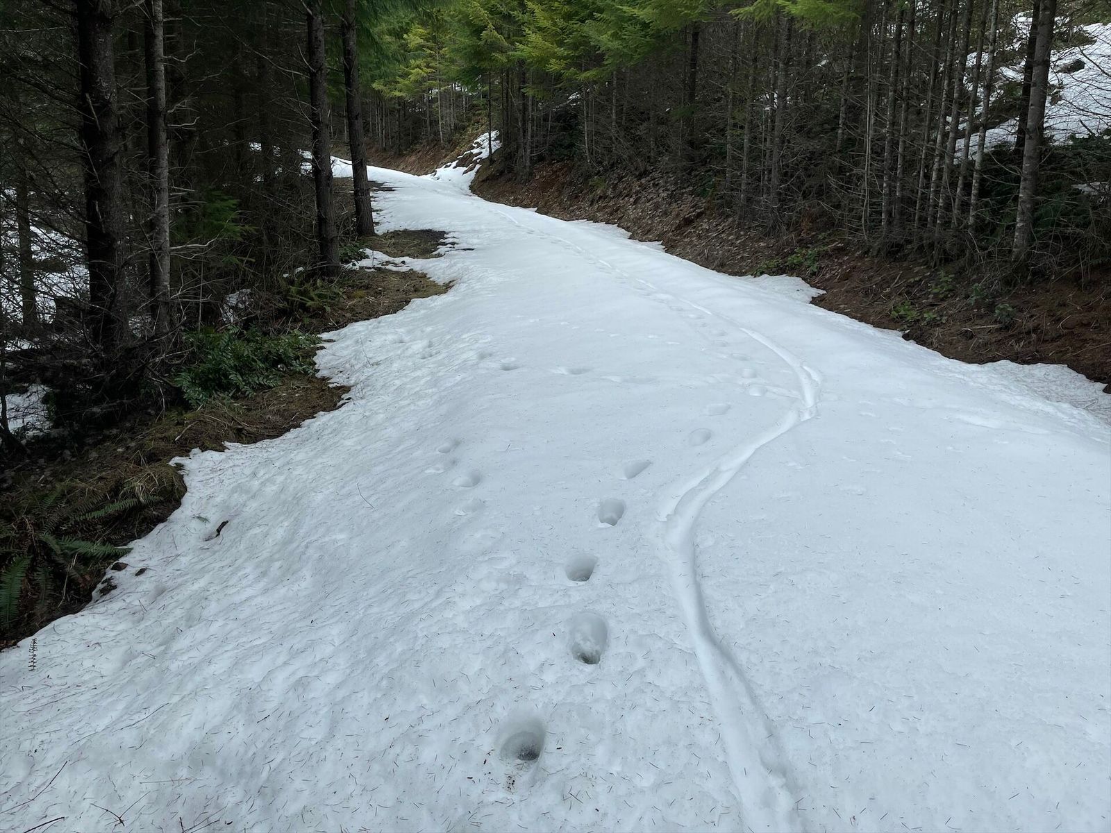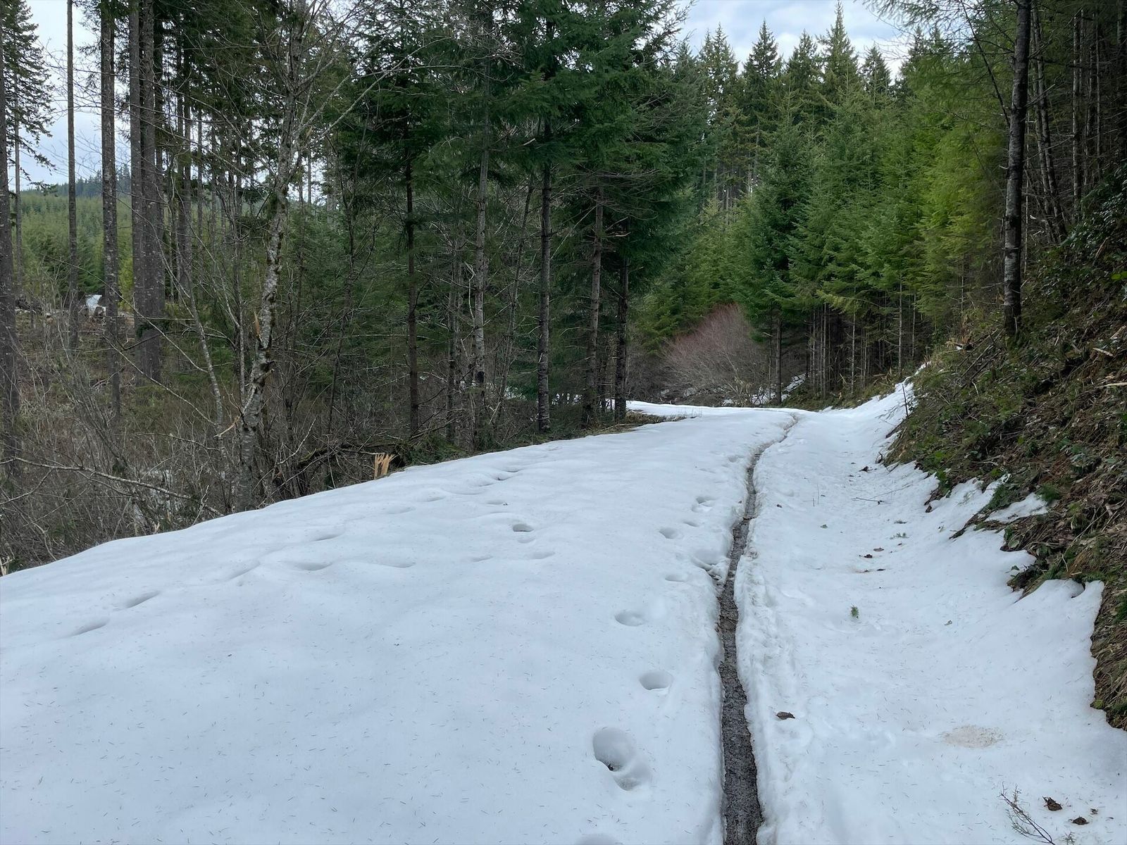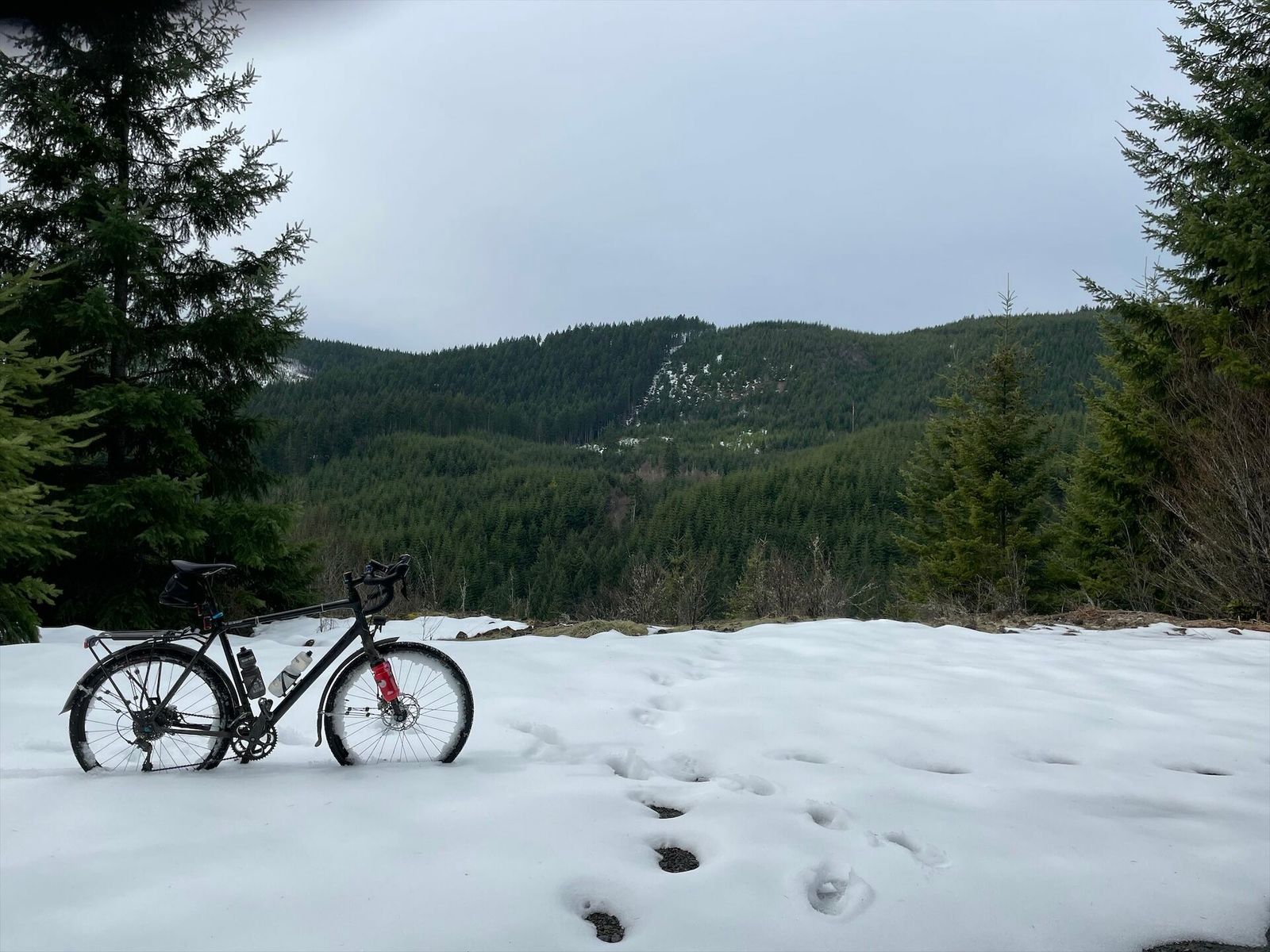 Quite a variety for today's finale. Picked up a great tow from the roadies heading out to Sauvie Island. Dutch Canyon is beautiful and I had planned to go over the top to Smoke Ranch, but a mile of snowy hike-a-bike convinced me to go back to Otto Miler. My rear derailleur cable snapped at the north end of Skyline, so I rolled it all the way home 2-speed style. Overall, it has been a fantastic week exploring this area.