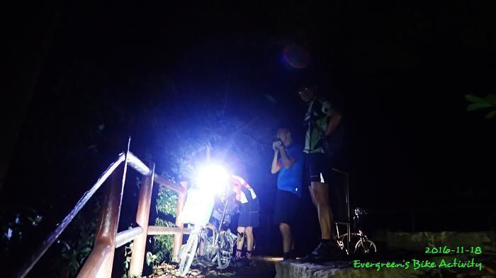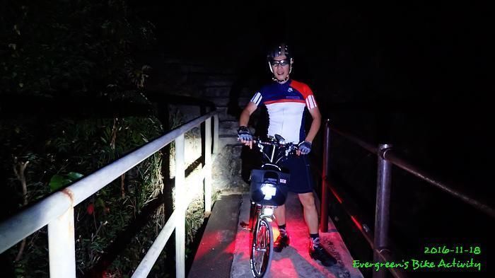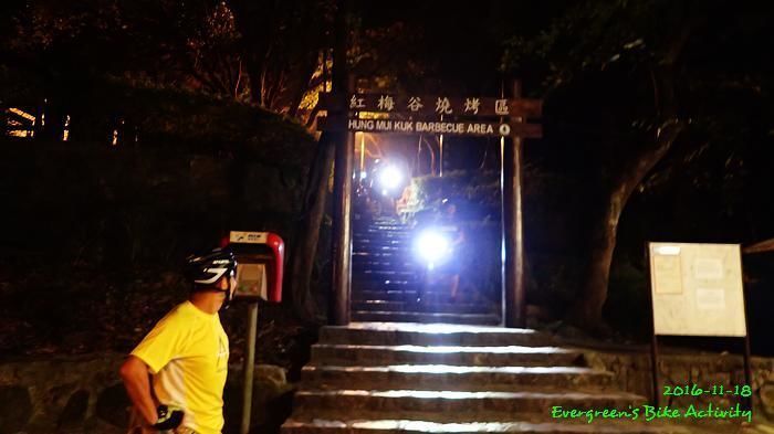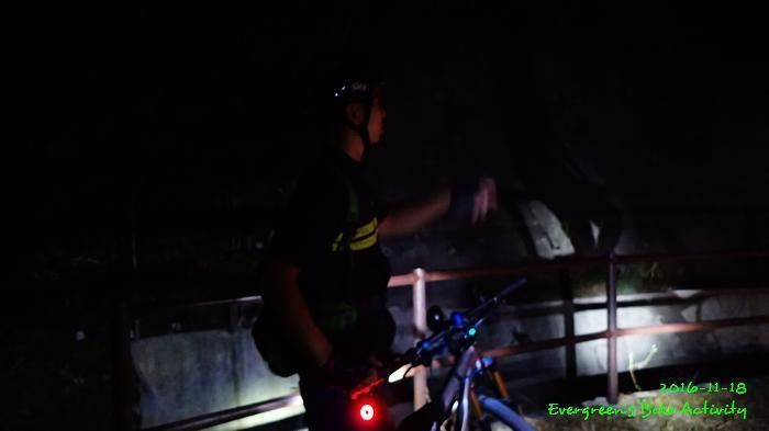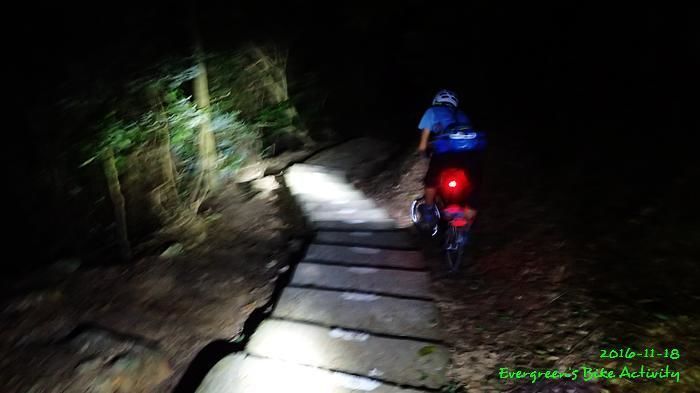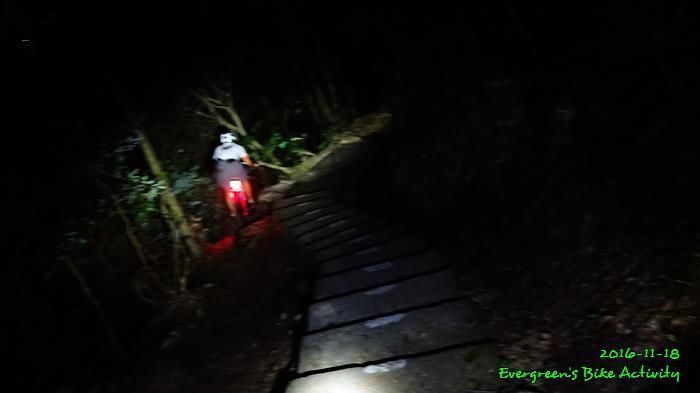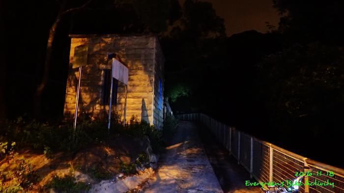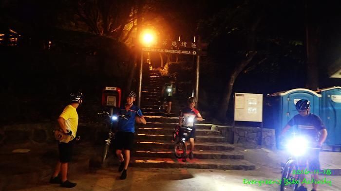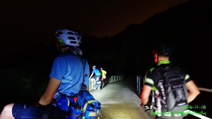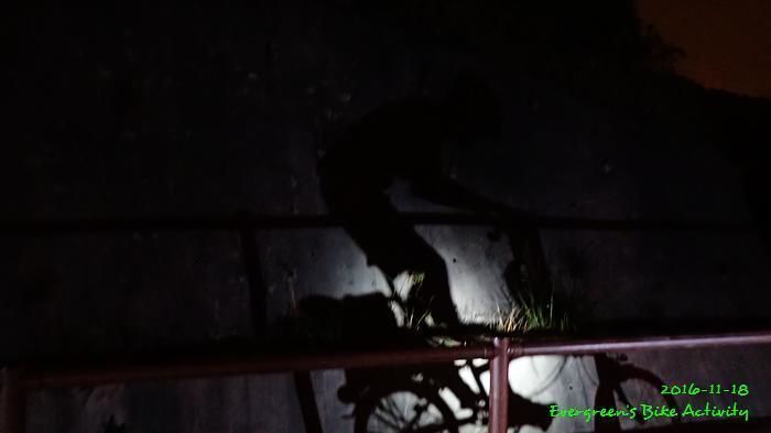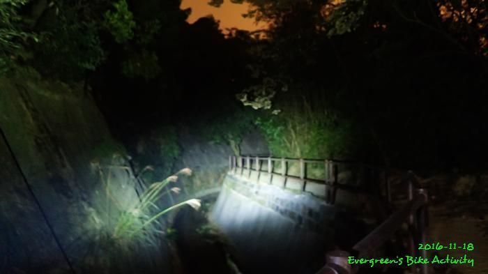 之後沿引水道騎行,因為環境太黑,大家又騎的太快,竟然騎到盡頭也沒見到落山的梯級,這只好往回騎,慢慢找尋。來回幾次,找到了計劃中落新田圍的路線。但係 Rocky 好有意見,認為落獅子山隧道公路的路線更好,我們討論了十幾分鐘,最後是跟他的意見;因為我沒踩過 Rocky 提供的路線,有新路線,我當然是踩沒踩過的。