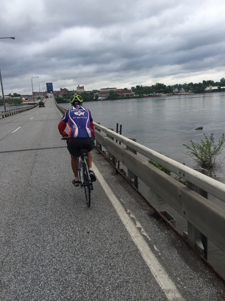 I am so, so happy to be out of Missouri! Three consecutive days of riding non-stop rolling hills is enough for me for the rest of this century. Today was a physically challenging day for me as my legs just did not have the energy they had earlier. I used a lot of energy the past two days climbing over all those Missouri rolling hills. I hope I can recover adequately for tomorrow's ride to Springfield. But it was energizing to ride across the Mississippi River and into the lovely city of Qunicy, IL. There are many outstanding homes on Maine (sic) street in Quincy. Illinois is our 8th state.