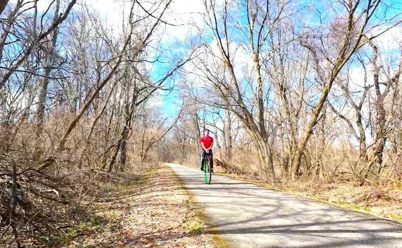 Trek Farley 9.6. Mostly sunny, beautiful day, a bit chilly - low 40's up to a high of 43, very windy @ 17-18 mph from the NW, so a stiff headwind the entire first half of the ride but a nice push on the way home. A few other cyclists out, including a unicycle and plenty of hikers.