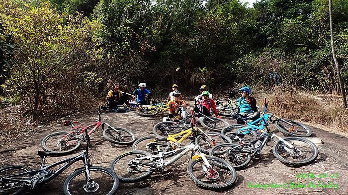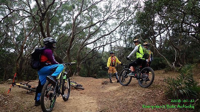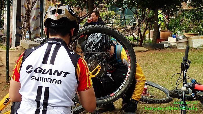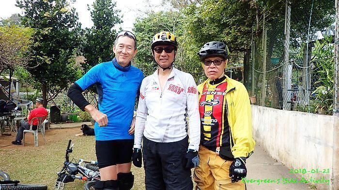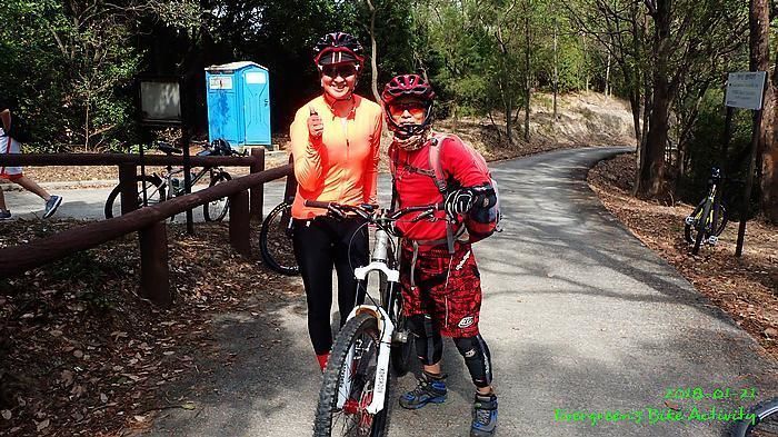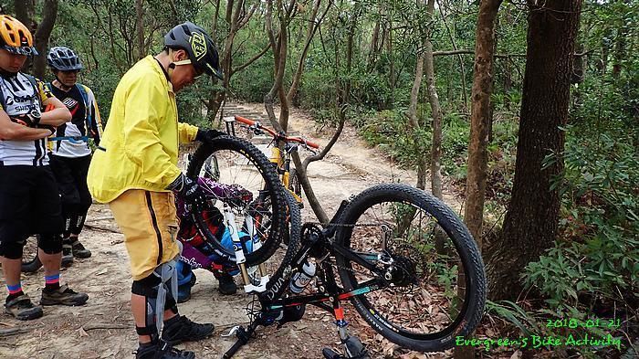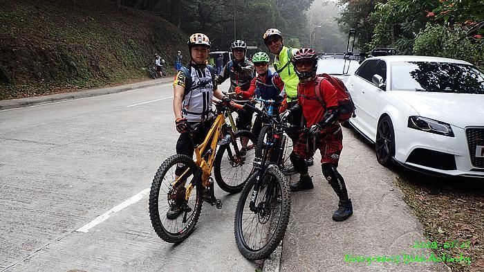 在越野路線出大欖林道前,我在最尾,並和偶遇的行山人士講了幾句關於膝痛問題。車友可能沒注意,繼續騎行,待我出林道後,不知要轉上或是落,兩個方向都來回踩過,也問了兩個方向的行山人士,兩邊都無結果;兩邊都說沒有見到一些騎越野單車的人。後來幸運的遇到一個從青龍頭騎車上來的車友,他說沒見過騎車的經過,我就決定向上騎行,果然踩到林道高處就見到車友,還遇到不越野的車友小佘與朋友。