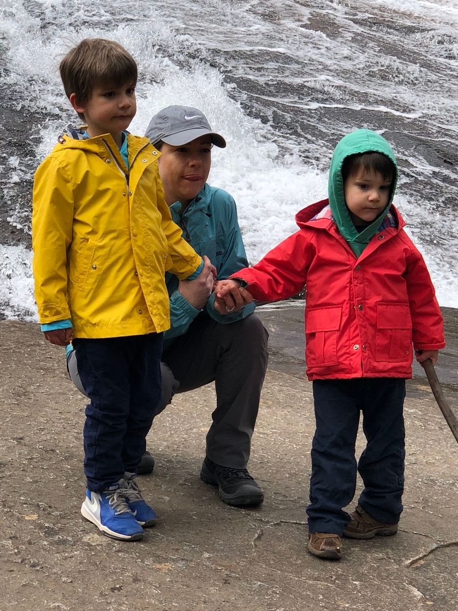 An Amazing Day hiking with Lauren and Sam and Nolan and Wes. The boys hiked 7 miles! Lauren carries Wes in her backpack several of the miles. We hiked out to Bridal Veil Falls from Fawn Lake Access. Later stopped at the Hub and then had dinner at Sol Y Luna and breakfast at Hendough on Sunday morning. Nolan met Mary Katherine and Hattie, Jill, Brian and Mary and we went to Appalchian Coffee Roaster for a preview and pizza at Melody’s Two Guys.