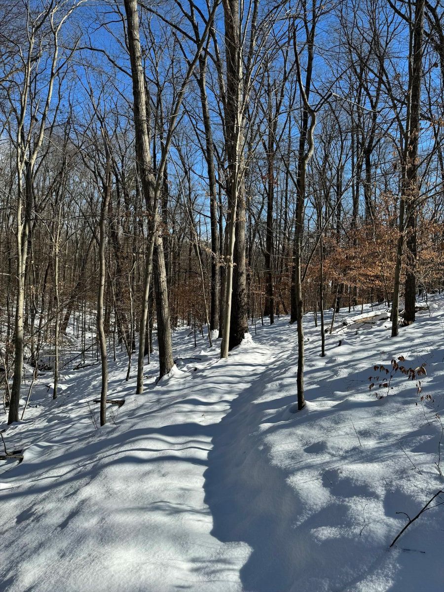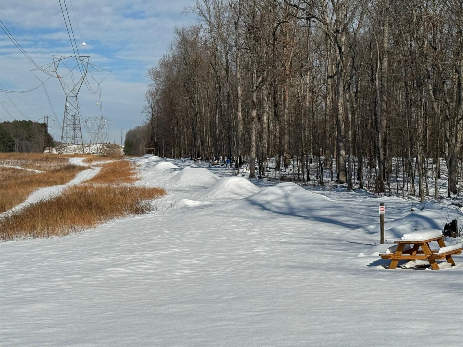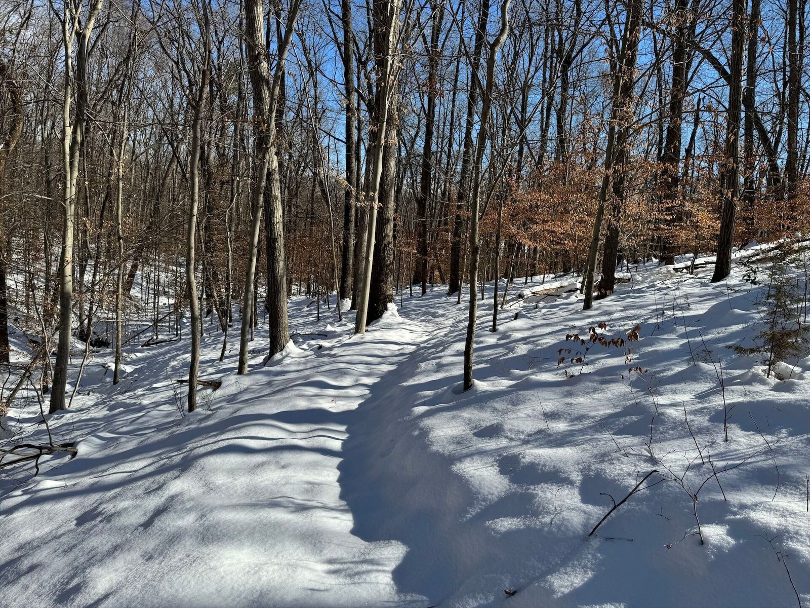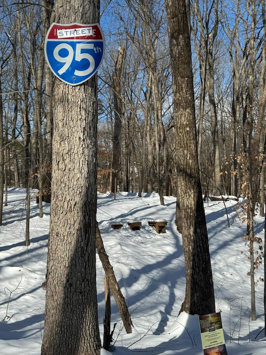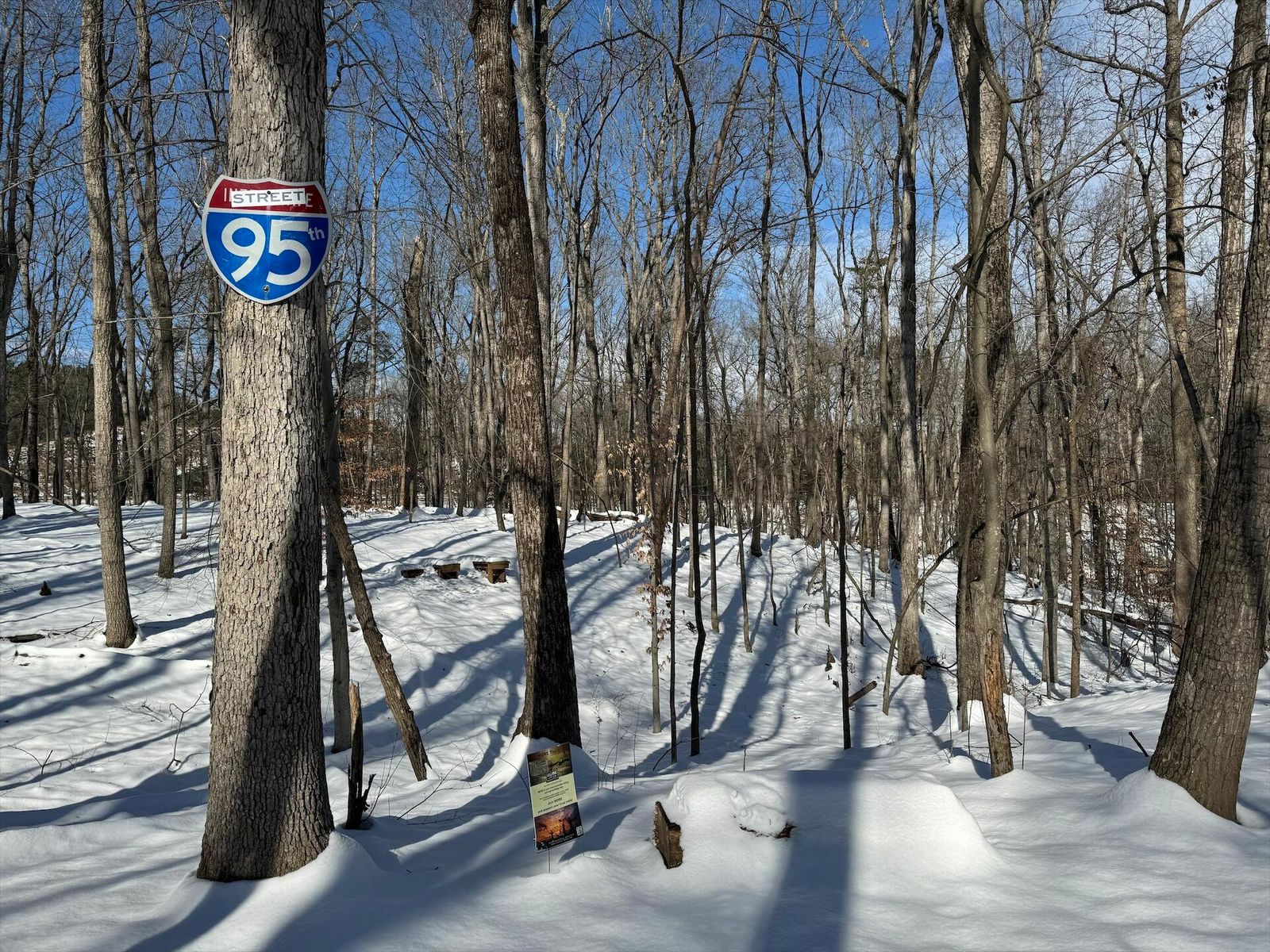 Glad we left a layer of leafs down, where it had melted through you can see them holding things tight. Some sections are still really deep. The power line and 95th street have tons on snow on them.