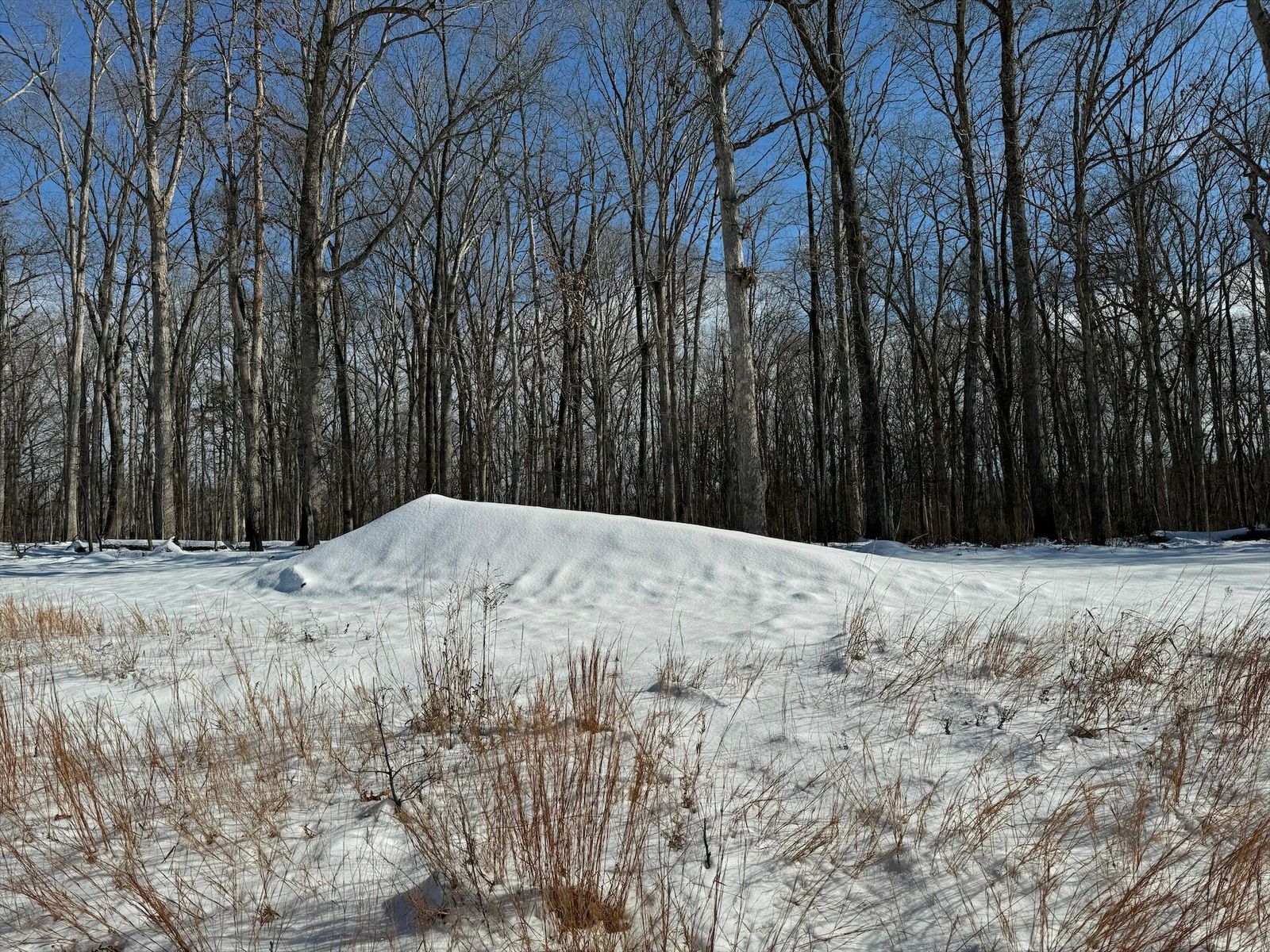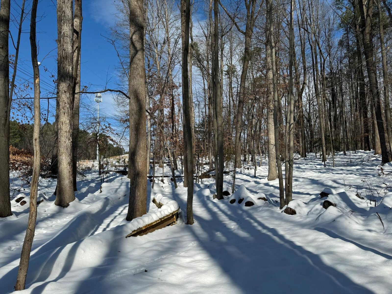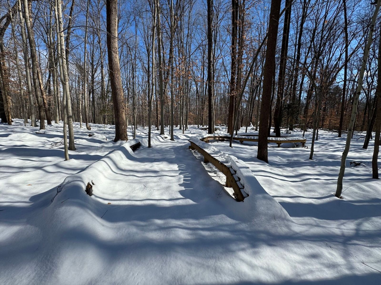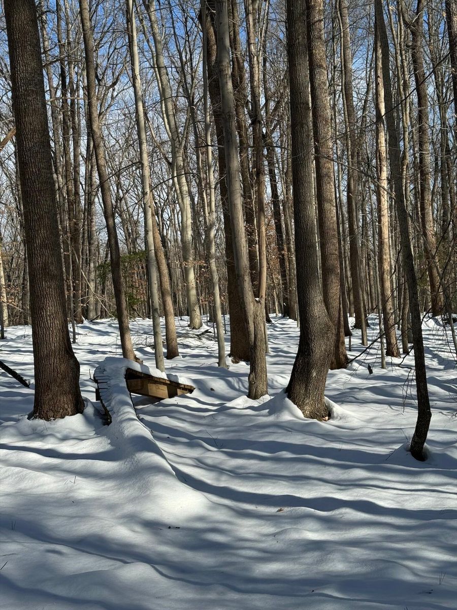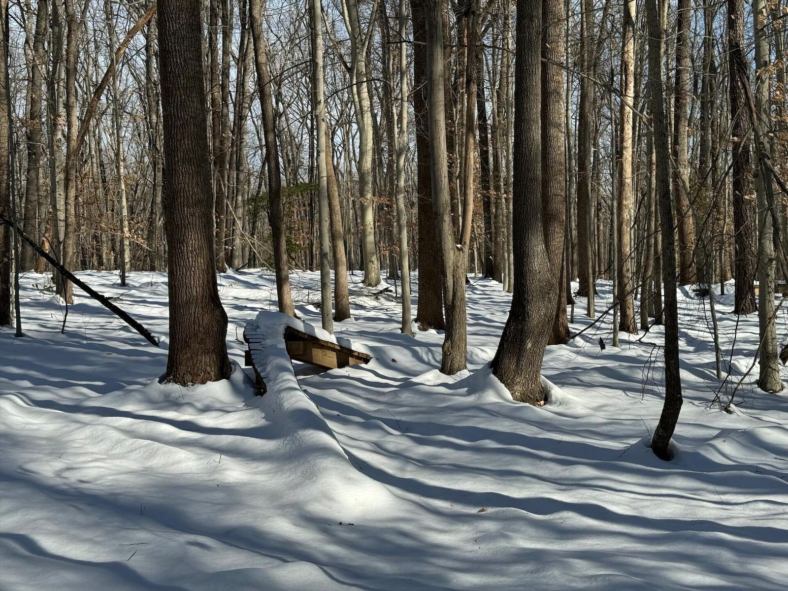 Glad we left a layer of leafs down, where it had melted through you can see them holding things tight. Some sections are still really deep. The power line and 95th street have tons on snow on them.