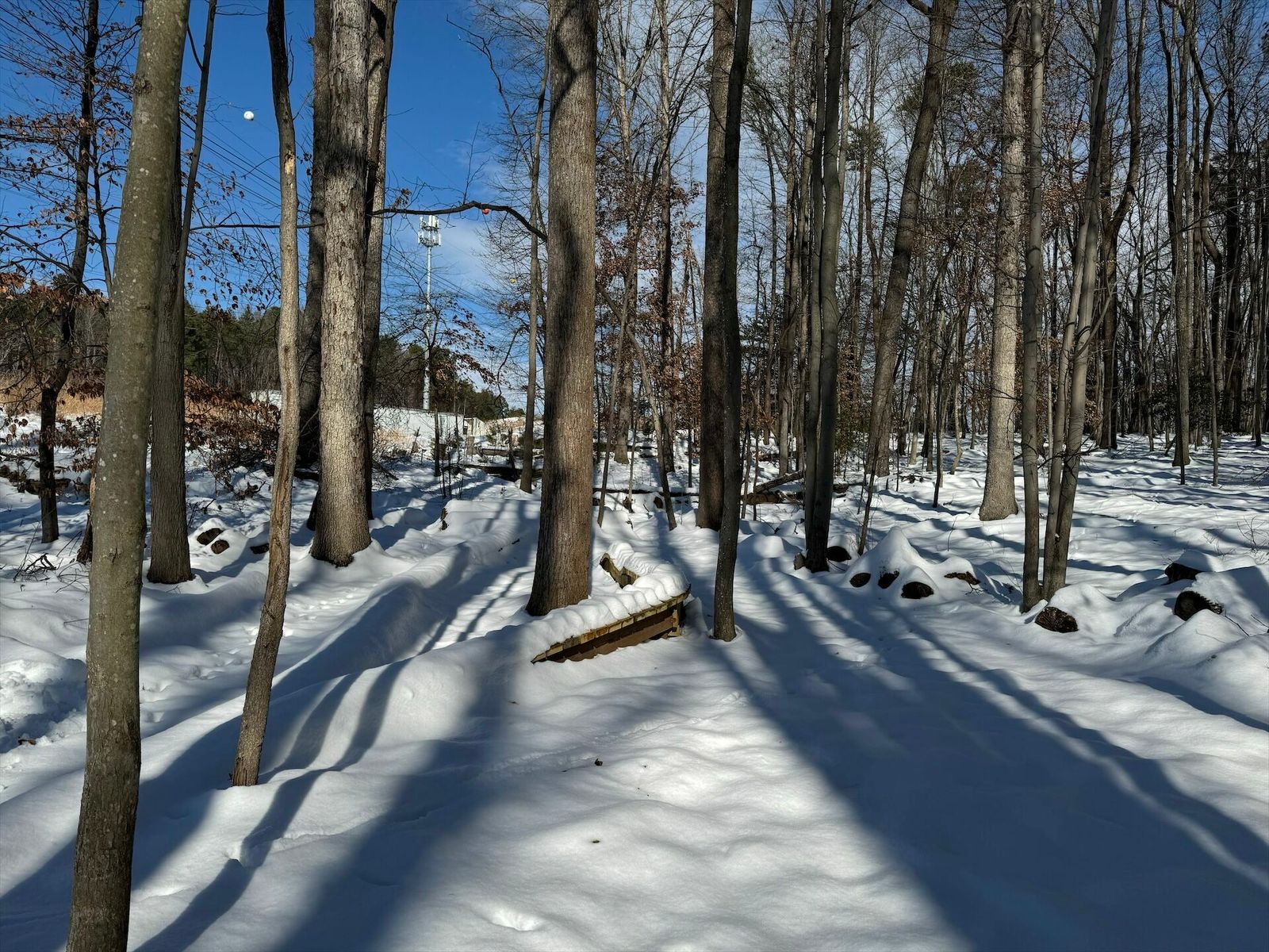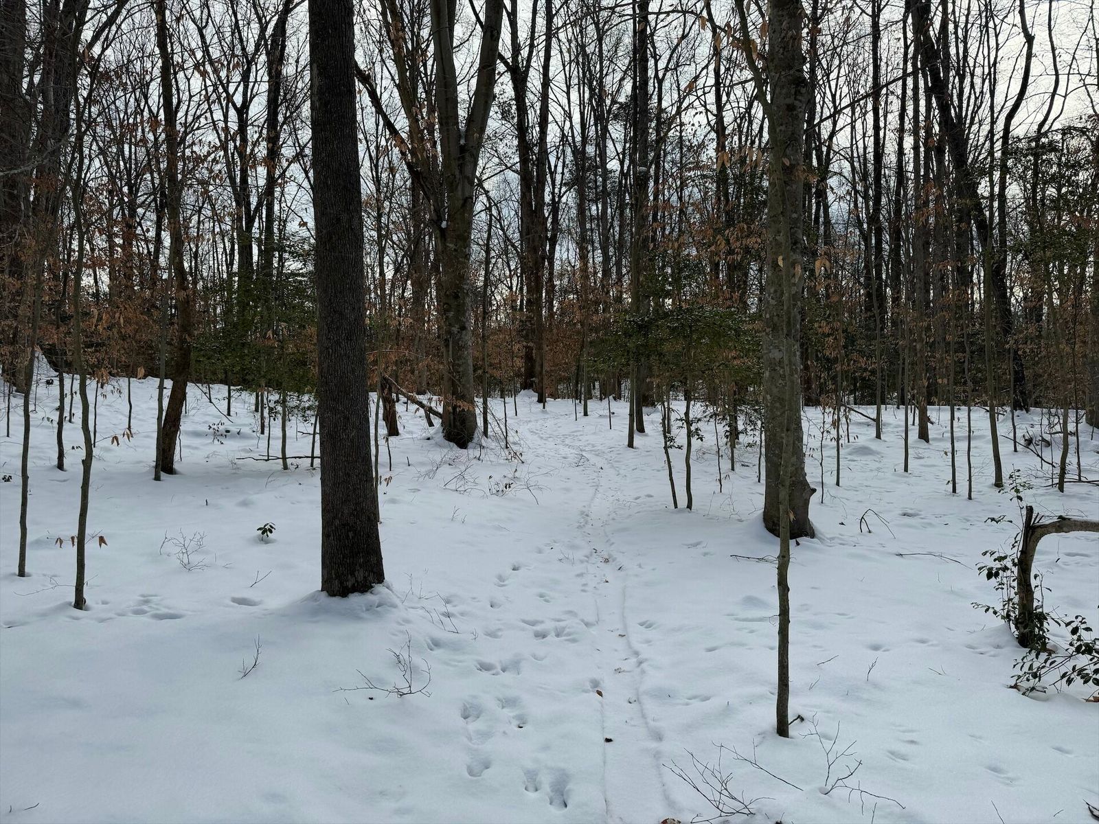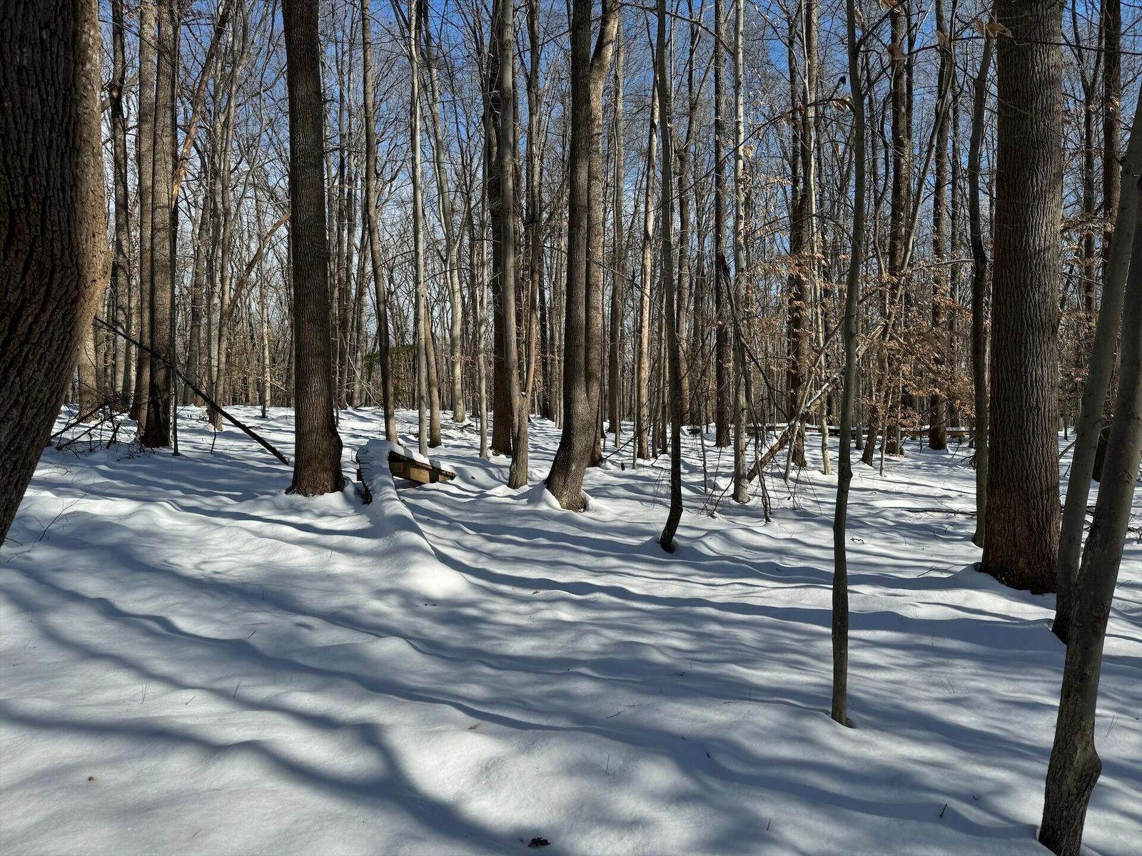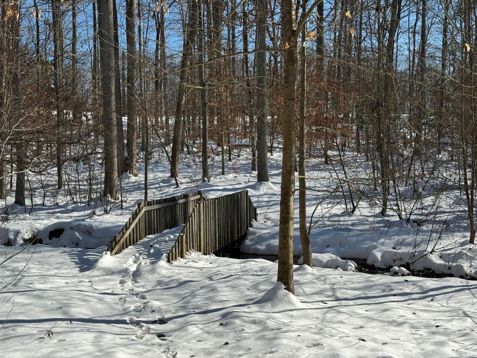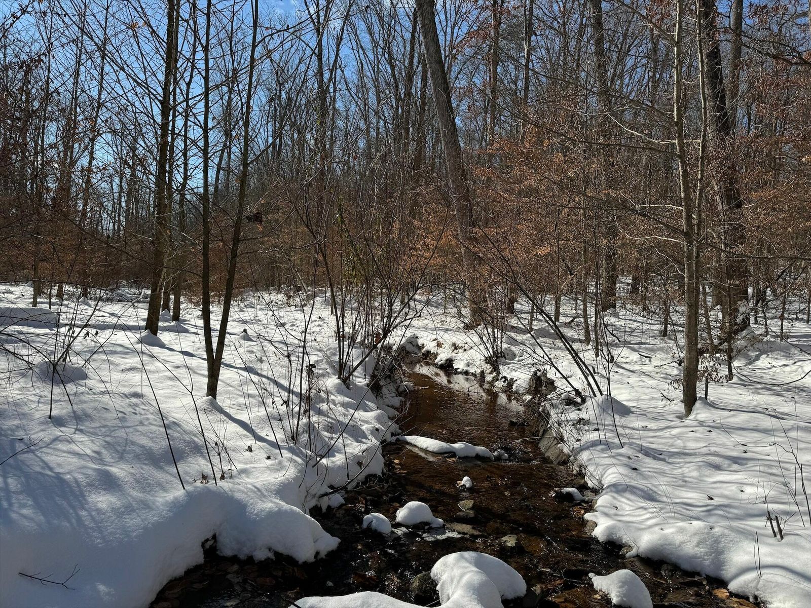 Glad we left a layer of leafs down, where it had melted through you can see them holding things tight. Some sections are still really deep. The power line and 95th street have tons on snow on them.