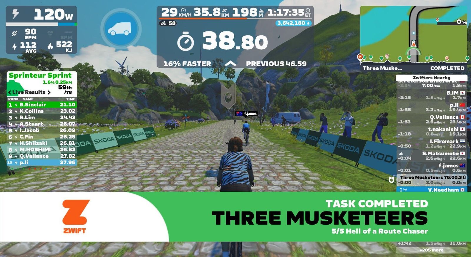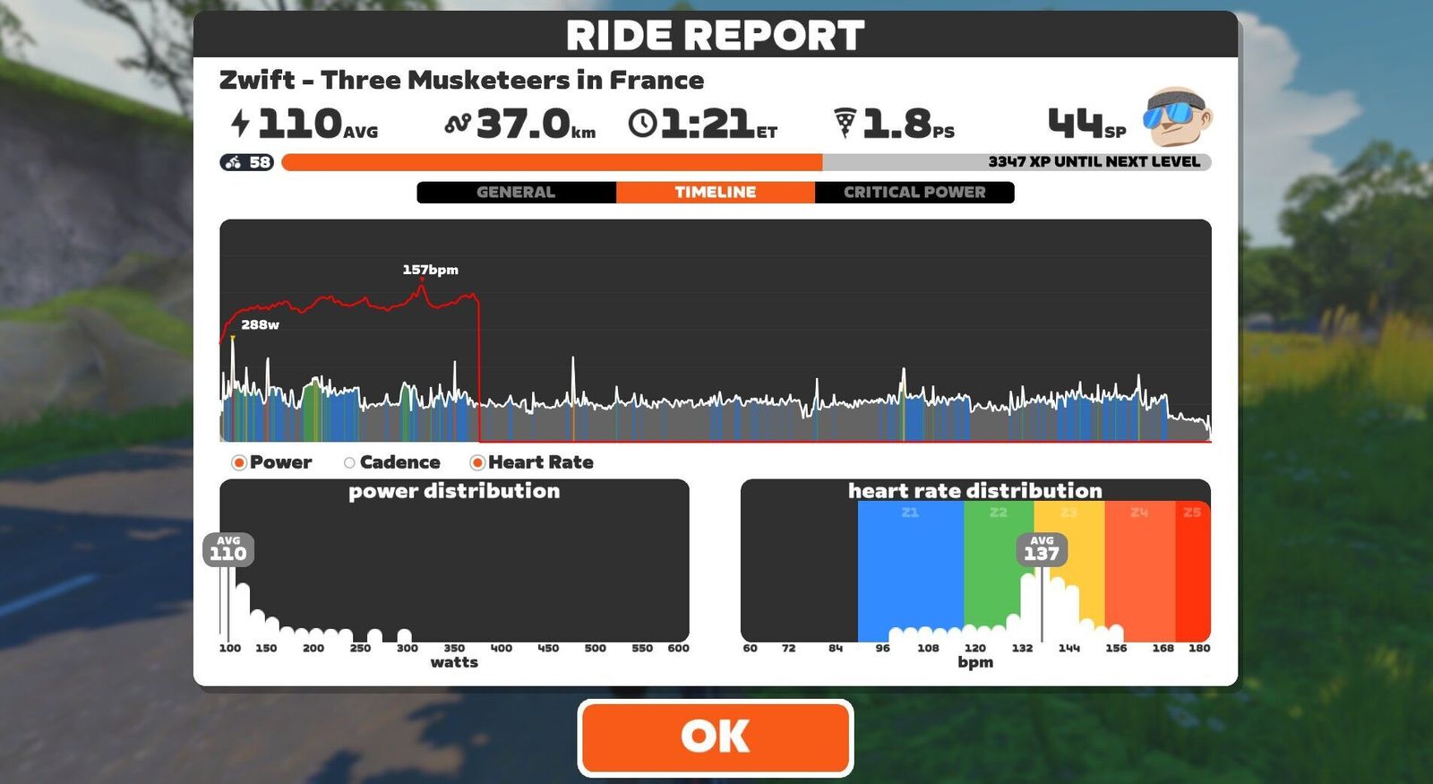 (Somehow my HRM data dropped out of the Zwift feed about a third of the way through this workout, so this data is from Garmin instead.) Getting back into the regular workout groove and setting some benchmarks tonight. I wanted about an hour long workout, France was a guest world (what with TdF around the corner) and I hadn't finished off the cobbled routes. The Three Musketeers let me do that, over about 35 km of flat French farmland. Got the route, finished the challenge and got to upgrade the Scott with some drillium. Famous B-sides from the 1980s as a playlist. Notably, Miss Joan Jett hates herself for loving me, and her energy perked me up to finish strong.