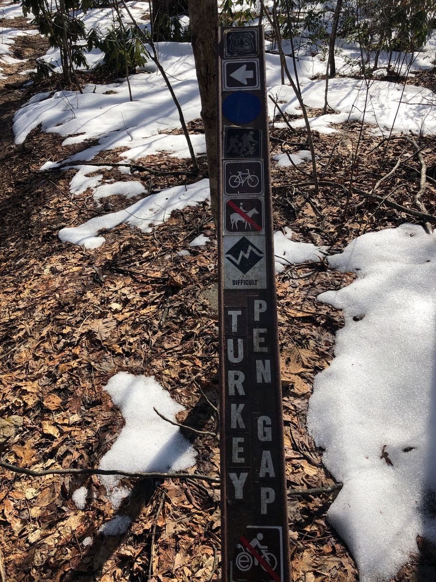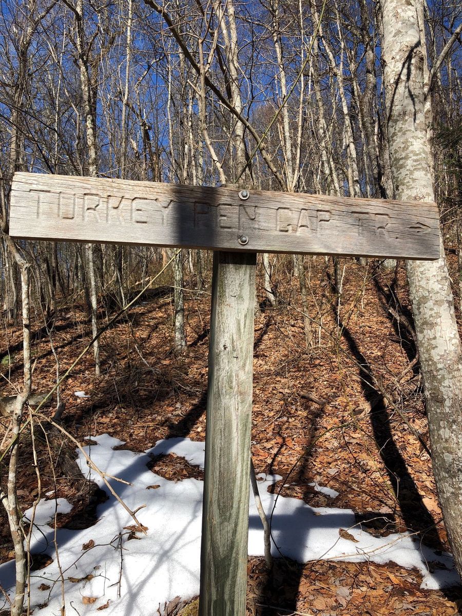 Turkey pen road off 280 is rough gravel but drivable in Chips 4 wheel RAV4. Parking lot after 2 miles is starting point for several trails. Turkey pen starts off with steep uphill followed by level breather. Mostly up all the way to Middle Black Mountain with some downhills and ridges along the way. Turkey Gap intersects with Wagon Gap but we continued straight on Turkey pen Ridge to Black Mountain Trail and bushwhacked off trail to Top of Black Mountain with sitting log and some views. Trail is good, only hazard is slippery leaves.