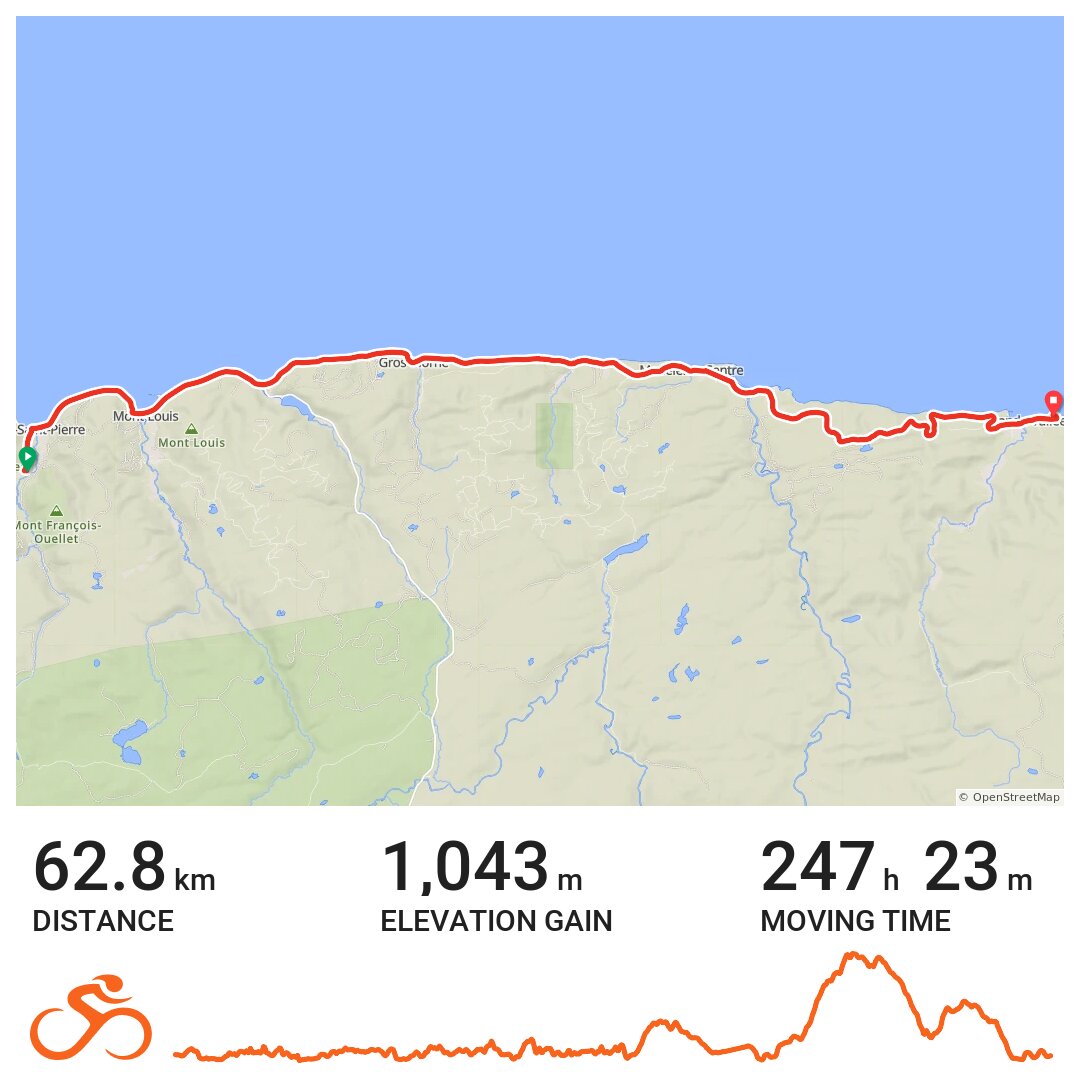 This ride is along the coast en Haute-Gaspesie. The nastiest hill is found in a place called Sainte-Madeleine-de-la-Riviere-Madeleine. It reminded us very much of another challenging hill, North Mountain, in Cape Breton Highland National Park.