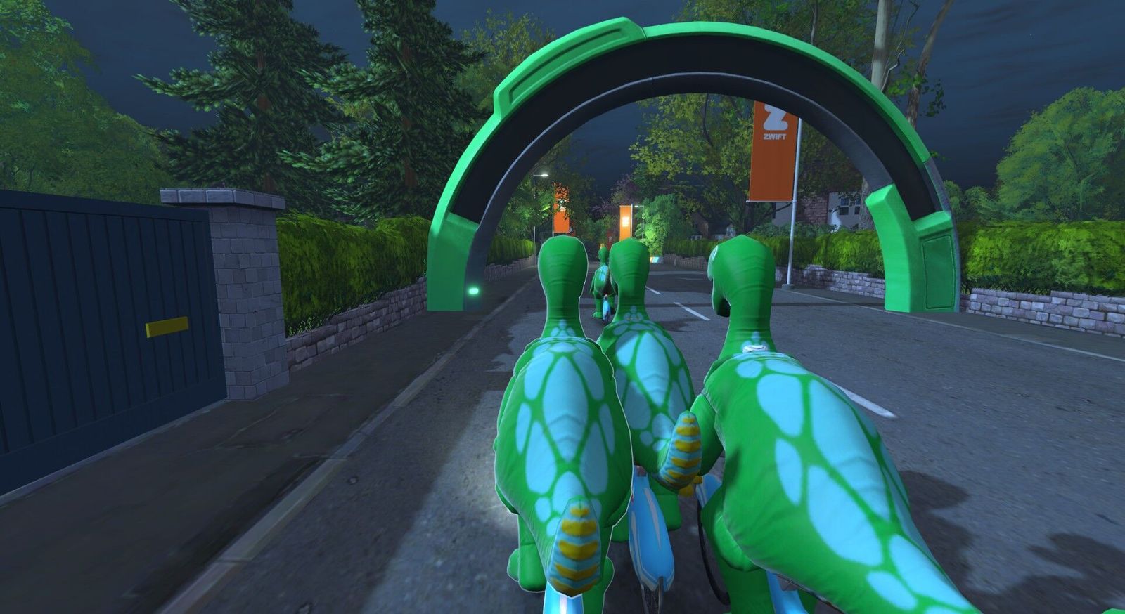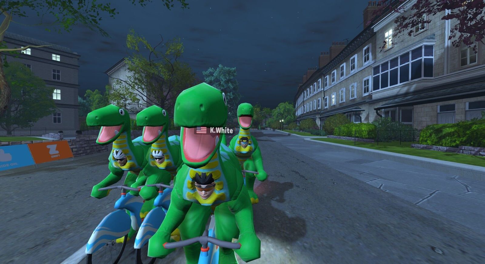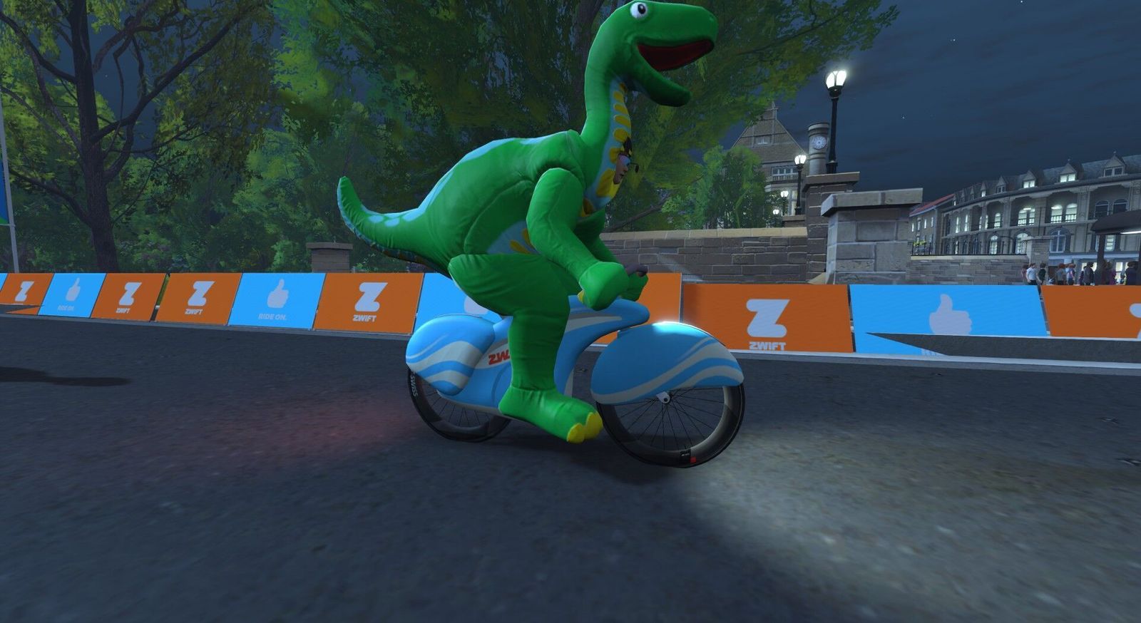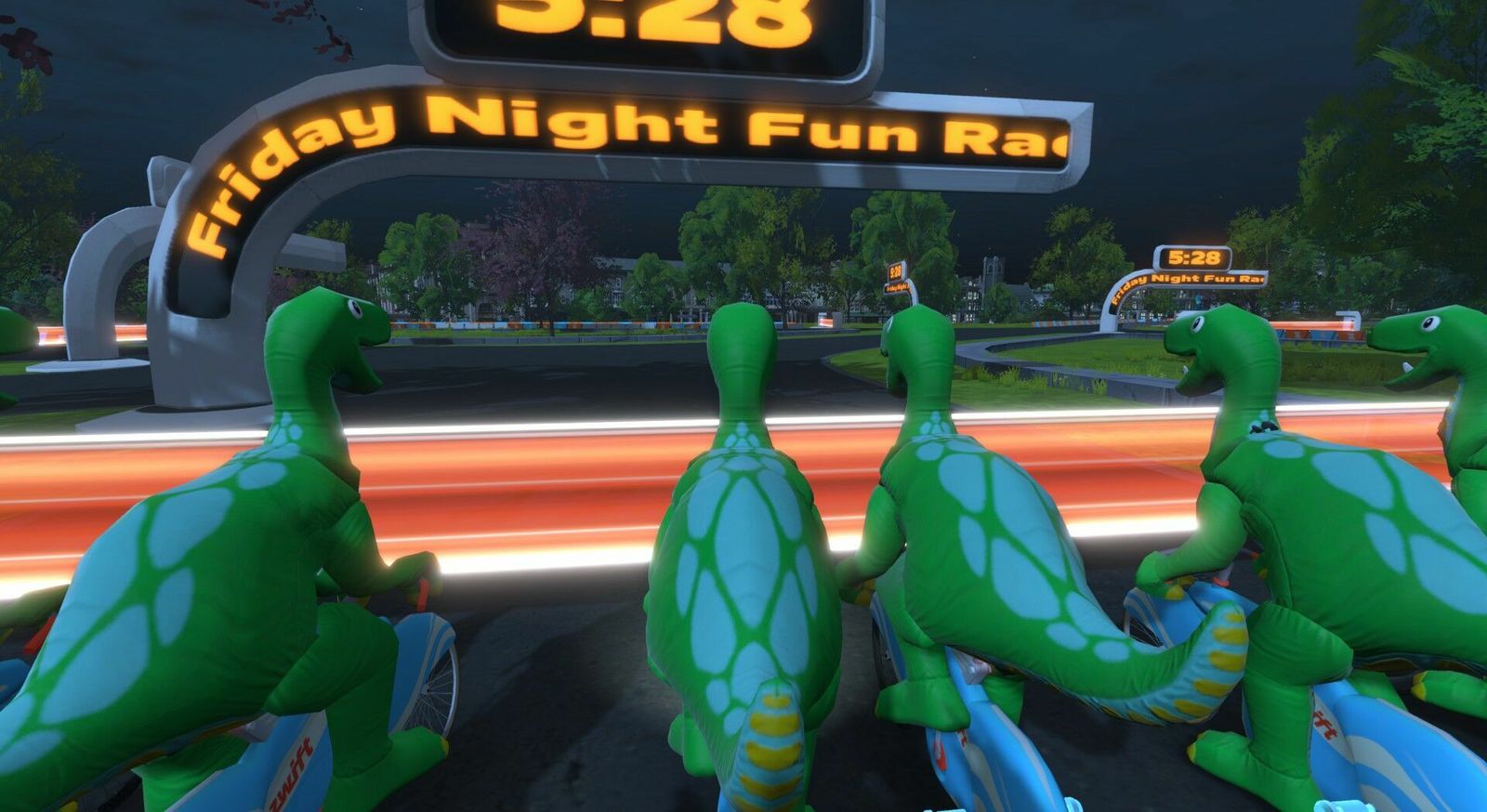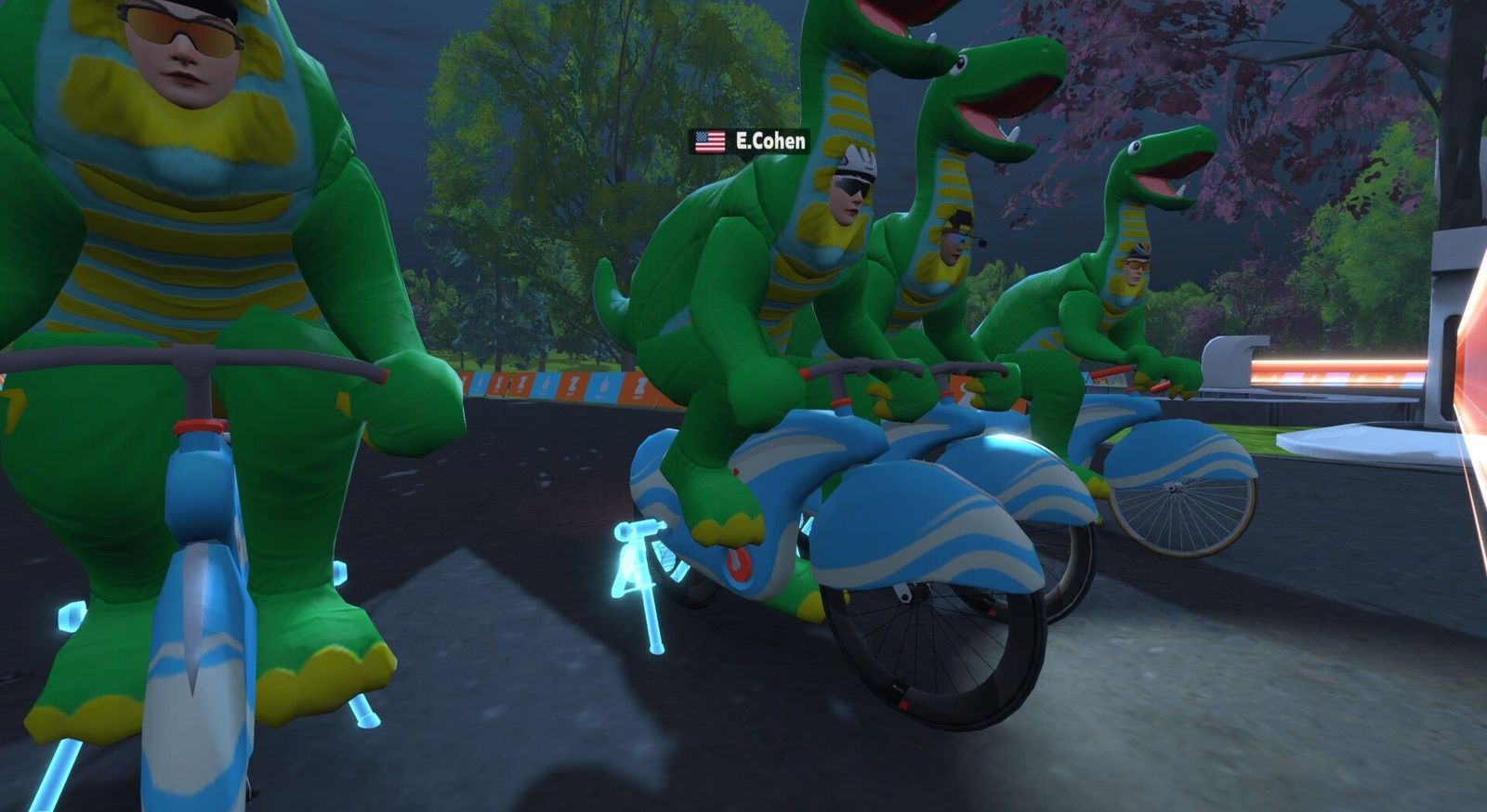 If the dinosaurs had tamed the atom and diverted the asteroid, we'd all be dinos riding around on atomic bikes... Except, er, we are! The previous Friday Fun Race we rode carbon fiber Big Wheels; tonight we're back in dino costume but on the Atomic Bikes. Five of us were competitive tonight. I made the podium: third in-game and second in Zwift Power. I posted 2.1w/kg or 150w average there, 20 seconds down from the winner and 11 seconds behind the in-game second place. Appropriately for our Atomic Bikes, the Pointer Sisters sang the "Neutron Dance" on my 80s Film Classics playlist.