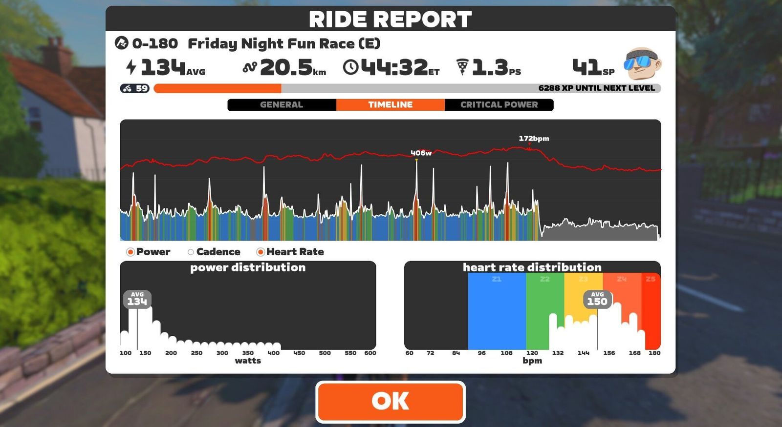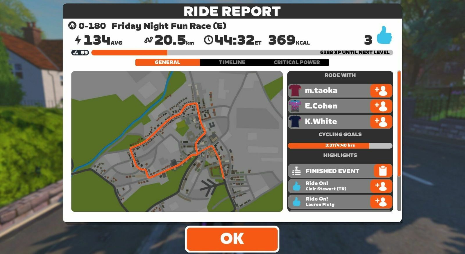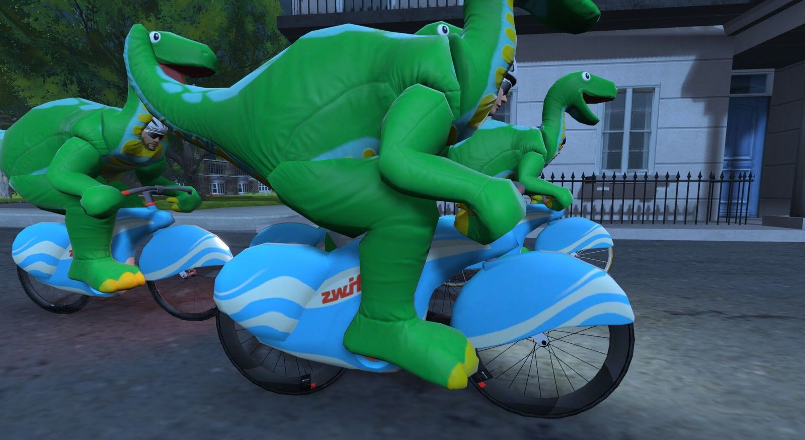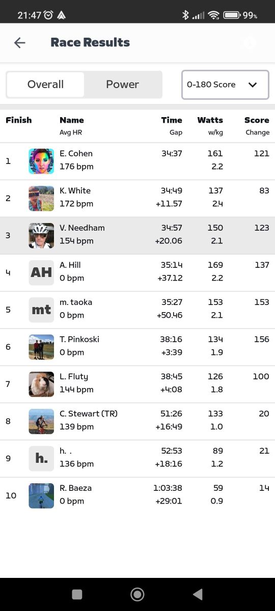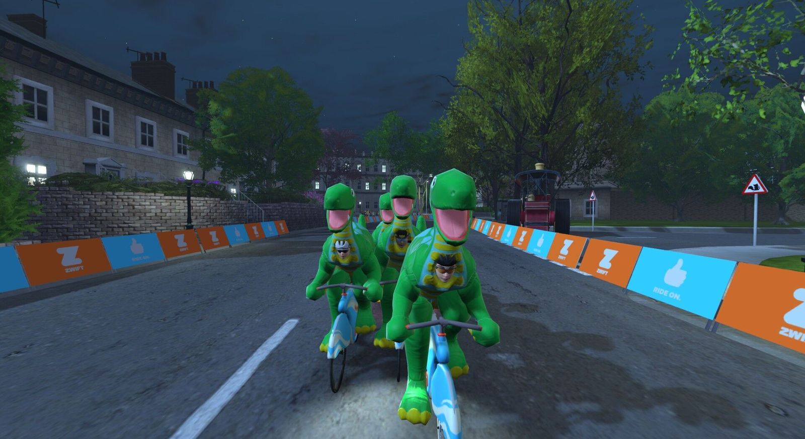 If the dinosaurs had tamed the atom and diverted the asteroid, we'd all be dinos riding around on atomic bikes... Except, er, we are! The previous Friday Fun Race we rode carbon fiber Big Wheels; tonight we're back in dino costume but on the Atomic Bikes. Five of us were competitive tonight. I made the podium: third in-game and second in Zwift Power. I posted 2.1w/kg or 150w average there, 20 seconds down from the winner and 11 seconds behind the in-game second place. Appropriately for our Atomic Bikes, the Pointer Sisters sang the "Neutron Dance" on my 80s Film Classics playlist.