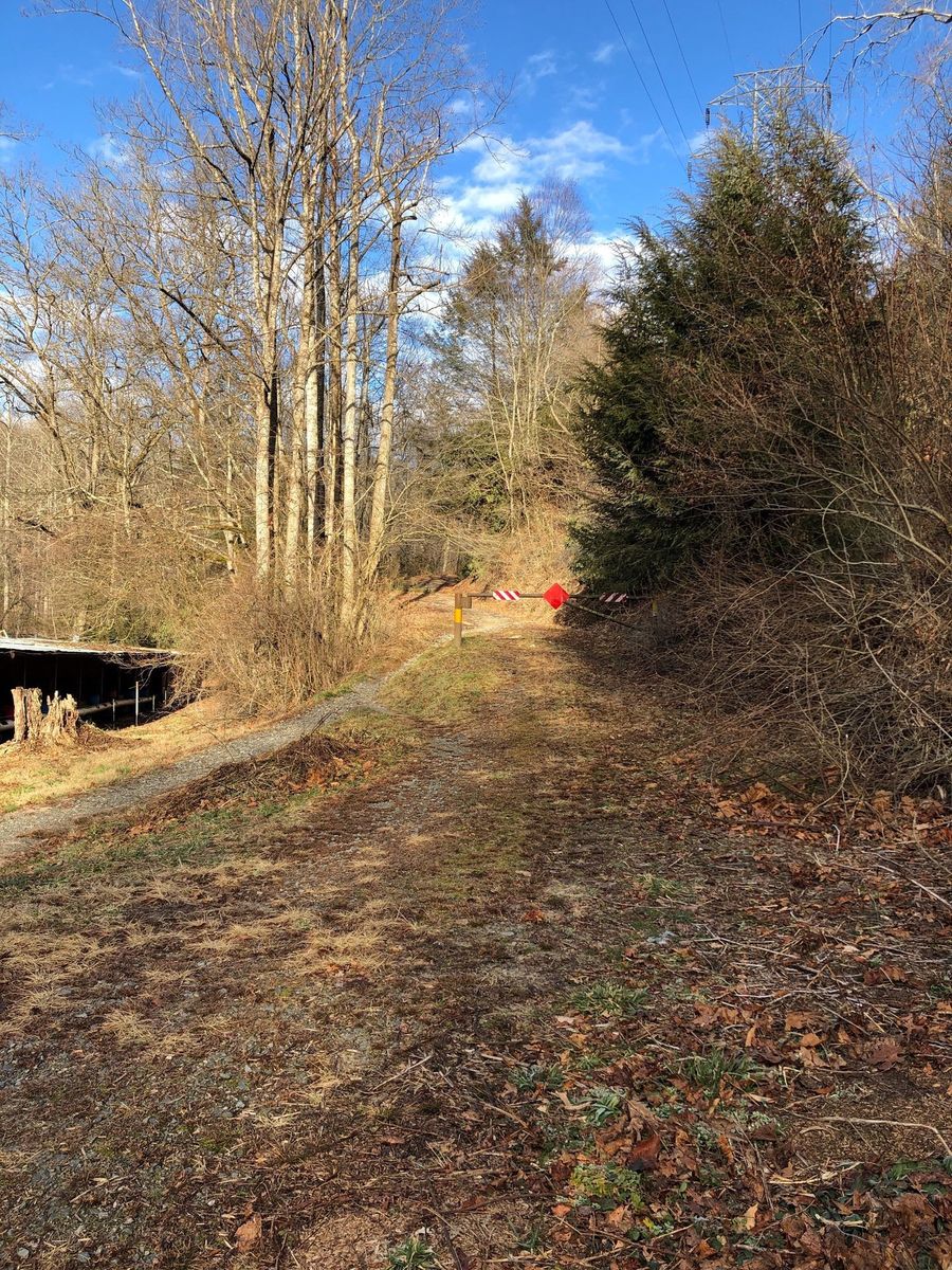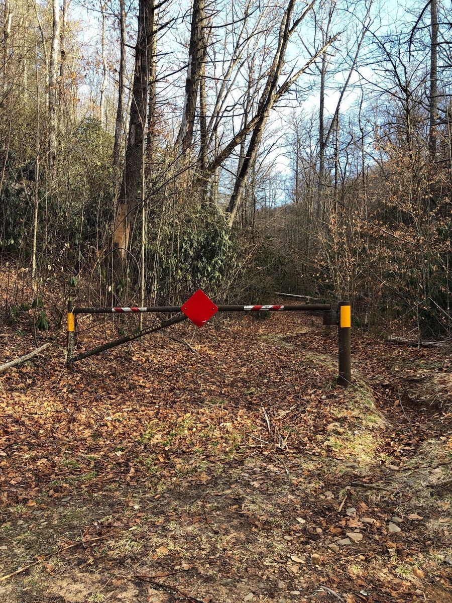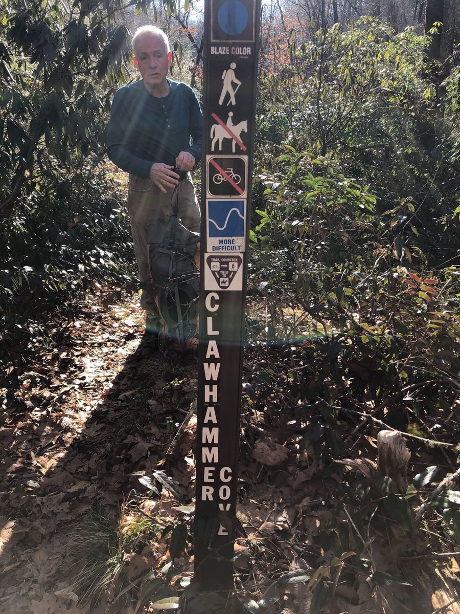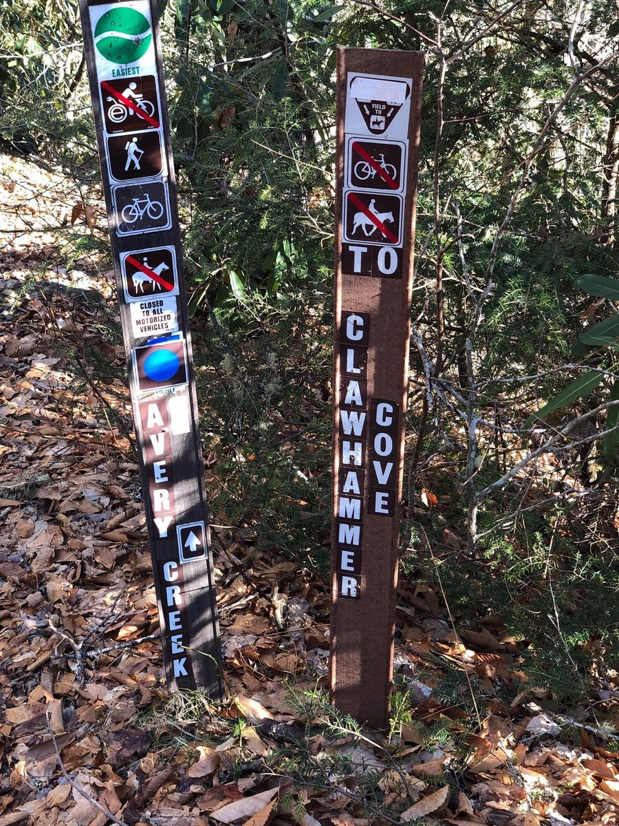 Pisgah Forest from Lower Avery Road. Avery creek trail juts off to the right off Avery Creek Road. The sign says Avery to Clawhammer and this is the trail to take. Also the point where Clawhammer breaks off from Avery is a log bridge across Avery Creek but it is further down the trail than was indicated on the route and trail was blocked by fallen tree. Instead of going up to Black Mountain Vista we continued straight on Turkey Creek Road to the creek. The osm map trail ends but the road, leafy and overgrown, does continue past the creek wher we had lunch.