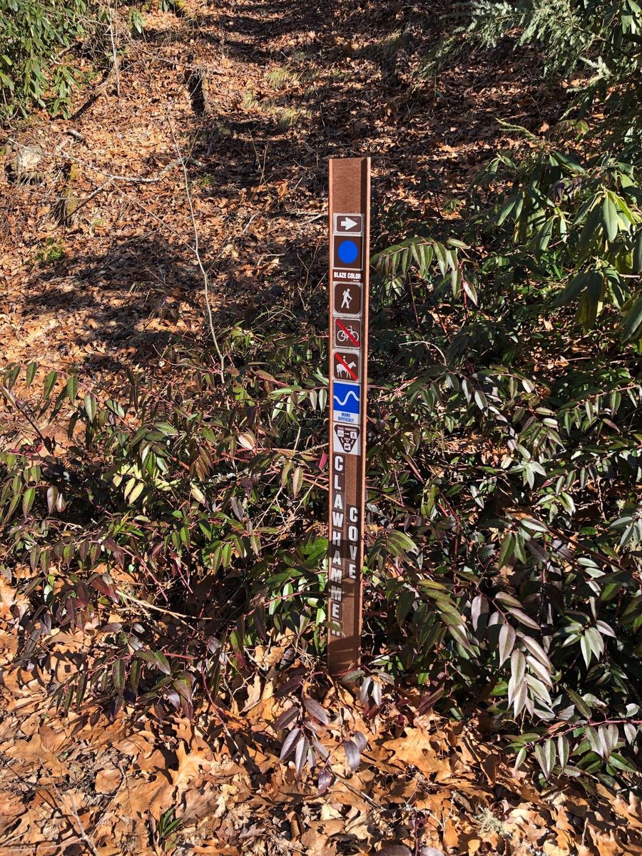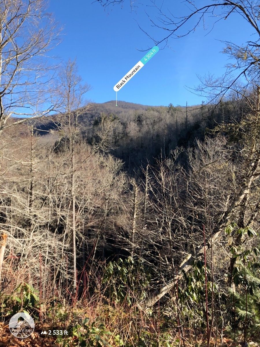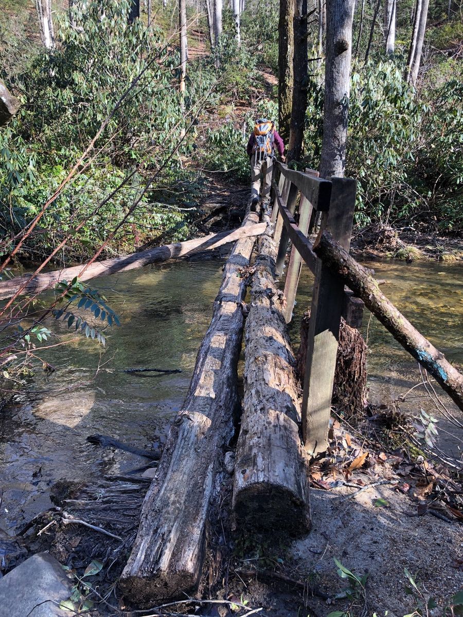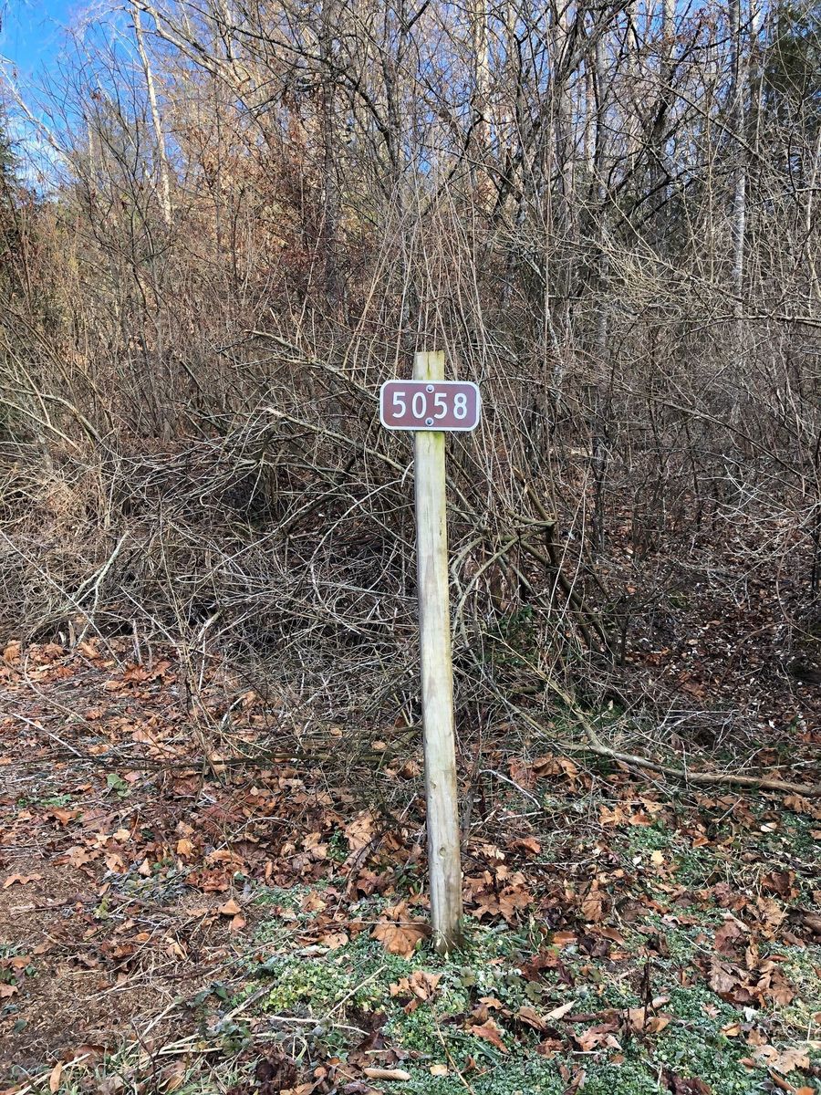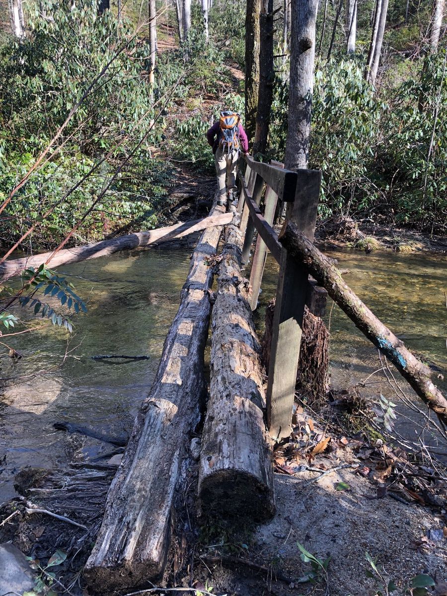 Pisgah Forest from Lower Avery Road. Avery creek trail juts off to the right off Avery Creek Road. The sign says Avery to Clawhammer and this is the trail to take. Also the point where Clawhammer breaks off from Avery is a log bridge across Avery Creek but it is further down the trail than was indicated on the route and trail was blocked by fallen tree. Instead of going up to Black Mountain Vista we continued straight on Turkey Creek Road to the creek. The osm map trail ends but the road, leafy and overgrown, does continue past the creek wher we had lunch.