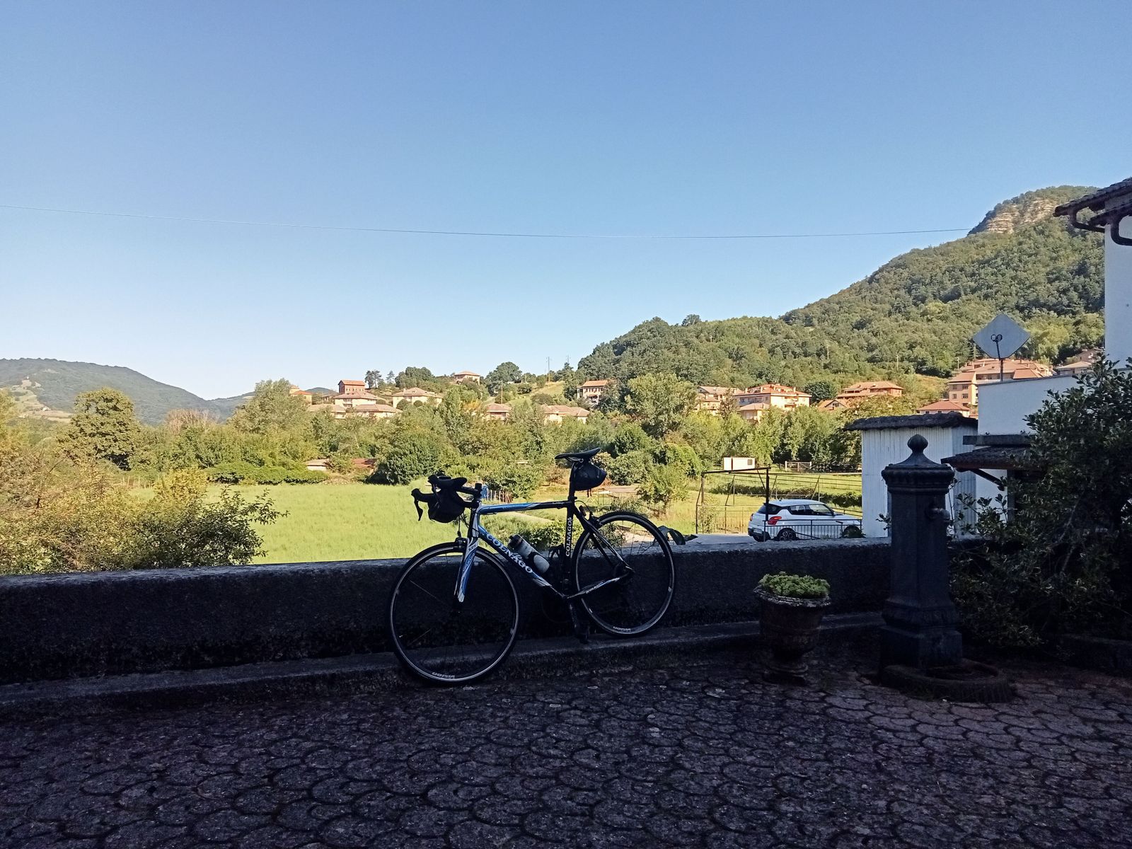 Vado avanti tra sberle e imprecazioni fino al bivio per Borgoadorno, due tornanti per salire al piazzale dell’omonimo castello, ma c’è una stradina che mi ha sempre incuriosito e questa volta l’ho inserita nel giro. Si dirama da un tornante, all’inizio asfaltata, larga poco più di un metro e mezzo, passando sotto al castello raggiunge ed attraversa la frazione Cavaldi; quattro case che paiono abbandonate, e la strada sempre stretta, cede l’asfalto ad un getto di cemento con i tipici segni obliqui di una rampa di garage. Proseguo su questo fondo strano, non proprio livellato a dovere, la pendenza è quasi proibitiva, salgo ugualmente stringendo mani e denti, fino ad una griglia di scolo trasversale, dopo la quale si vede a occhio che la rampa di garage si impenna, e il buon senso mi consiglia di scendere dalla bici fin che posso e spingerla a piedi fino ad un punto meno impennato. Scivolo cui tacchetti su quel cemento che ora sembra più levigato di prima, uso i tagli trasversali per non perdere aderenza, tre minuti dove Garmin non registra e appena posso risalgo in bici.