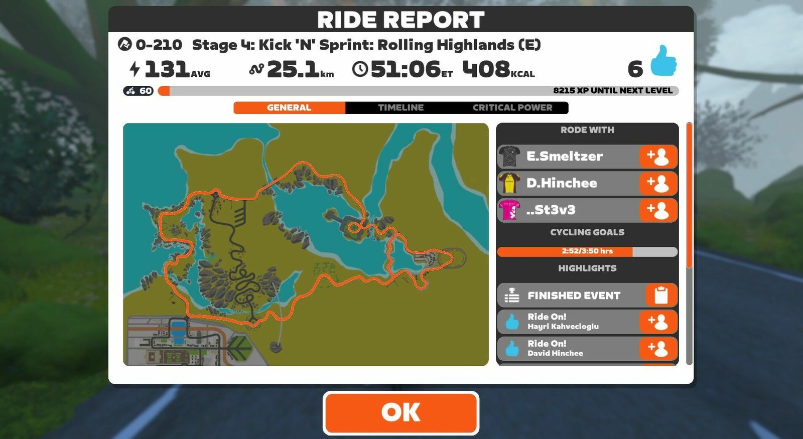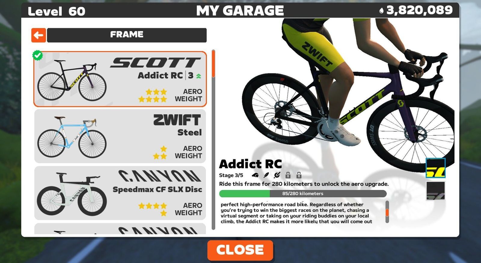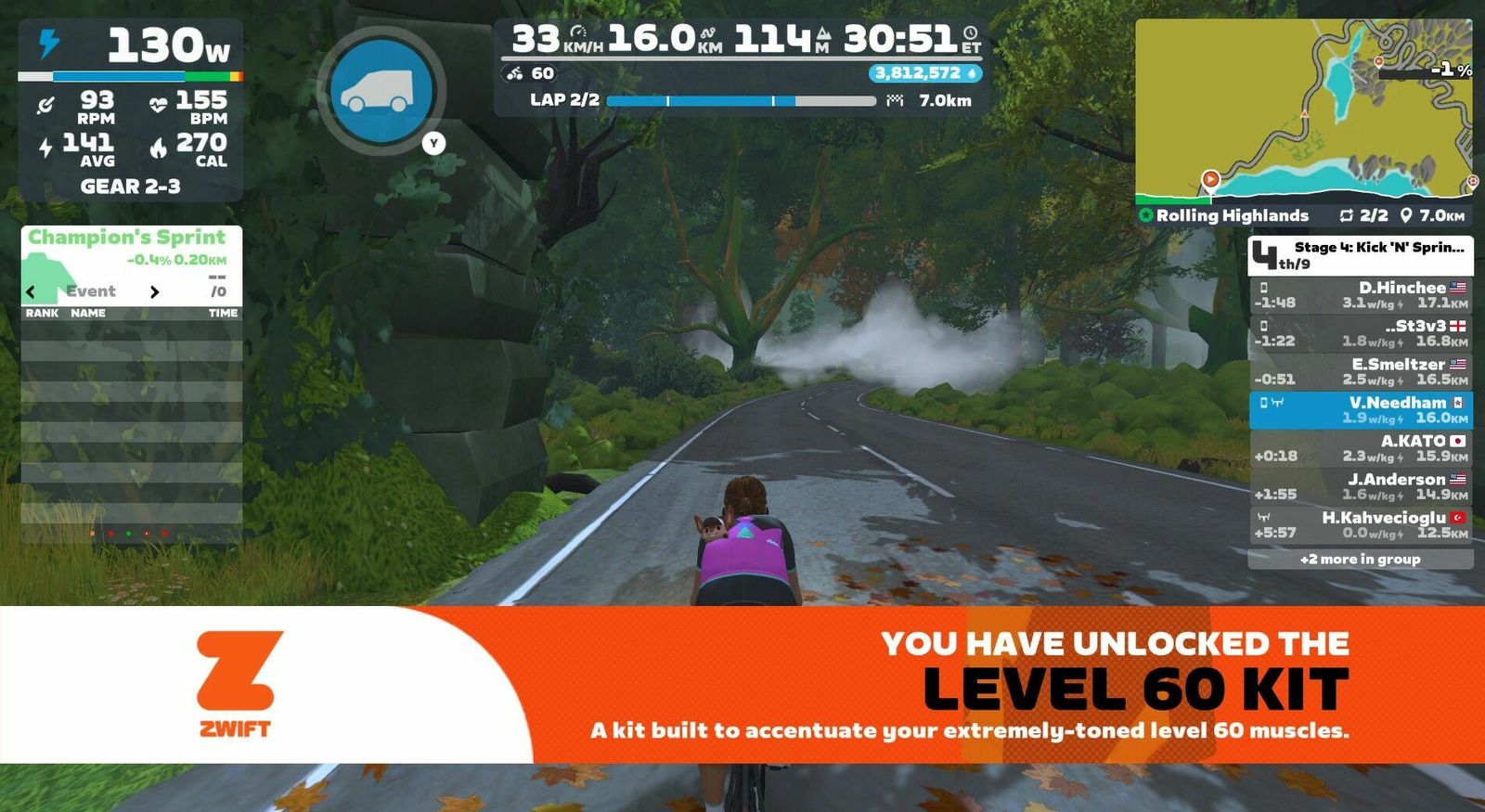Leveled up to the 60th step with the help of a pretty great dance pop playlist. Tiffany sang "I Think We're Alone Now" just as I pedaled on my own past Nessie, and the Eurythmics provided authentic Scottish sounds to this Rolling Highlands course. Stayed with the leaders for about the first third of the race before the hot shots dropped the hammer and I did not try to follow. Stayed all by my lonesome (save for Nessie) in the middle of the pack from then on. There were only two of us in Zwift Power, so I podiumed there with an average 2.0w/kg or 141w (142w normalized). One rider was in the pink Betty Designs kit that I have yet to earn. I did earn the very Lisa Bike yellow and black level 60 kit, and changed my Scott Addict colorway to yellow to match. If you can't be good you should at least look good!