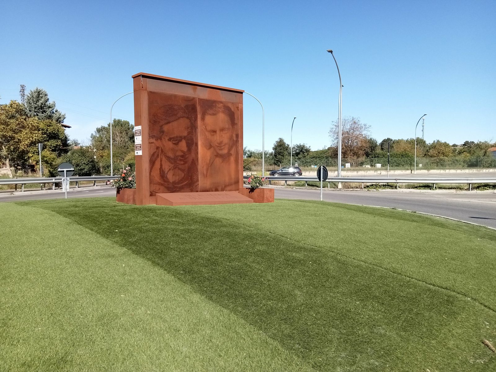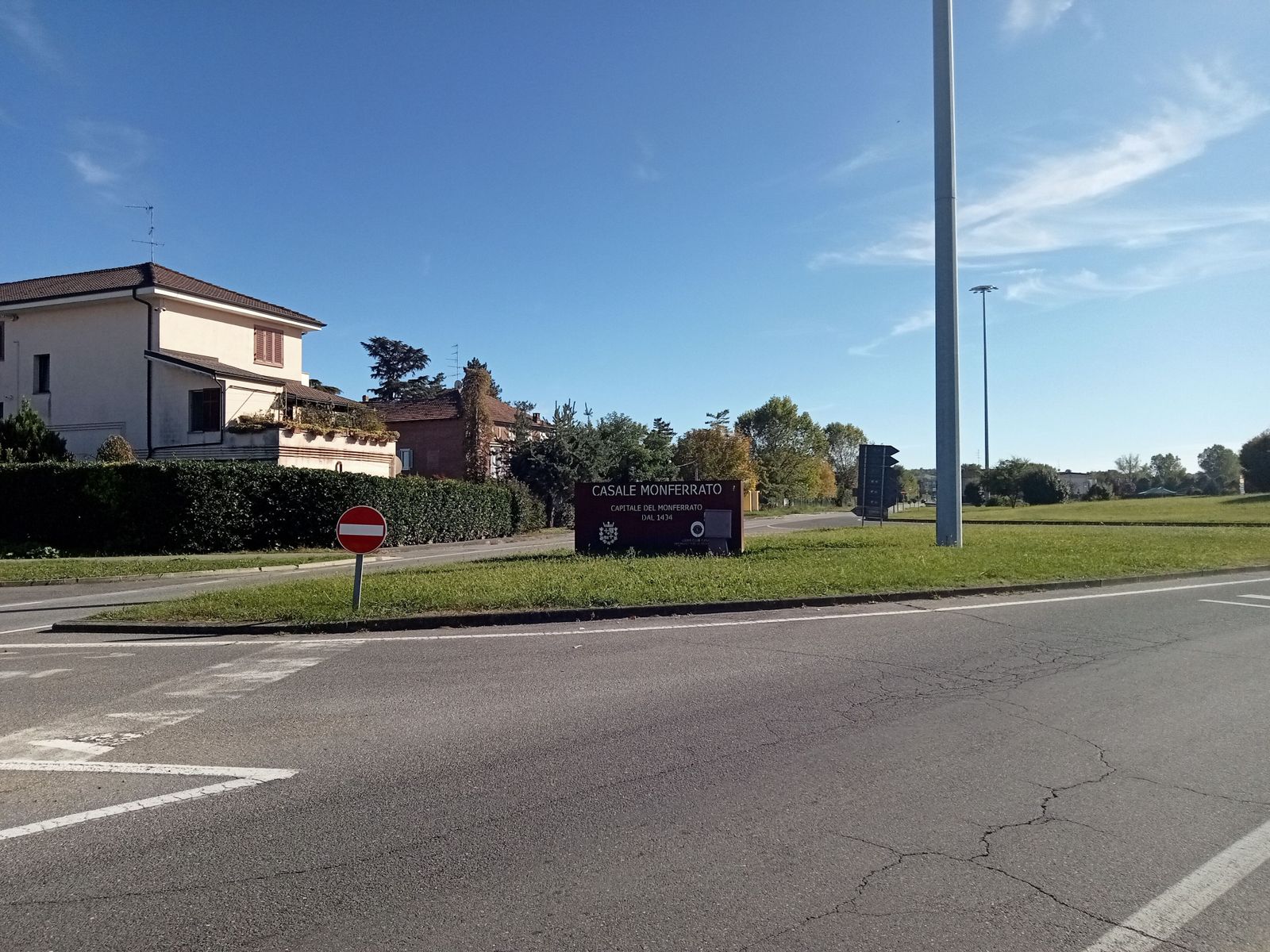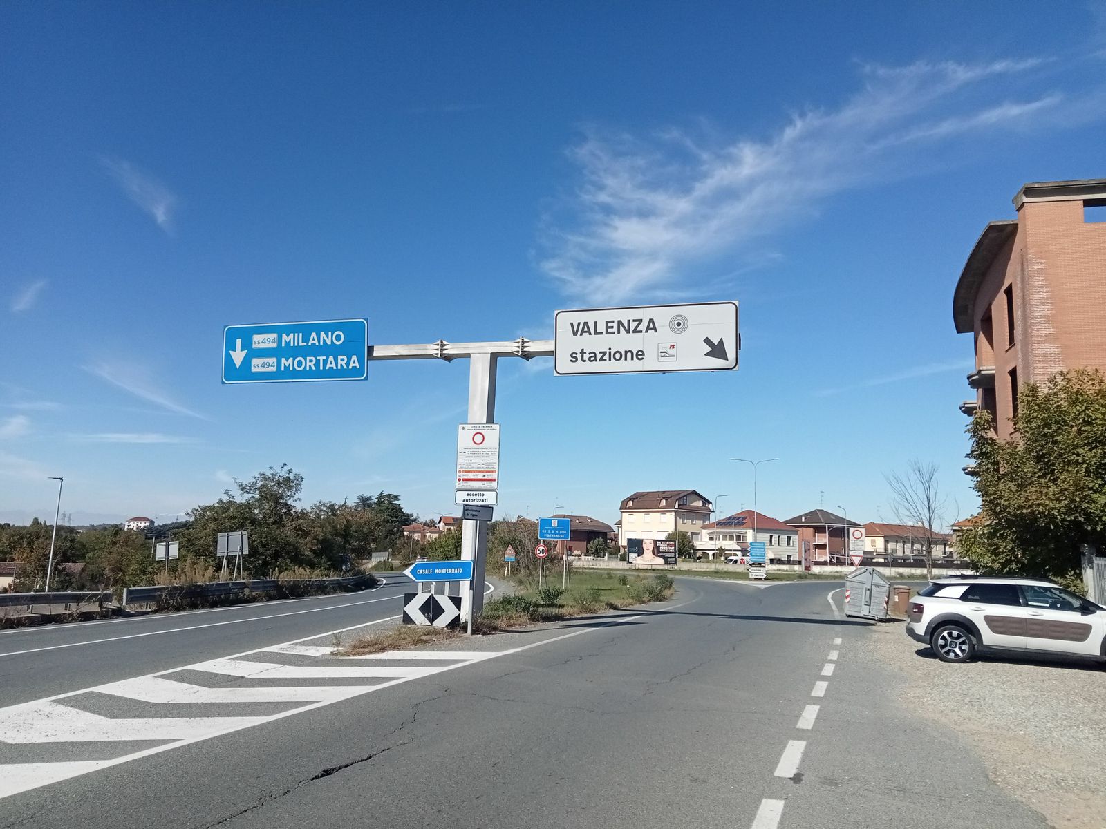 Passo tangente a Valenza e mi accontento di fotografare l’enorme cartellone stradale che ne indica il centro, poi proseguo sulla noiosissima e non proprio perfetta strada SP55 Casale - Valenza, dritta come lo sparo di un fucile, qualche lieve dosso ogni tanto, e risaie su tutti i lati, in alcune già trebbiate, giacciono le grandi balle della paglia del riso, impiegata in molteplici settori, compreso quello della bio edilizia.