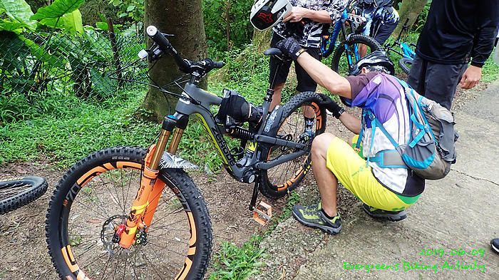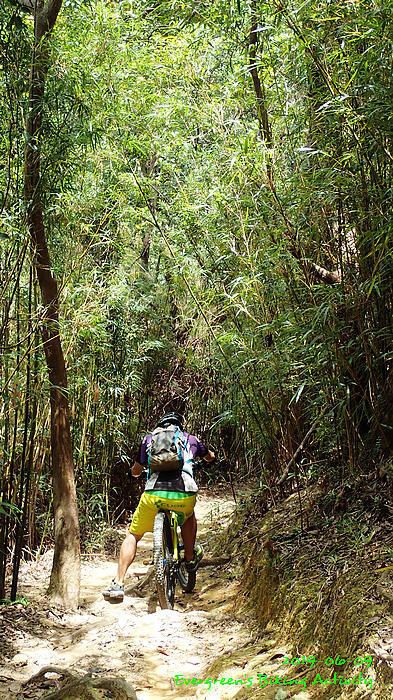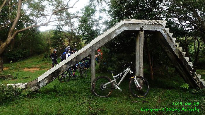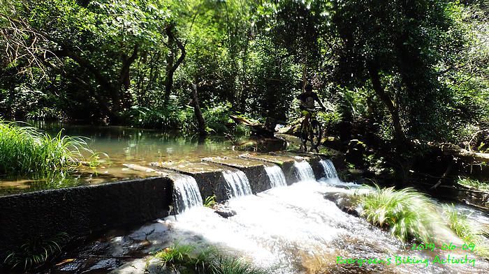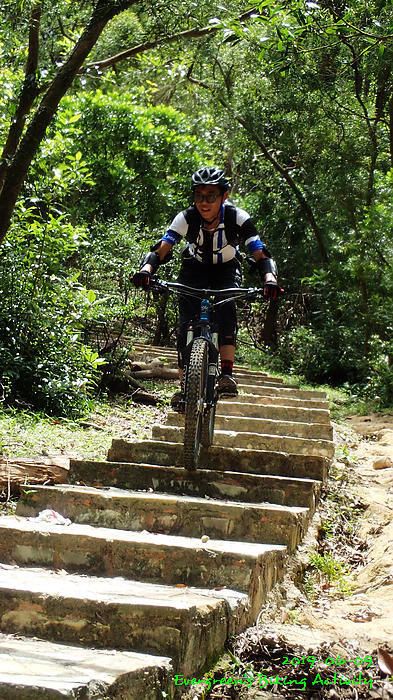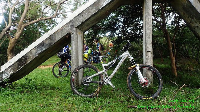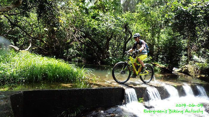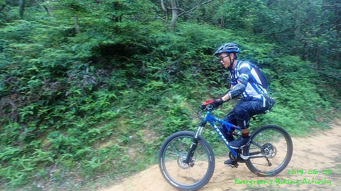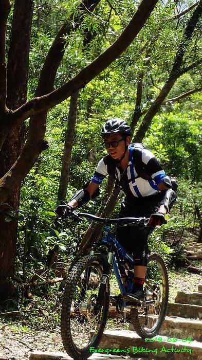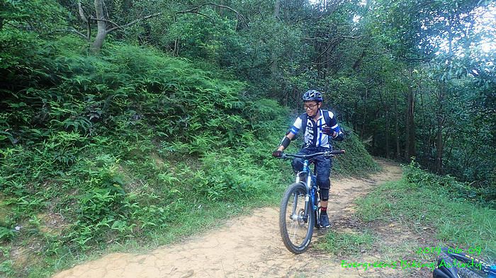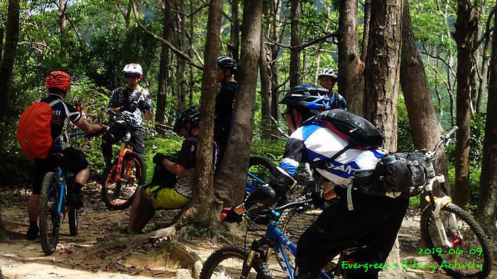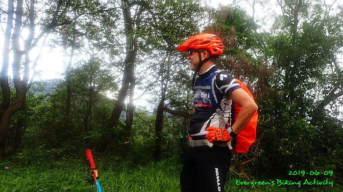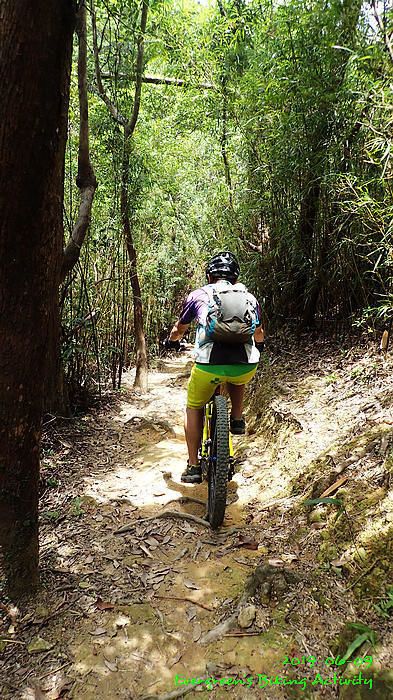路線方面,大家也沒什麼意見,我提出:山徑濕滑,三上三落比較保險,於是就此決定。在林道騎行時,真的落起雨來,可是不似預期,天好黑,雨郤好細,一、兩分鐘就停了,到蓮花山廢校時,又是同樣情況的雨。但係到了第一個上坡,天色越來越好;往後的天氣,都是晴陰交替,微微涼風,稍稍舒緩炎夏的煎熬。