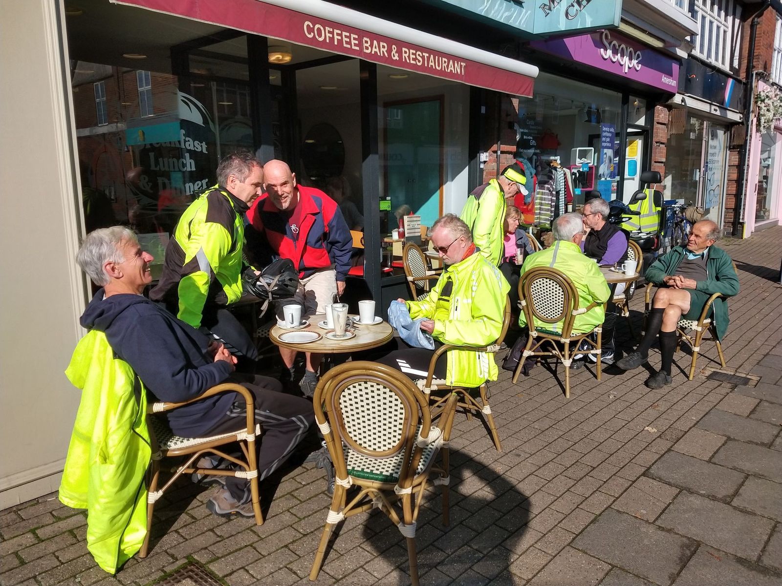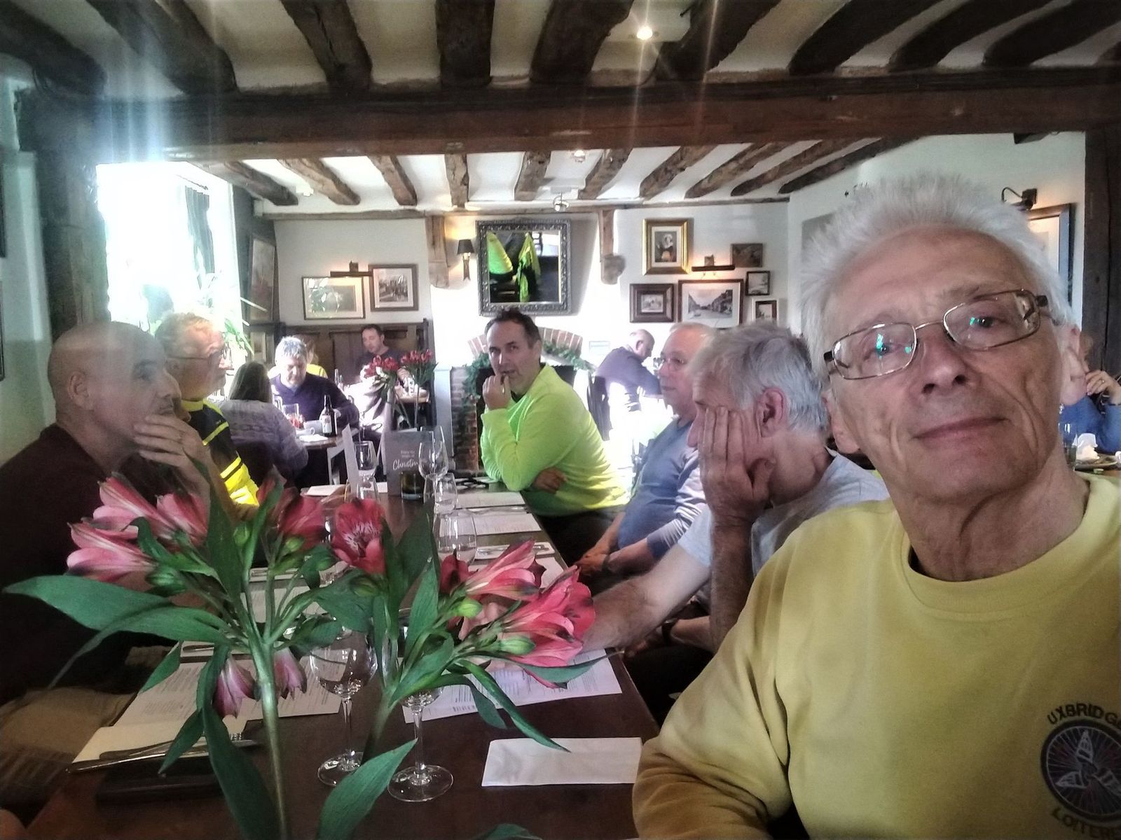 Ten of us on Chris's undulating Sunday ride on a chilly but sunny day - hooray. Morning stop was at Amersham and lunch was at the White Hart Beaconsfield. When we walked in there were about twenty people at the bar waiting to be served with one barman serving. Although the manageress sorted us out a table for ten there was only one waitress serving in the dining area so lunch was a long protracted affair. On the way back some of us sneaked into the newly refurbished and reopened Crown and Treaty - nice.