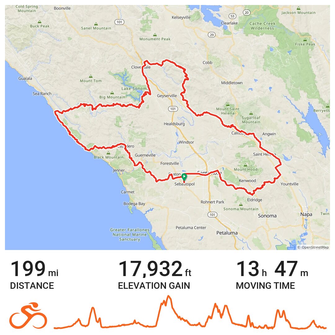 Rode solo much of the time, basically after getting to the climb up Geysers Rd. at mile 74. However, notwithstanding having lost the group with which I had hoped to ride, I did get into a reasonable pace line for the nearly 40 miles of relative flat riding in Napa County after descending from the Trinity climb (ending with the climb up Geyers Rd), averaging just over 20 mph. (A smaller, slower group after the rest stop at mile 53.6.)