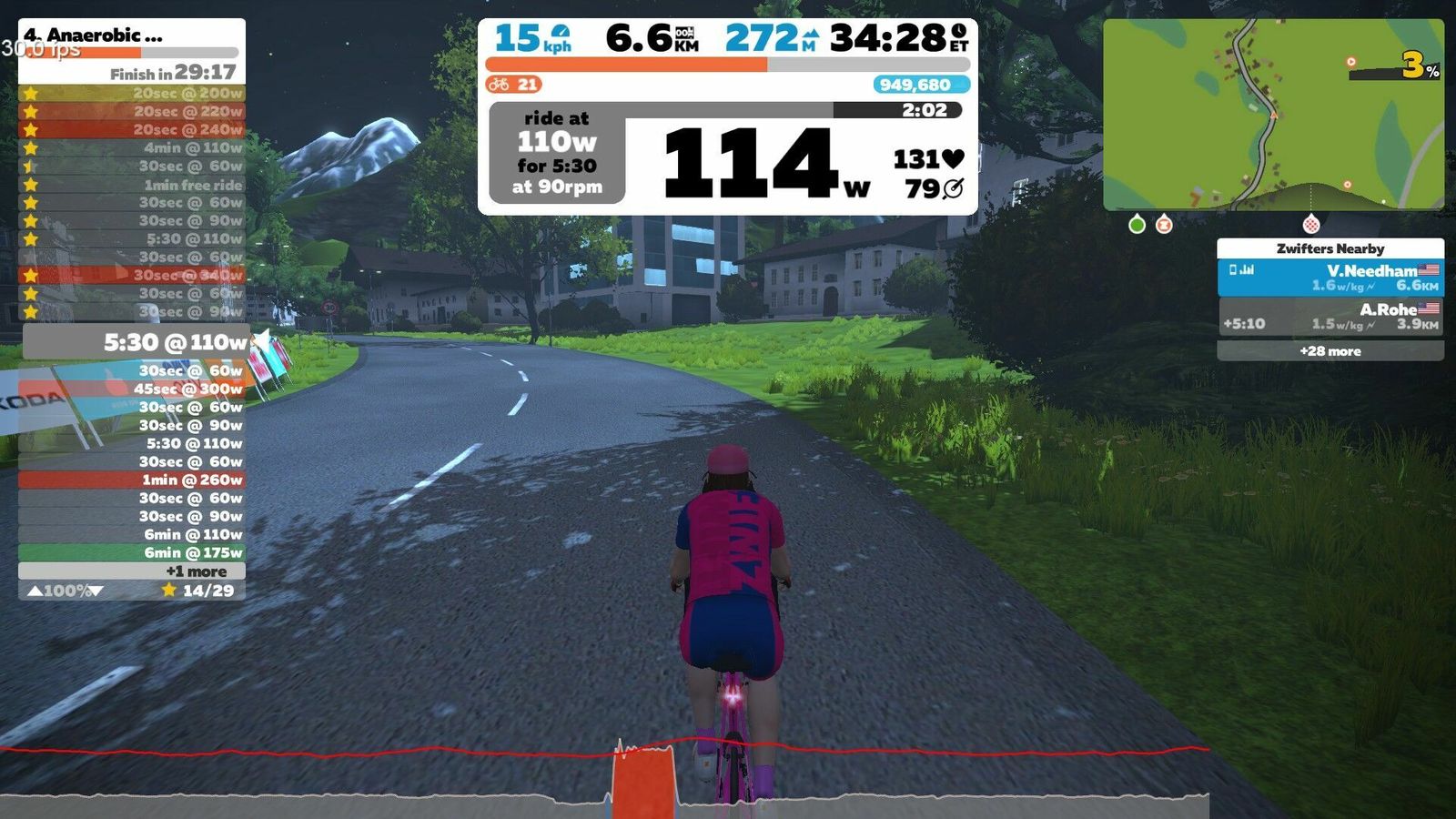 "We are stressing your maximal glycolytic system today... The session starts with a maximal 1min FULL GAS effort to allow you to set a peak power effort... The last three anaerobic efforts are aimed at stressing your anaerobic endurance... We finish the ride with a 6min aerobic effort. This will not be as easy! You may have depleted all of your anaerobic energy, plus the high power efforts will have impacted your muscular strength by now. Both components combined will leave this sub-threshold effort feeling harder than normal." Quite pleased with today's effort. Got almost all the stars with a smooth and elegant effort. Only missed those silly ultra-low-power short segments. I'm getting better at those, but their value still eludes me. My one-minute effort here was 360W, compared to my record of 370W (say Strava and Garmin, but Wattboard has 331W).