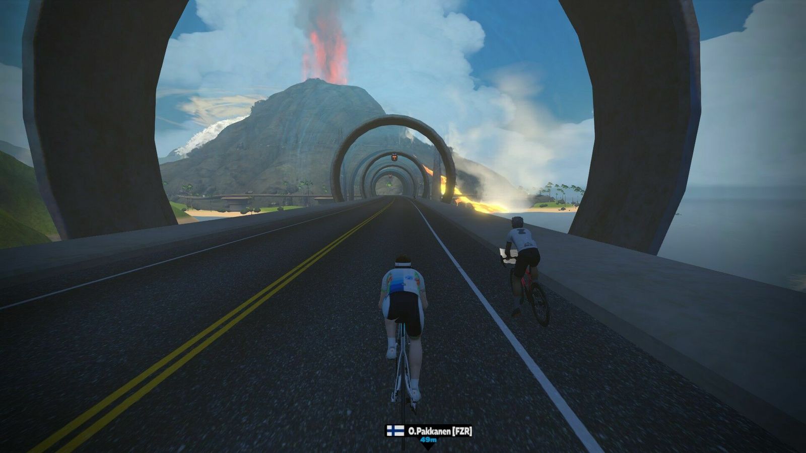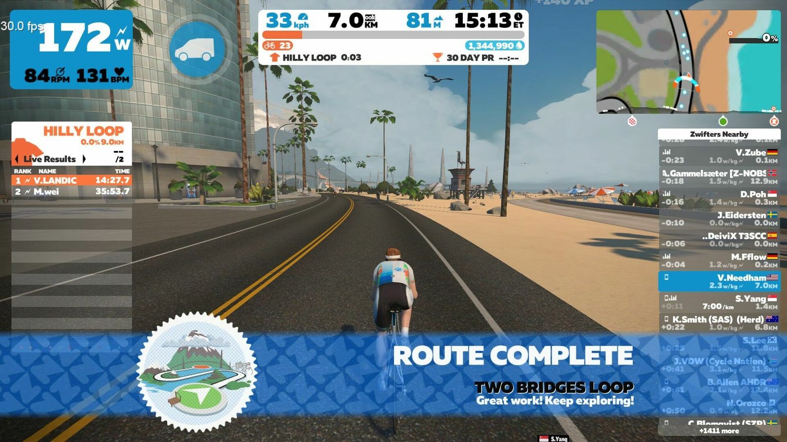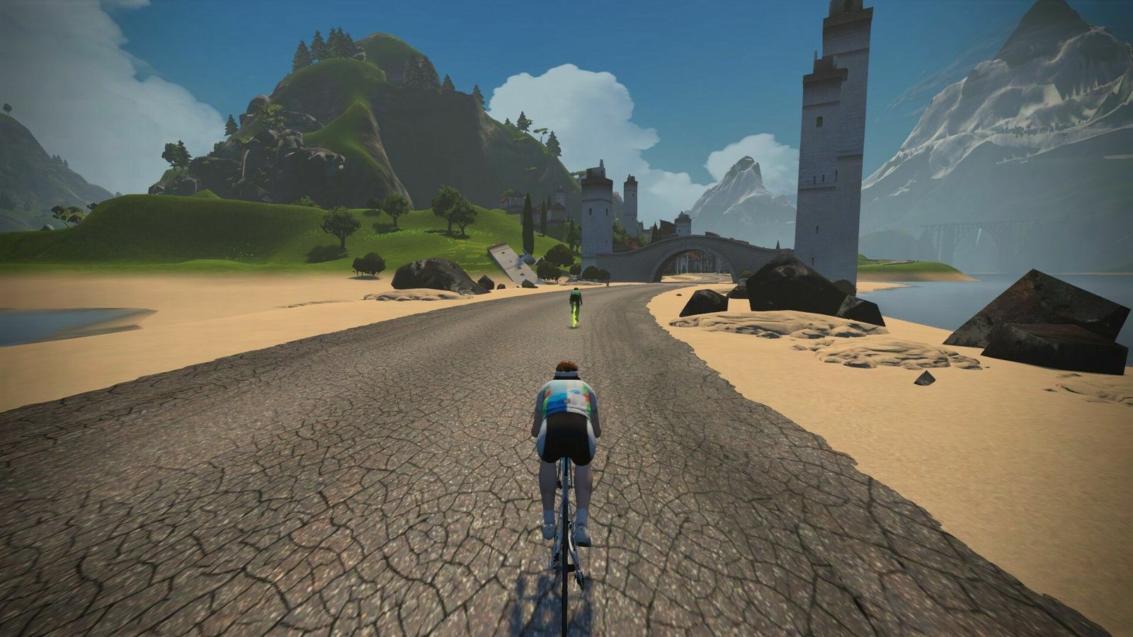 "The shortest of the new routes, Two Bridges loops keeps you near downtown Watopia thanks to the new “KOM Bypass” road which connects the Hilly KOM Forward with the Hilly KOM Reverse, shortening the climbs. At 6.8km with 80m of elevation it’s actually the “climbiest” of the new routes. Visualize this as an abbreviated Hilly Route."