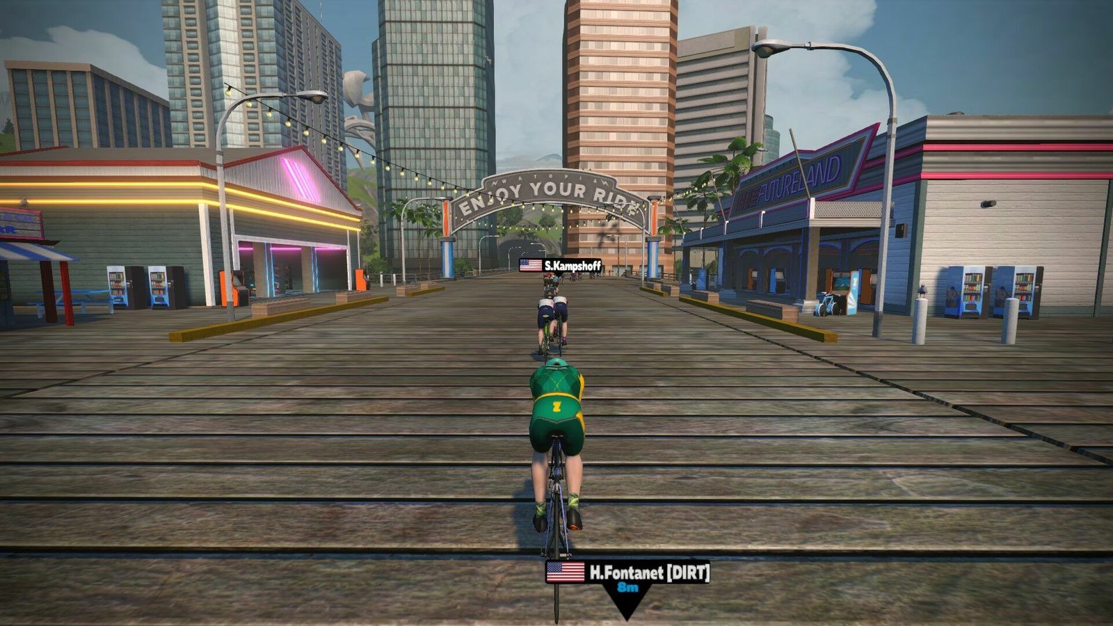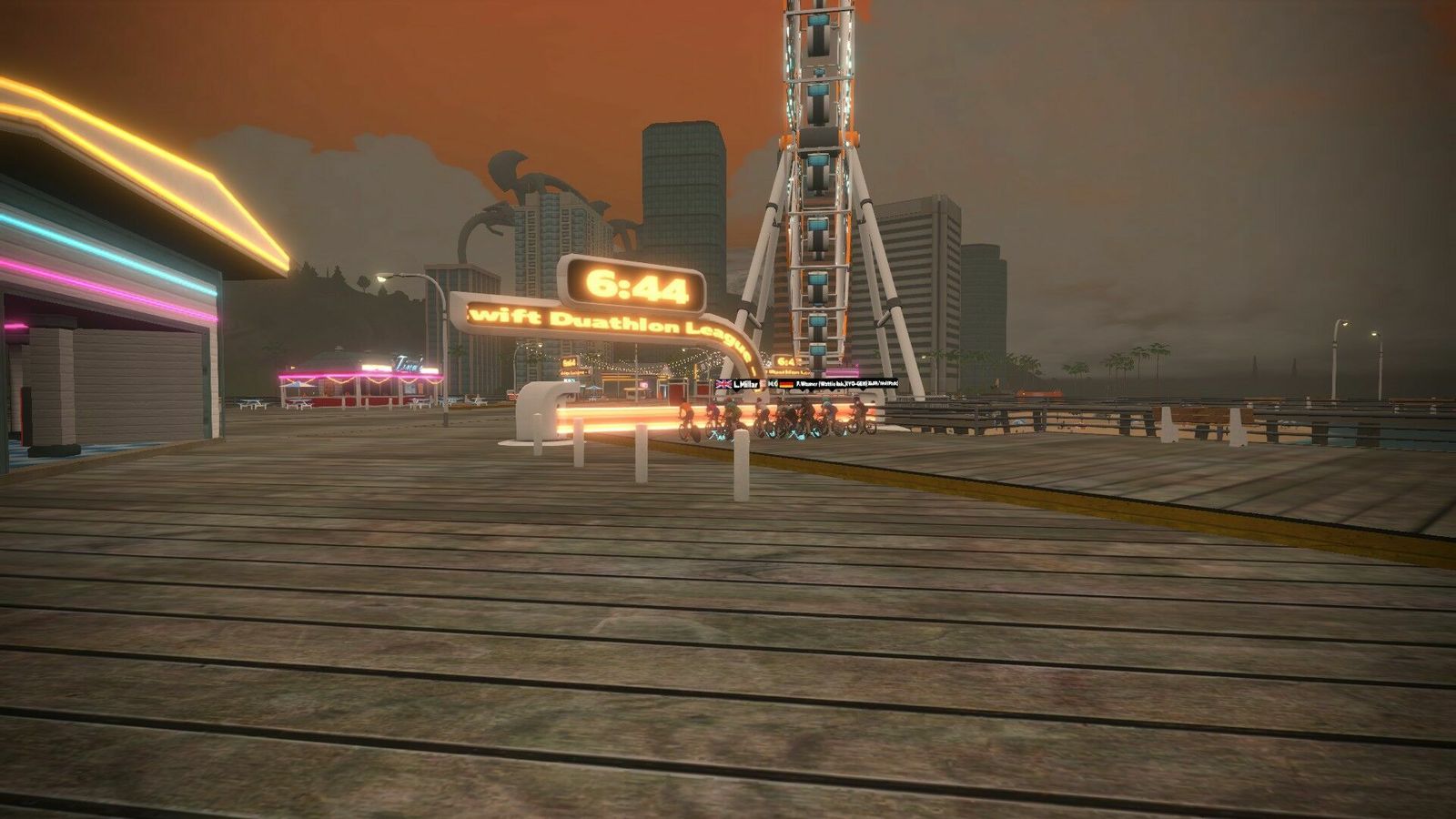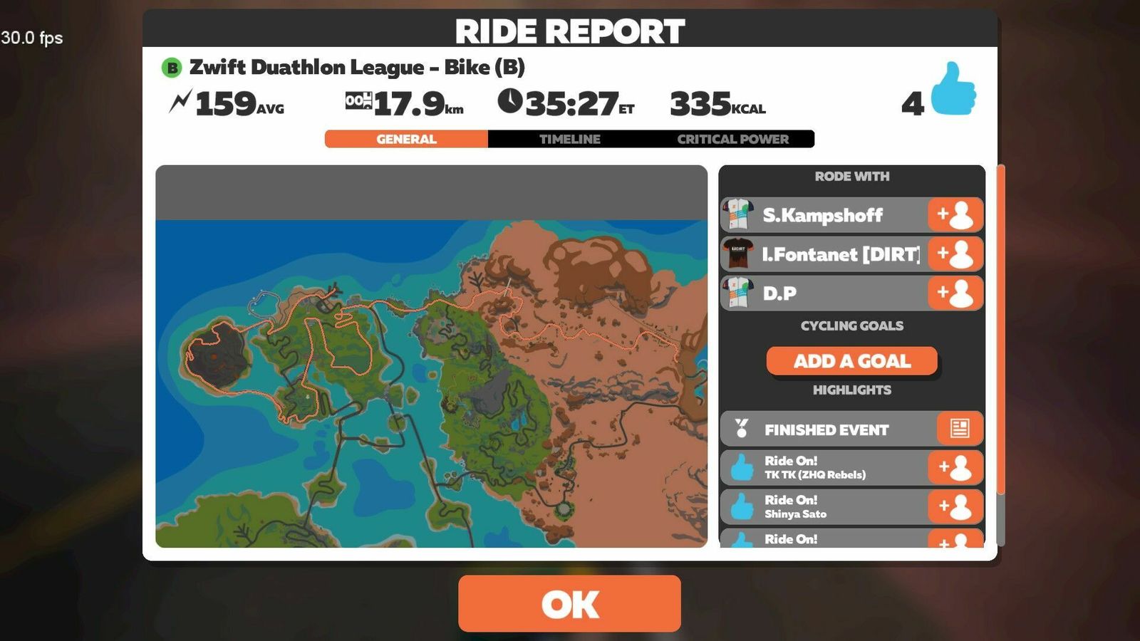 A slightly tougher course for this fifth Zwift Duathlon League race. The Magnificent 8 has some decent hill climbing on the main island before settling into Fuego Flats. My early pace suggested a final distance of about 16 km, so I was pleased to make 17.5 km in the end. Still a slow old man, though. Once again wearing the tri suit and Giro shoes. Updated both Windows and Zwift on both machines this afternoon well before the start.