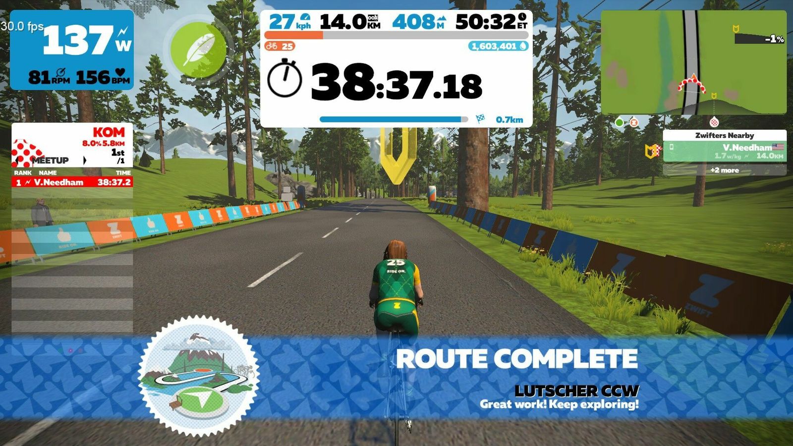 I got stood up on my Zwift meetup, so I had to ride and earn the Lutscher CCW all by myself. Literally, no one else was on the course. Used the meetup trick to spawn at the top of the mountain so I only had to climb this silly thing once to get the badge. Even then, it's a beast even for a masochistic roadie. Fiddling with the meetup I forgot to start the Garmin, so all the data here is from Zwift. Spawned on the TT bike, changed to an Emonda but still with the Zipp 808s for the descent. Swapped those for the 404s at the base of the mountain.