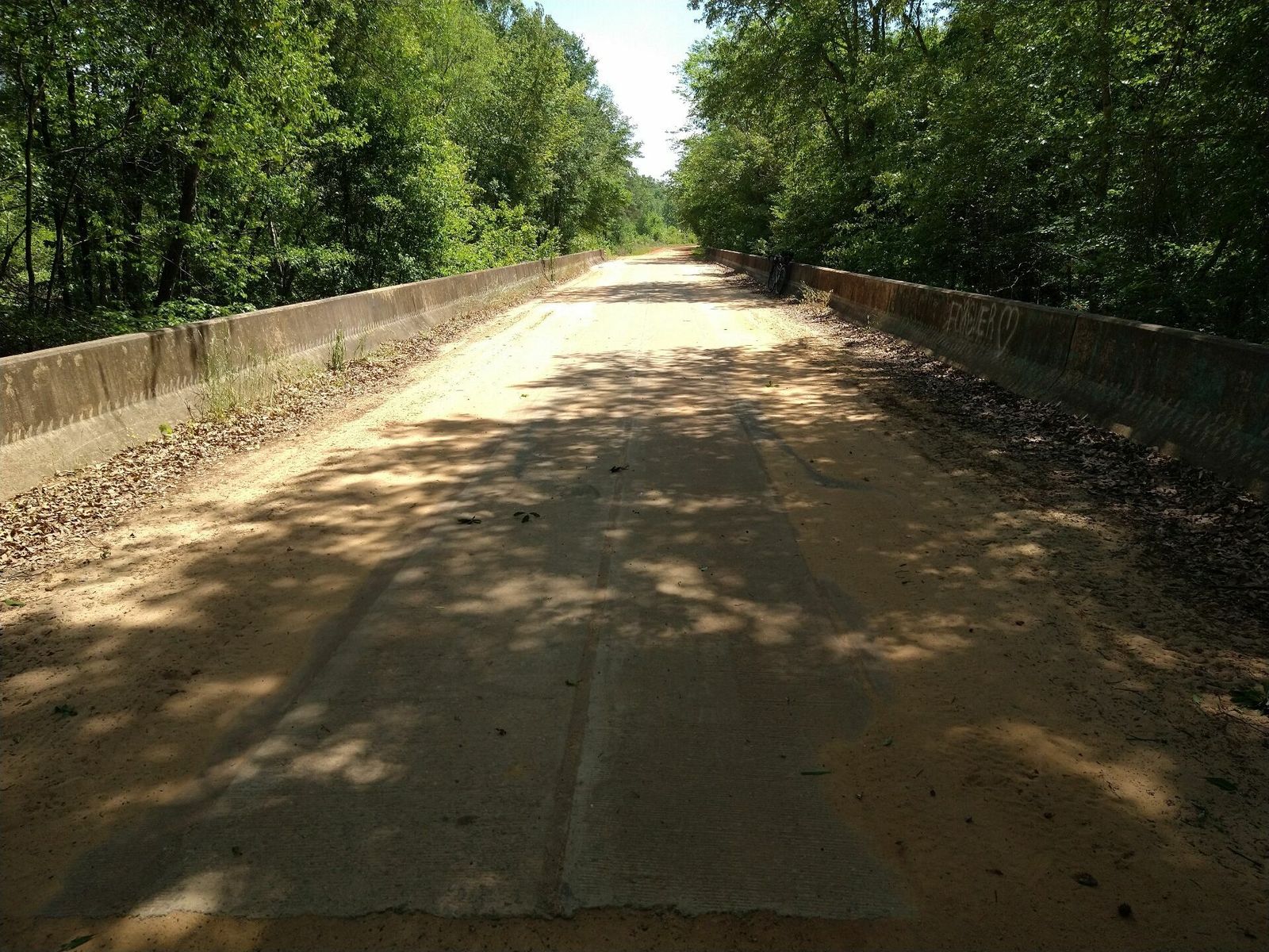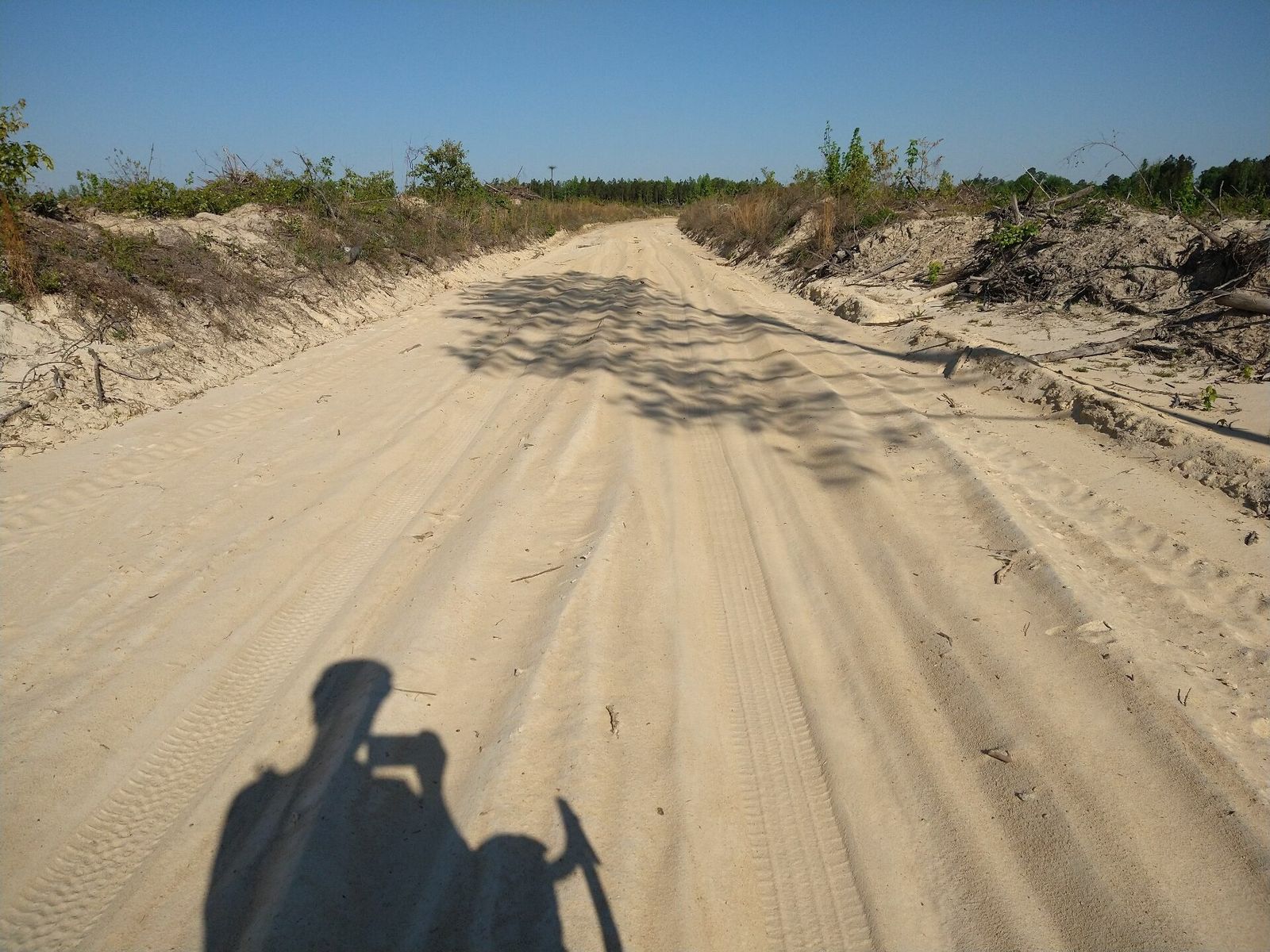 Eventually I made it to the Ohoopee Dunes WMA and the whole ride I had conjured up visions of a shady spot by the river under a big live oak or something. But I get here and the camping area is at an old homesite surrounded by pine plantation far from the river. There was a little cinder block building there too but I didn't think anything of it. I rode on down as far as I could and on the foot path, toward the Little Ohoopee River. But it was way too swampy and brambly there to get to the edge. So I couldn't even see the river I had ridden all this way to see. I rode back up to the camping area. I was the only one there. Decided to check the door on the little building. It opened, and inside was an mostly empty room with a bare concrete floor. Two space heaters in the corner. Two showers! Two flush toilets! A water heater! And a camp chair! I came here expecting just some flat grass and nothing more but I got to take a hot shower and clean my sunsleeves and jersey, and use a sink and flush toilet! And since no one else is here and it's so windy and going to be cool tonight I am going to do the easy thing and sleep on the floor inside.