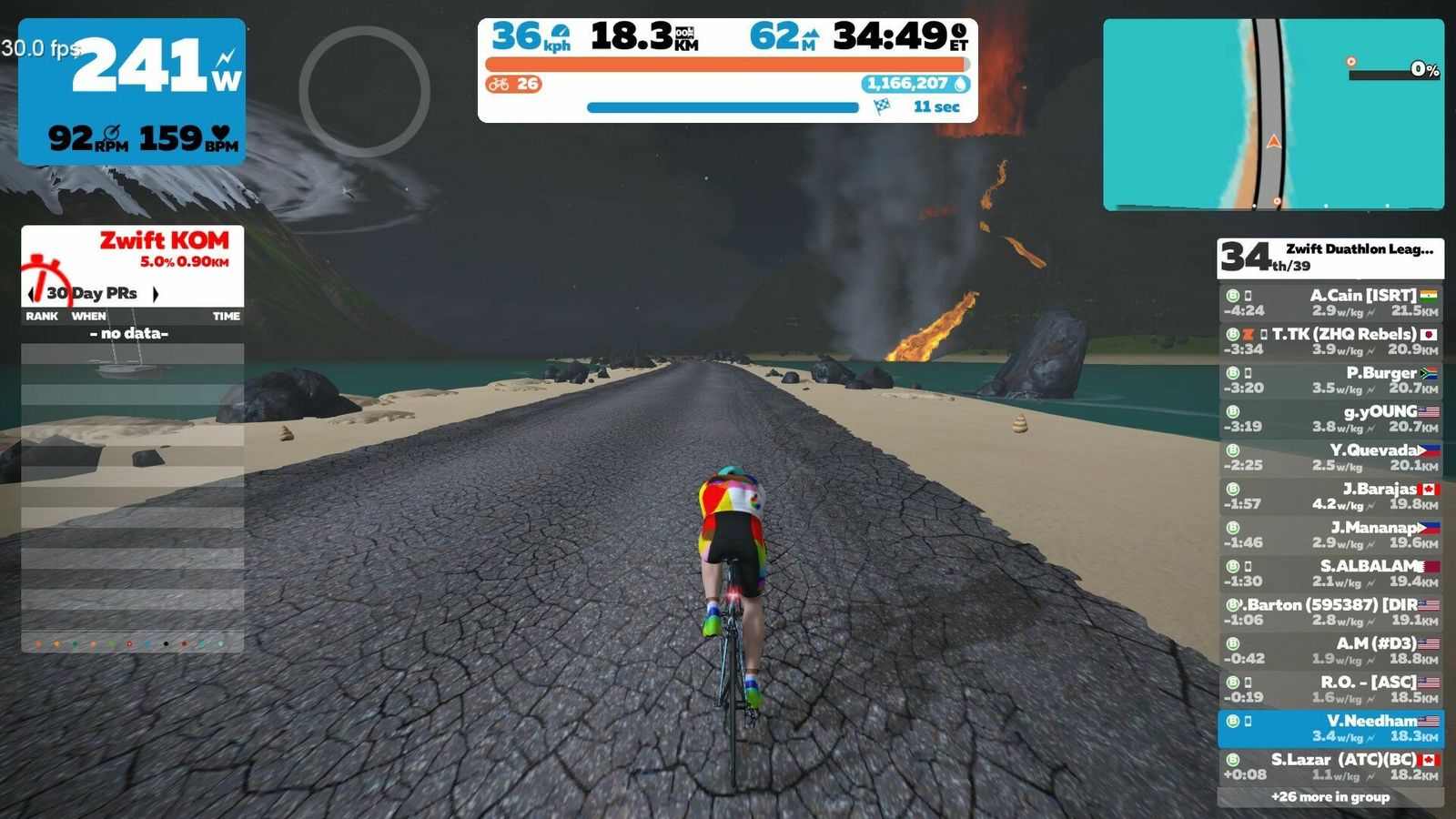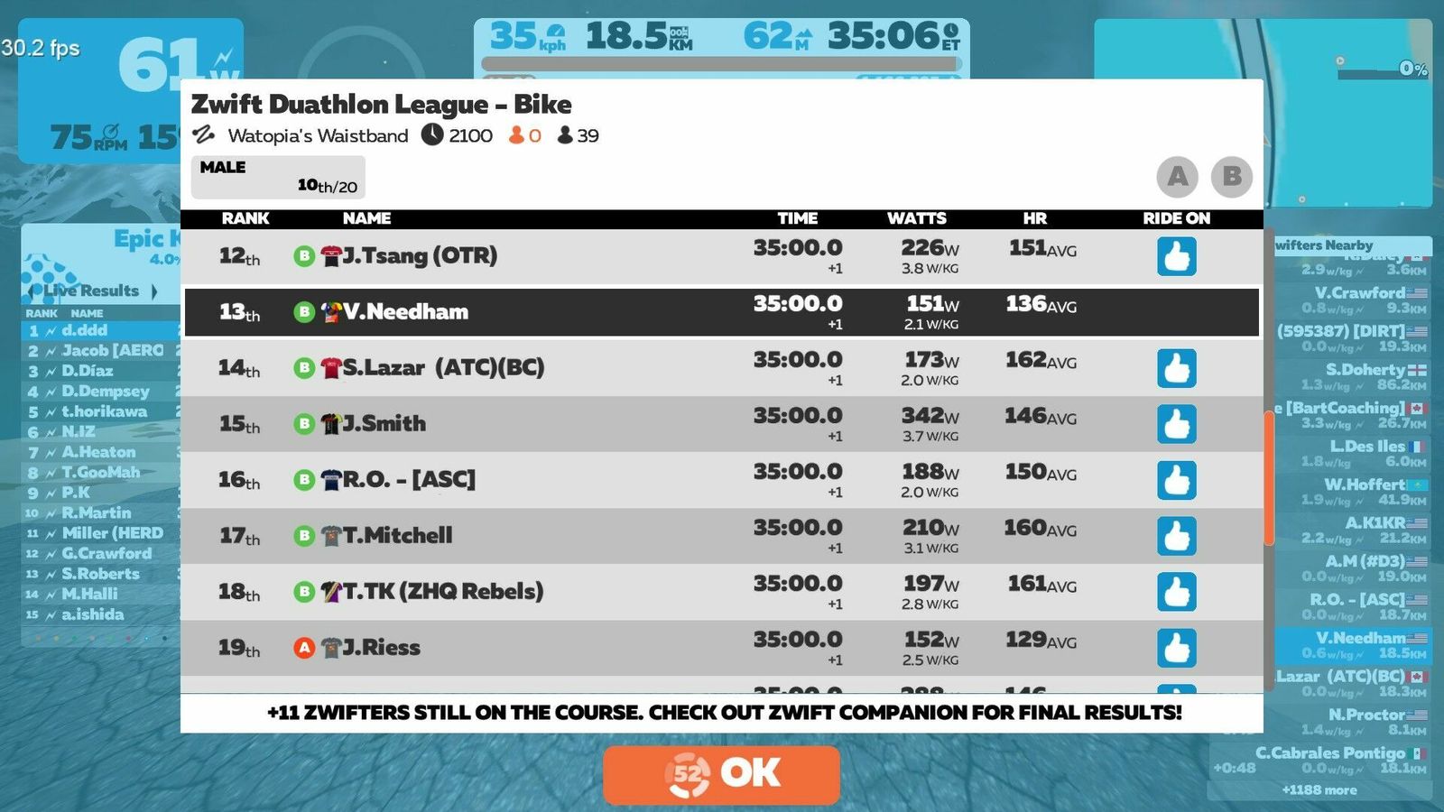 All that hard work almost for naught. I forgot to register with WTRL for the second season of ZDL. Fortunately they're taking late registrations and I showed up on the leaderboard not long after. Did well, too. In the men's 60 - 64 age group I'm 8/15, posting 18.45 km on bike and 2.24 km on foot. That was at 2.12 W/kg or 151 W average on bike and a 6:42 pace on foot. That was 212/405 for all men and 266/530 for all competitors. It should be noted, though, that 47% of the athletes failed to show up for the run. In a duathlon would that be a DNS or a DNF? You have to both finish and not finish last! More commentary on the run posting.