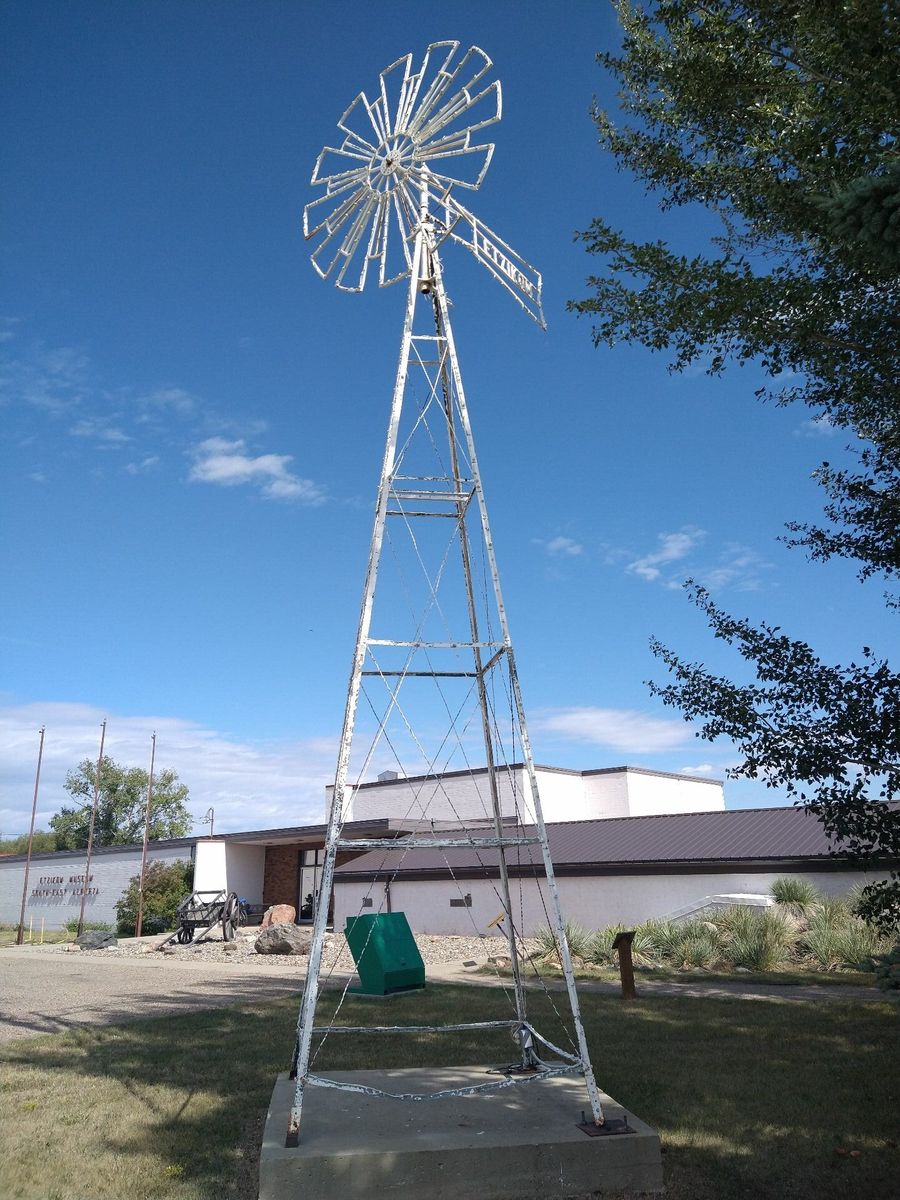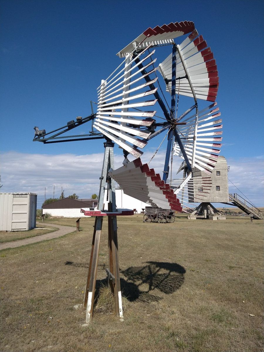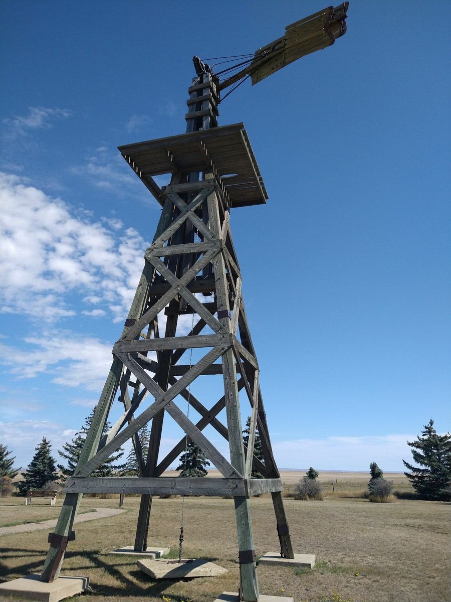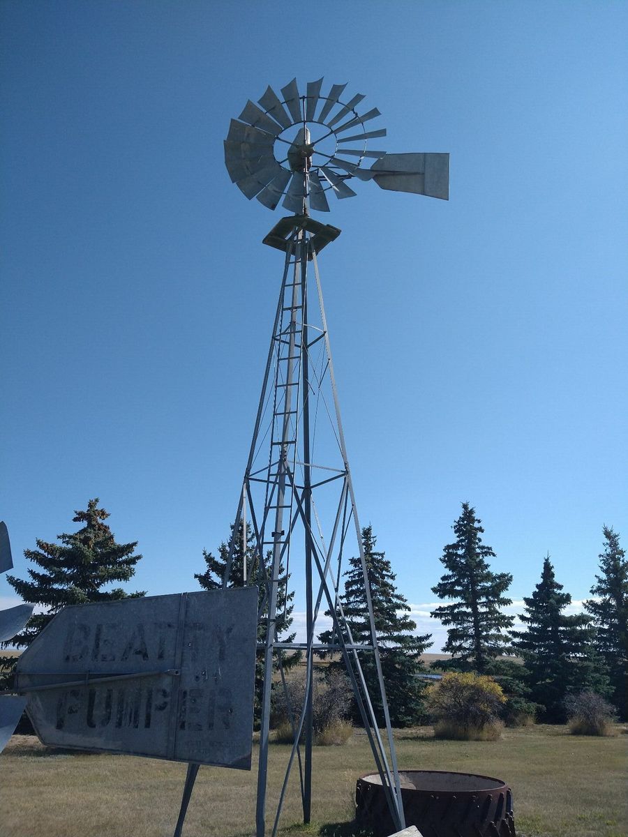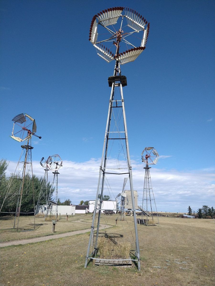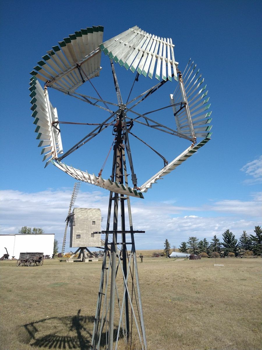 I turned onto the highway to Etzikom, and had to wait by the side of the road to let half of a big house go by, on a big trailer. Strange but kinda cool. I rolled on to town at a decent hour. I hoped that the Windmill museum would have at least bathroom water, but they were closed for the season. Drat. I did get to see all the outside stuff which was impressive. There were various antique metal and wooden windmills but the best one was a huge dutch style one. I poked around the building but didn't see a faucet. I then rode through town and they had a small park but no water. And a small church in disrepair but no dice there either. I rolled on, I still had 4 liters, and only about 40 miles left.