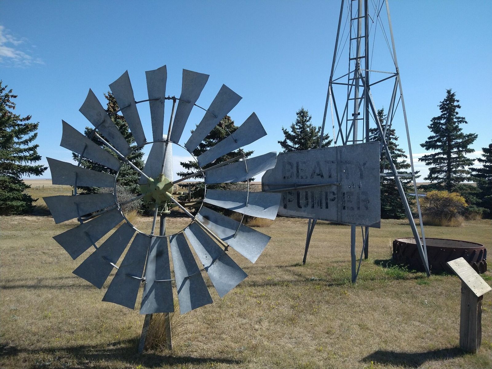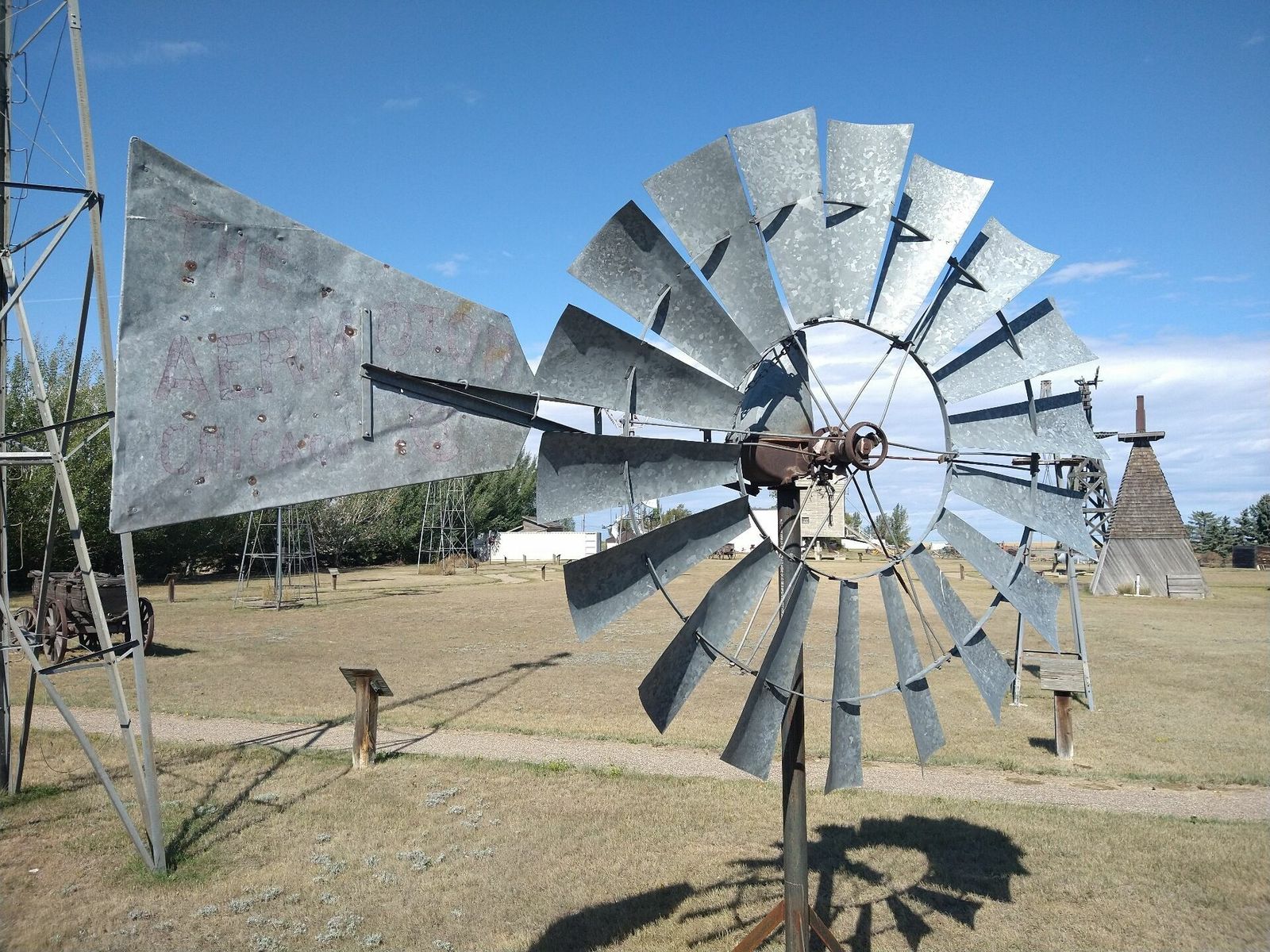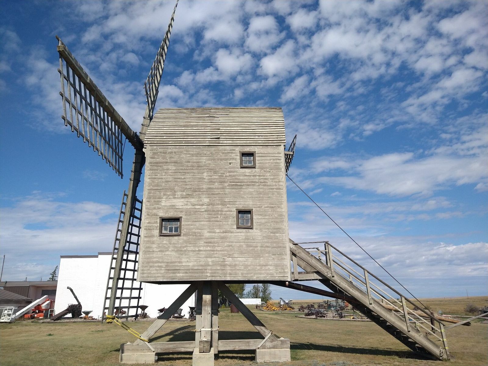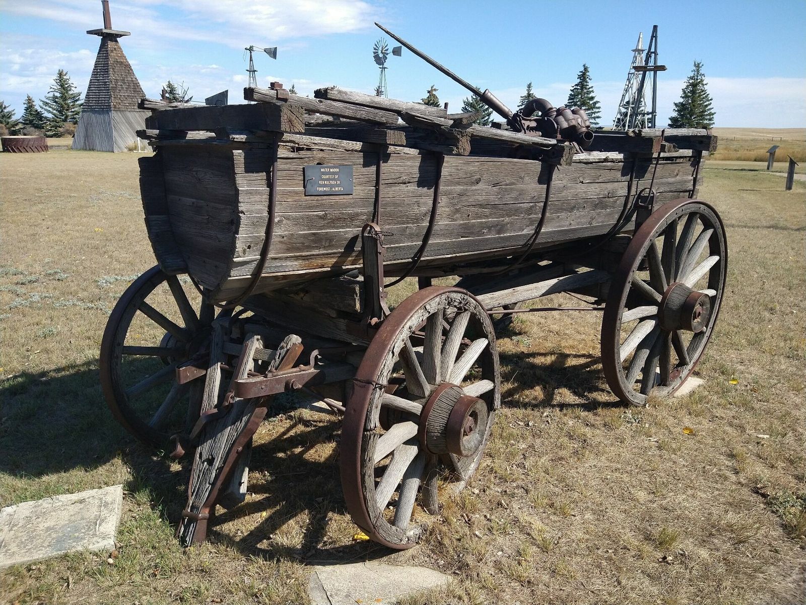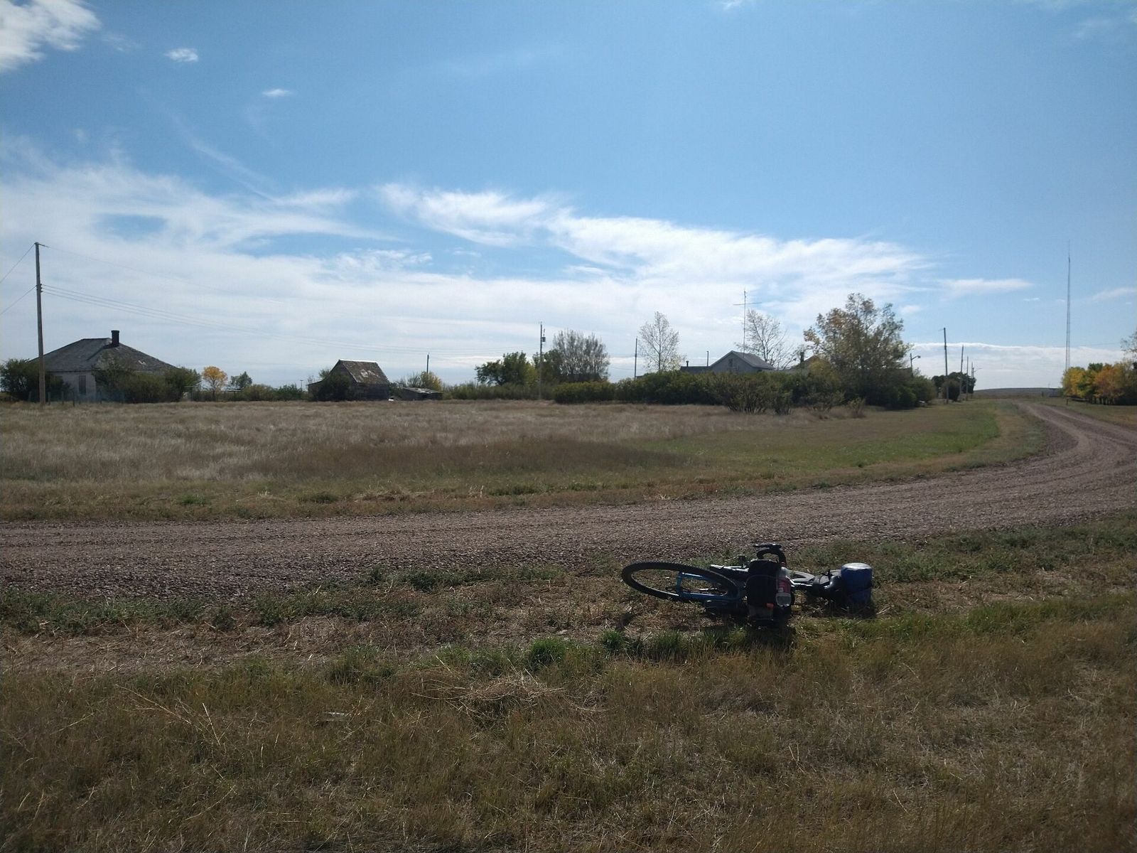I turned onto the highway to Etzikom, and had to wait by the side of the road to let half of a big house go by, on a big trailer. Strange but kinda cool. I rolled on to town at a decent hour. I hoped that the Windmill museum would have at least bathroom water, but they were closed for the season. Drat. I did get to see all the outside stuff which was impressive. There were various antique metal and wooden windmills but the best one was a huge dutch style one. I poked around the building but didn't see a faucet. I then rode through town and they had a small park but no water. And a small church in disrepair but no dice there either. I rolled on, I still had 4 liters, and only about 40 miles left.