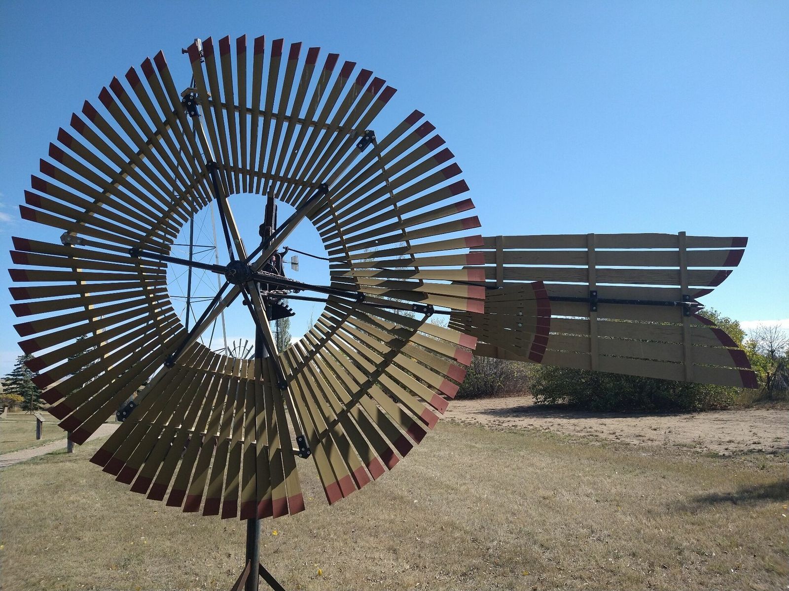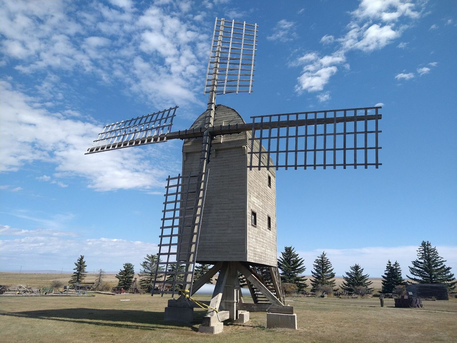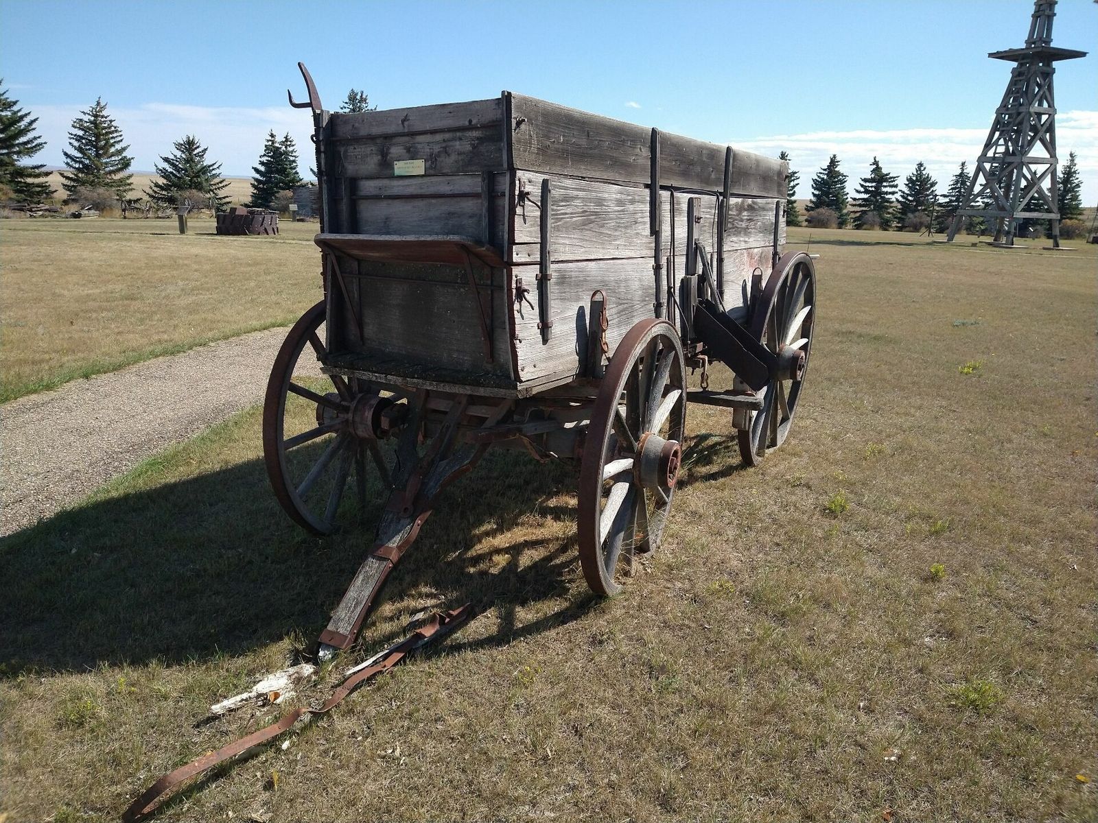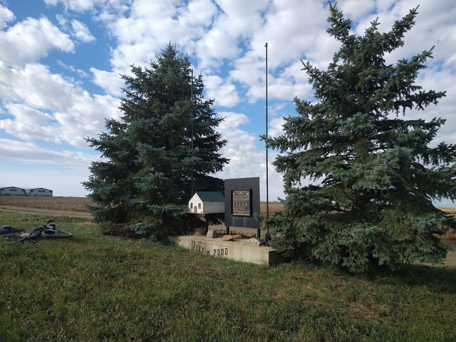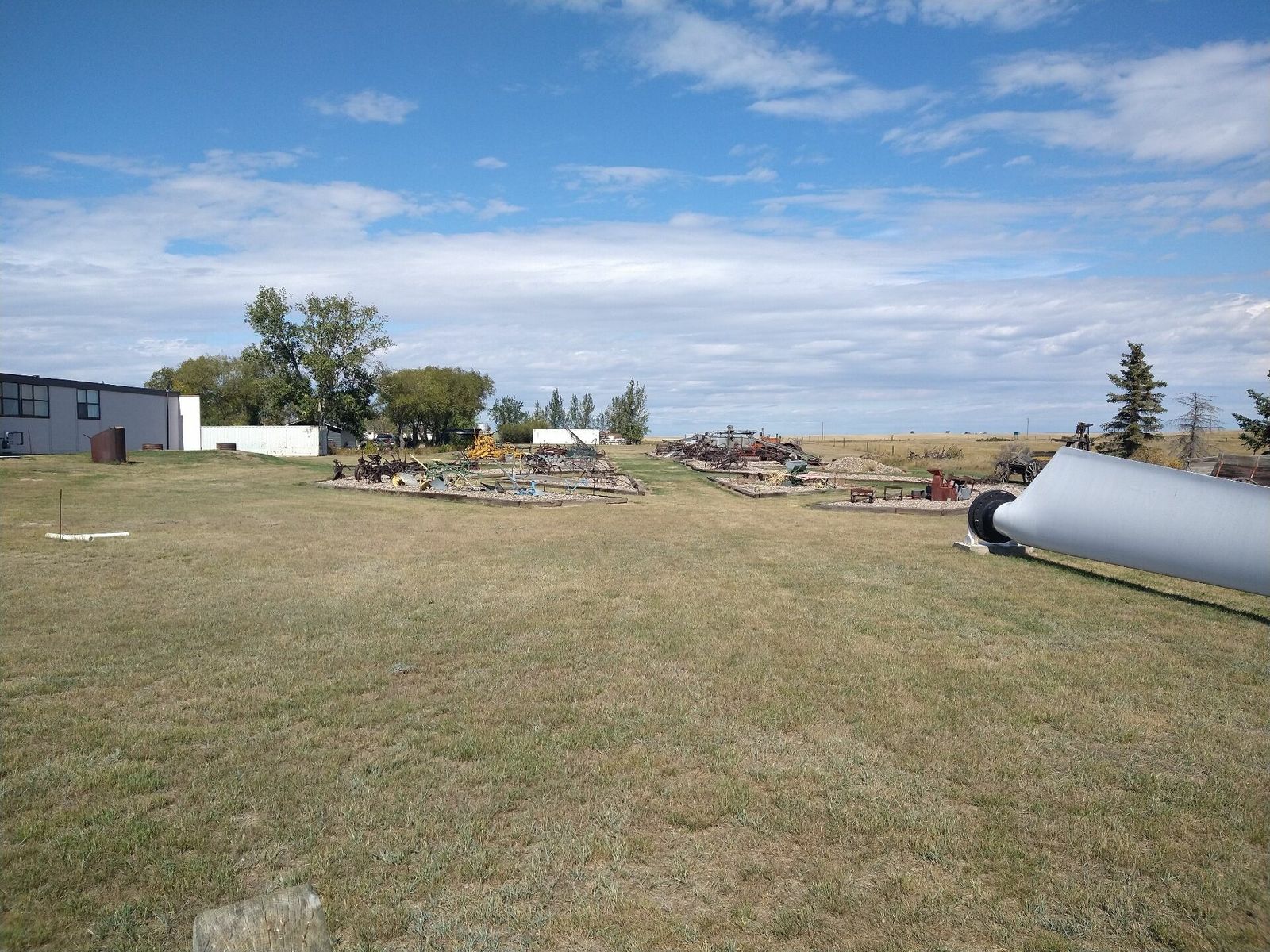 I turned onto the highway to Etzikom, and had to wait by the side of the road to let half of a big house go by, on a big trailer. Strange but kinda cool. I rolled on to town at a decent hour. I hoped that the Windmill museum would have at least bathroom water, but they were closed for the season. Drat. I did get to see all the outside stuff which was impressive. There were various antique metal and wooden windmills but the best one was a huge dutch style one. I poked around the building but didn't see a faucet. I then rode through town and they had a small park but no water. And a small church in disrepair but no dice there either. I rolled on, I still had 4 liters, and only about 40 miles left.