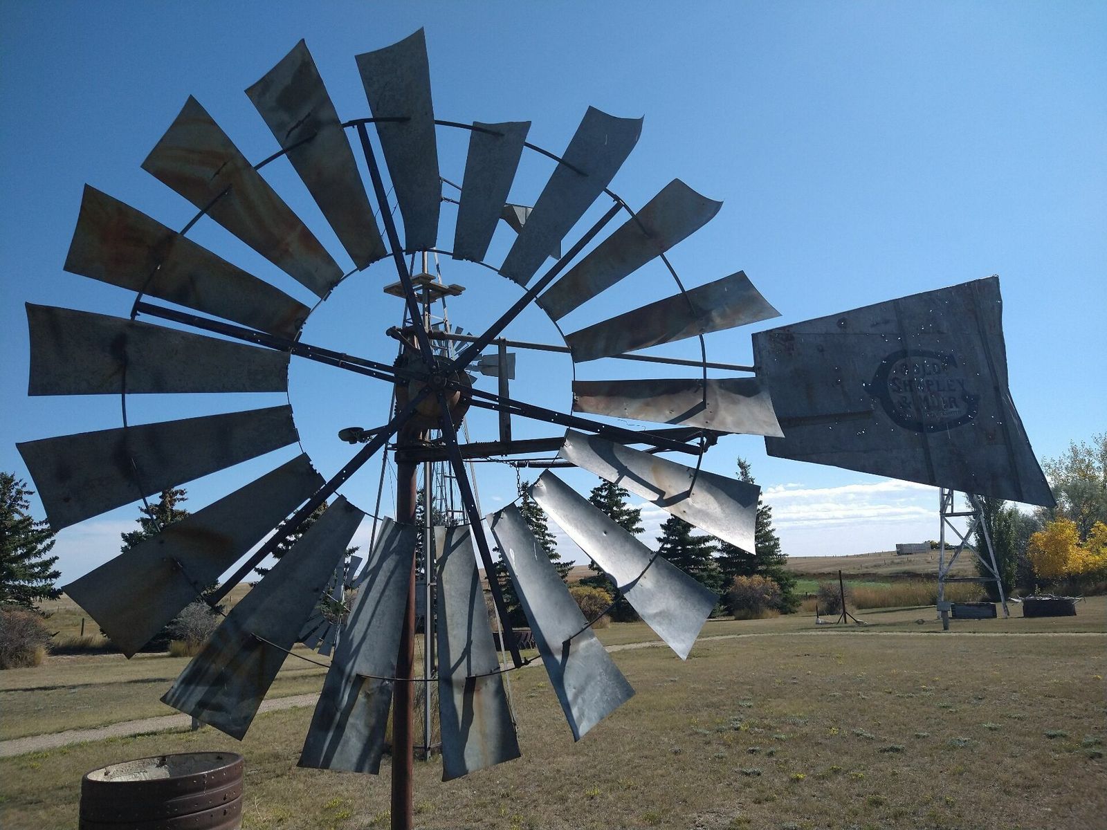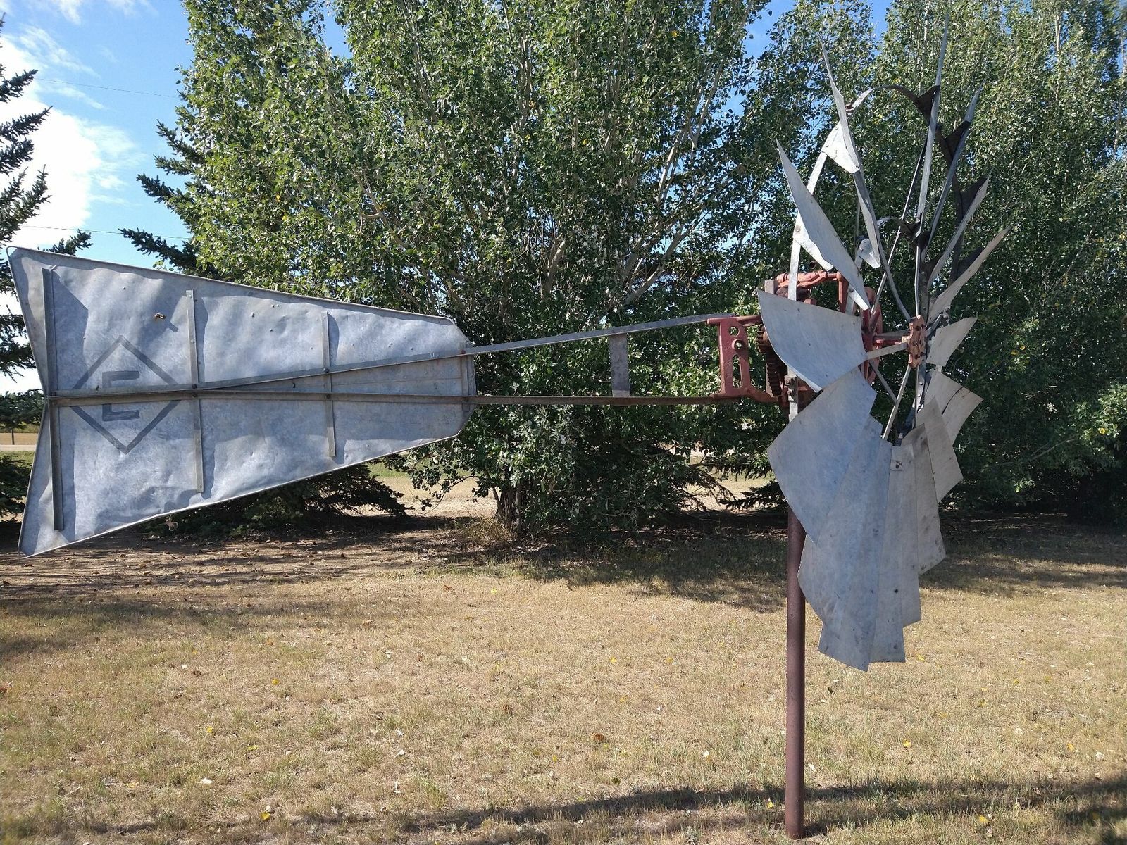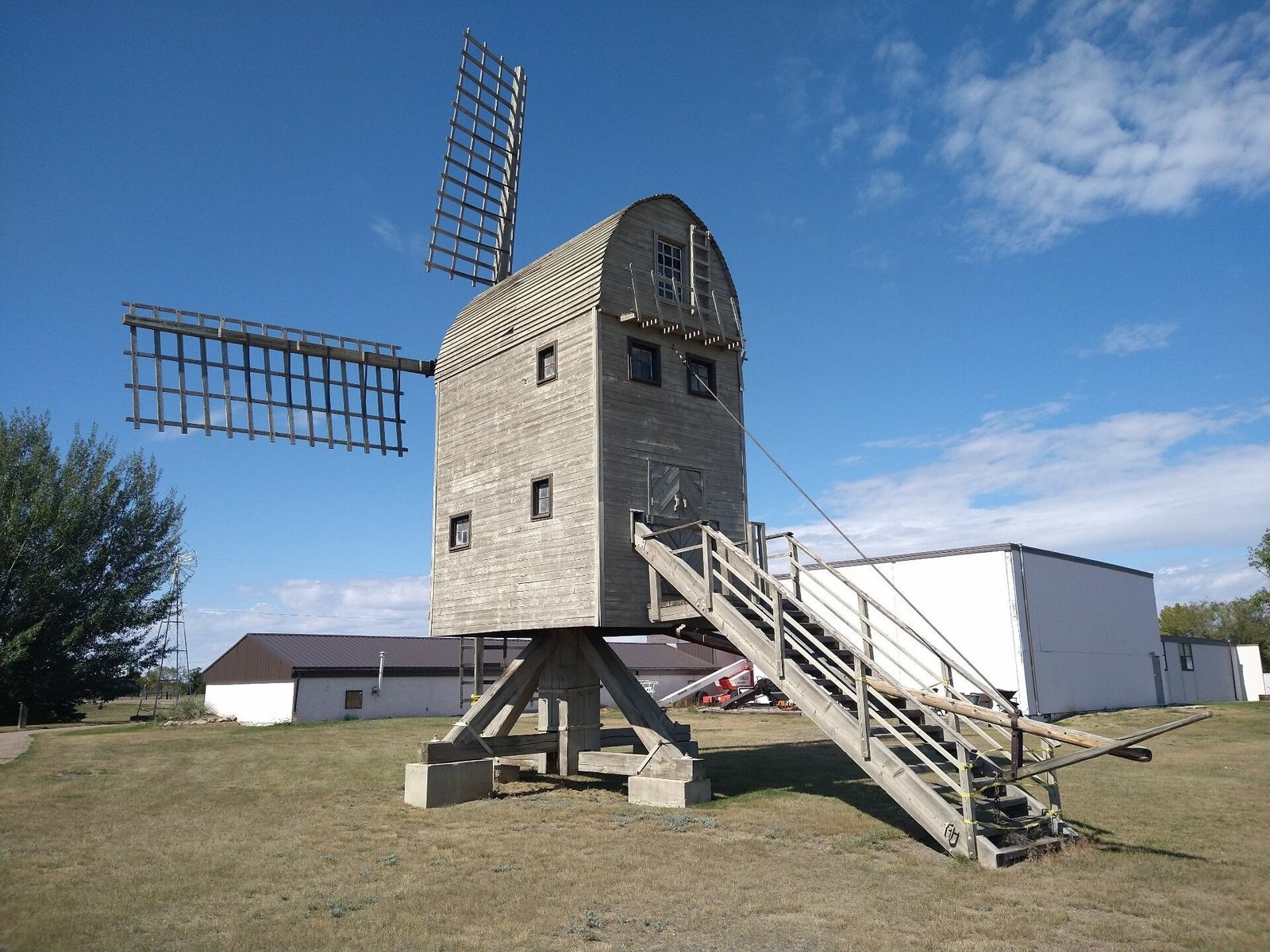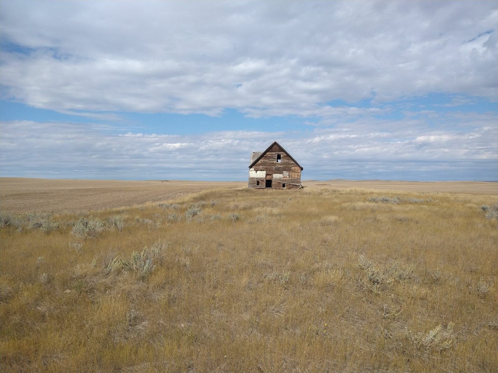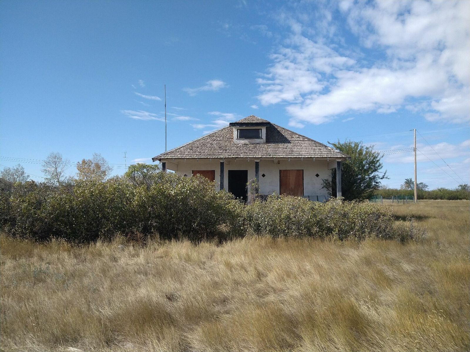 I turned onto the highway to Etzikom, and had to wait by the side of the road to let half of a big house go by, on a big trailer. Strange but kinda cool. I rolled on to town at a decent hour. I hoped that the Windmill museum would have at least bathroom water, but they were closed for the season. Drat. I did get to see all the outside stuff which was impressive. There were various antique metal and wooden windmills but the best one was a huge dutch style one. I poked around the building but didn't see a faucet. I then rode through town and they had a small park but no water. And a small church in disrepair but no dice there either. I rolled on, I still had 4 liters, and only about 40 miles left.