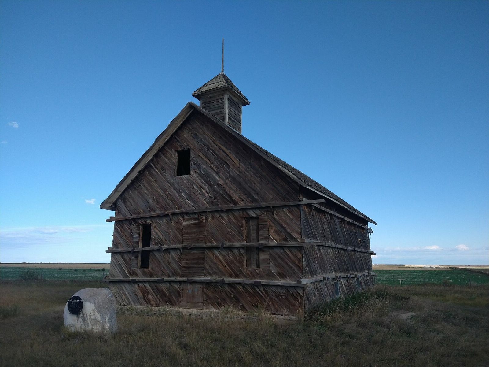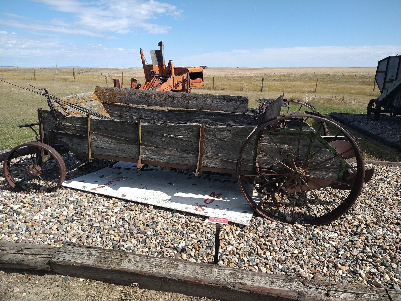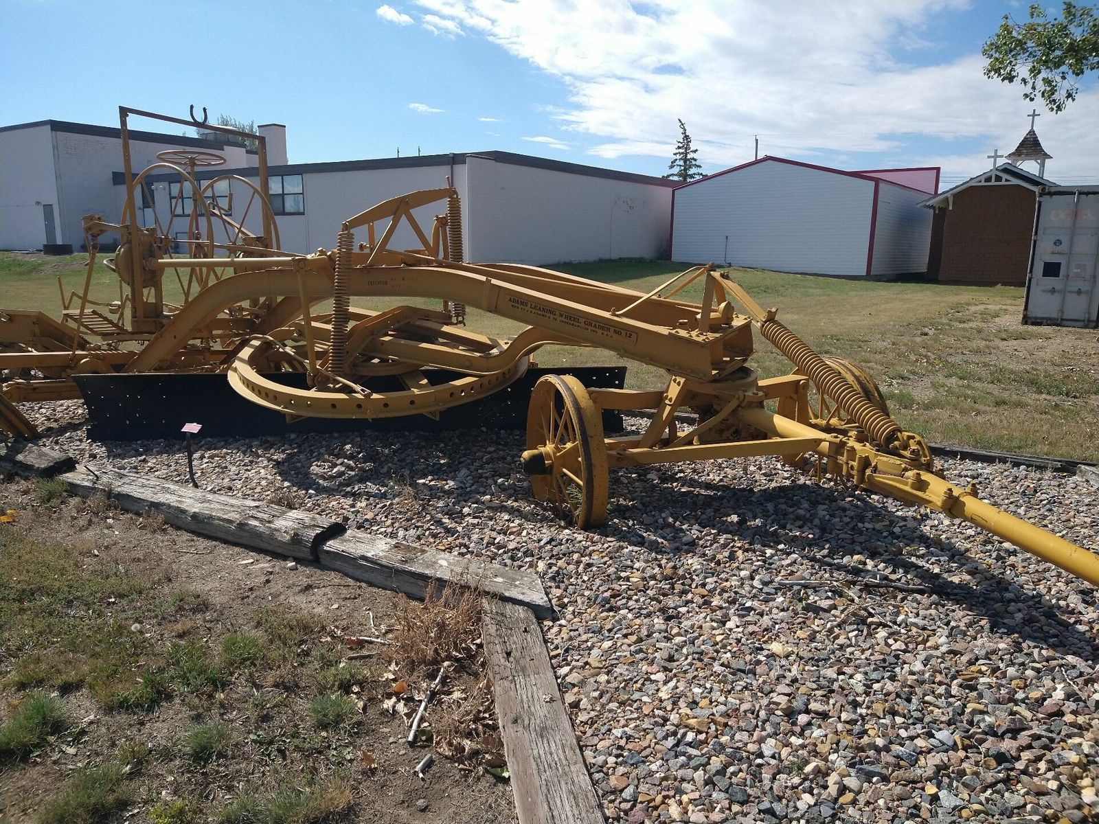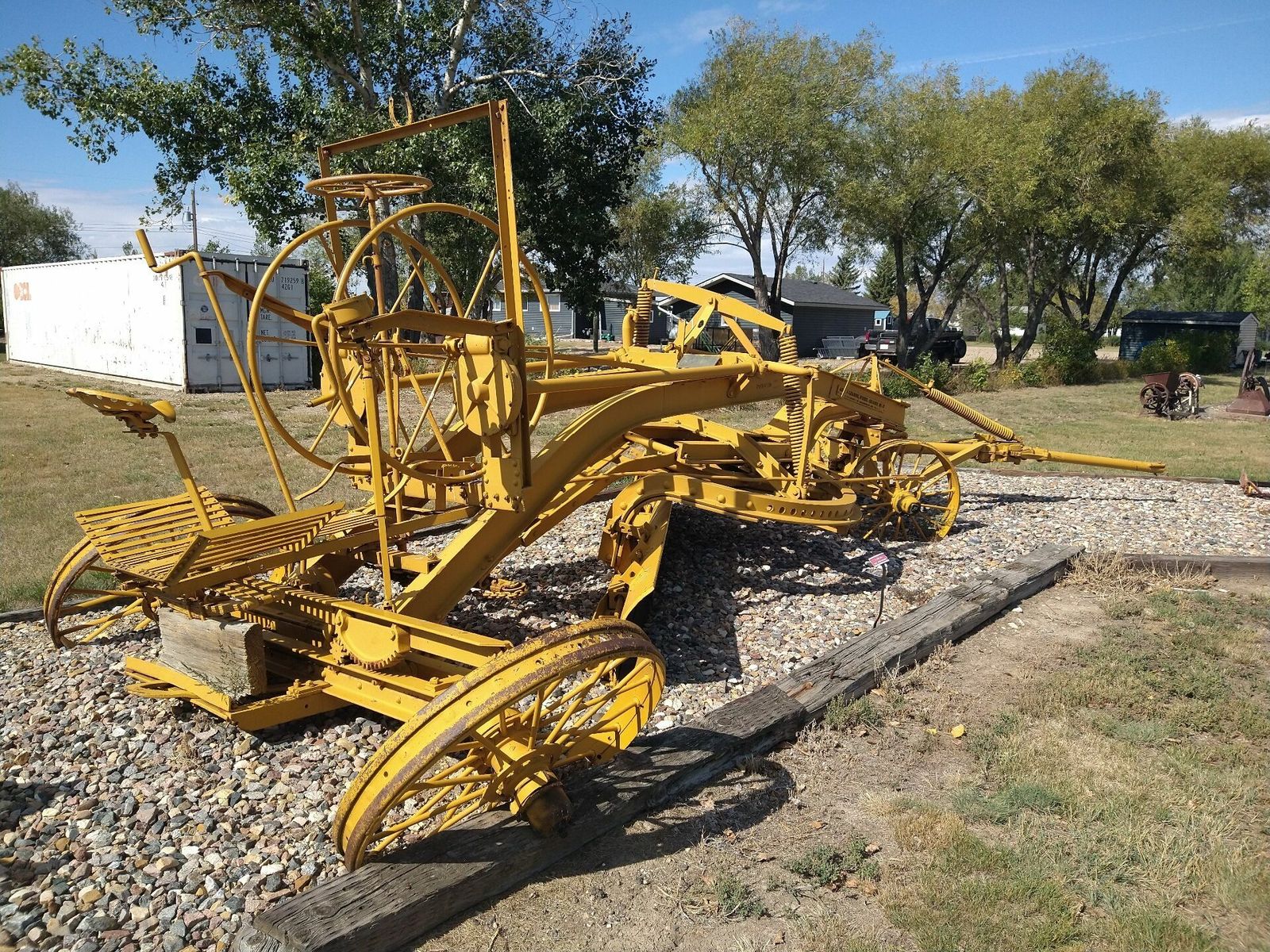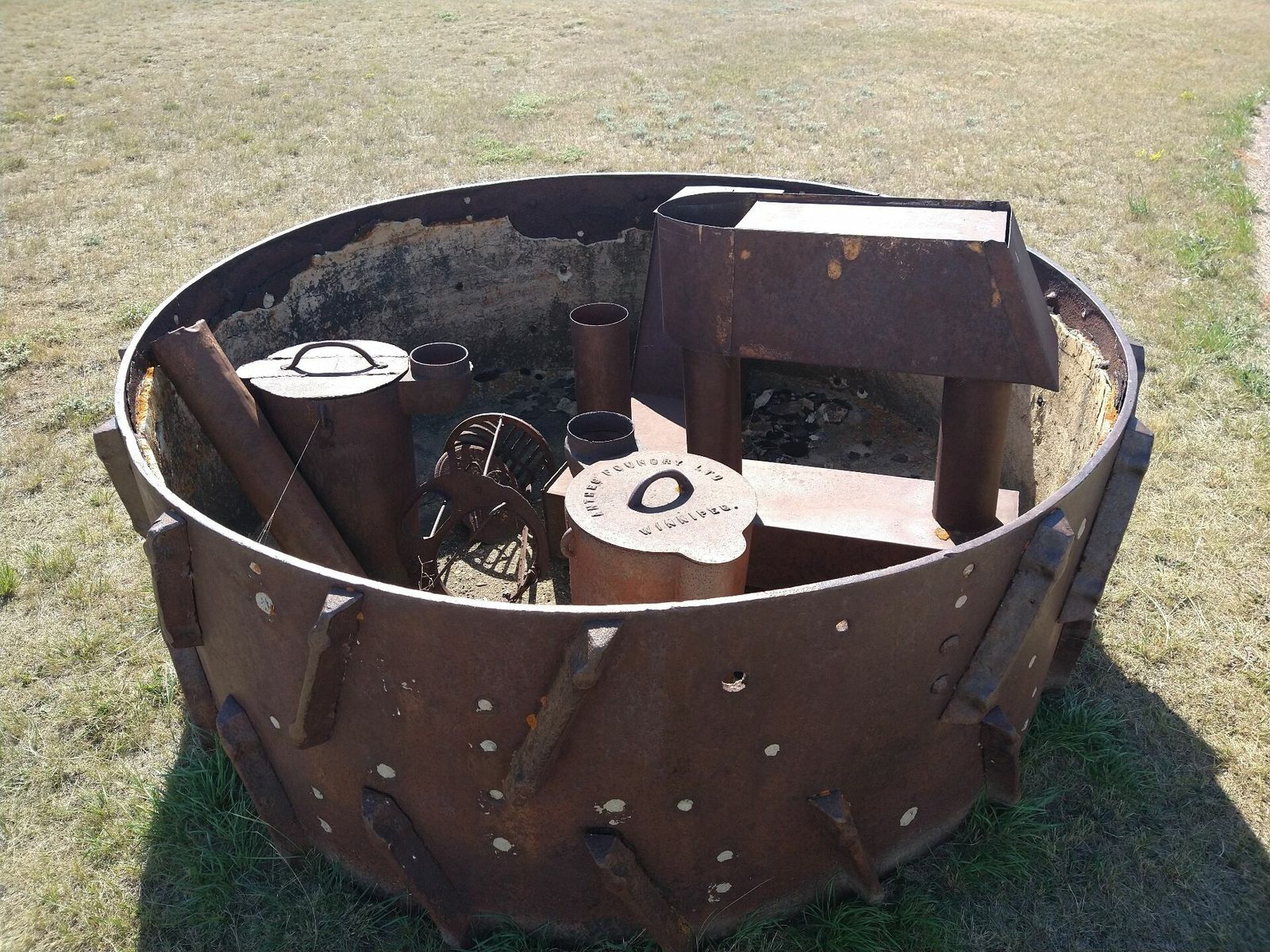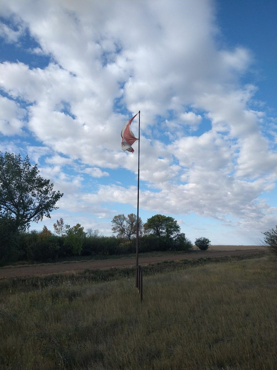 I turned onto the highway to Etzikom, and had to wait by the side of the road to let half of a big house go by, on a big trailer. Strange but kinda cool. I rolled on to town at a decent hour. I hoped that the Windmill museum would have at least bathroom water, but they were closed for the season. Drat. I did get to see all the outside stuff which was impressive. There were various antique metal and wooden windmills but the best one was a huge dutch style one. I poked around the building but didn't see a faucet. I then rode through town and they had a small park but no water. And a small church in disrepair but no dice there either. I rolled on, I still had 4 liters, and only about 40 miles left.