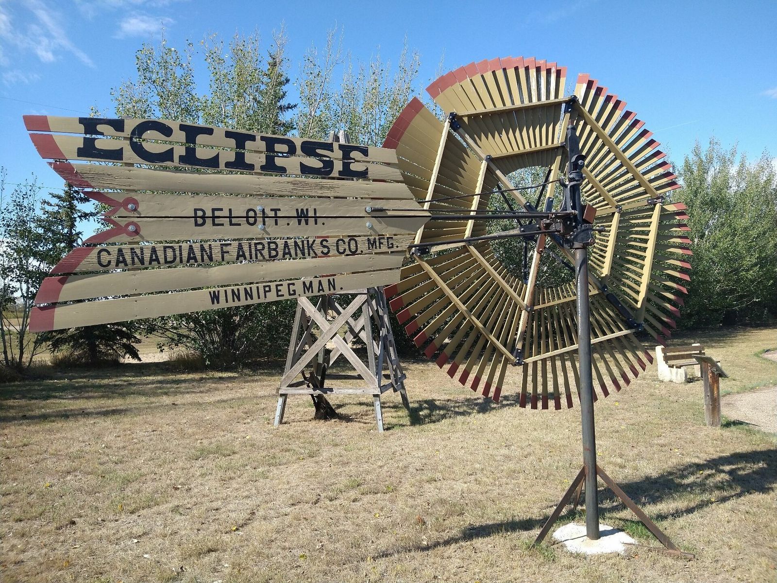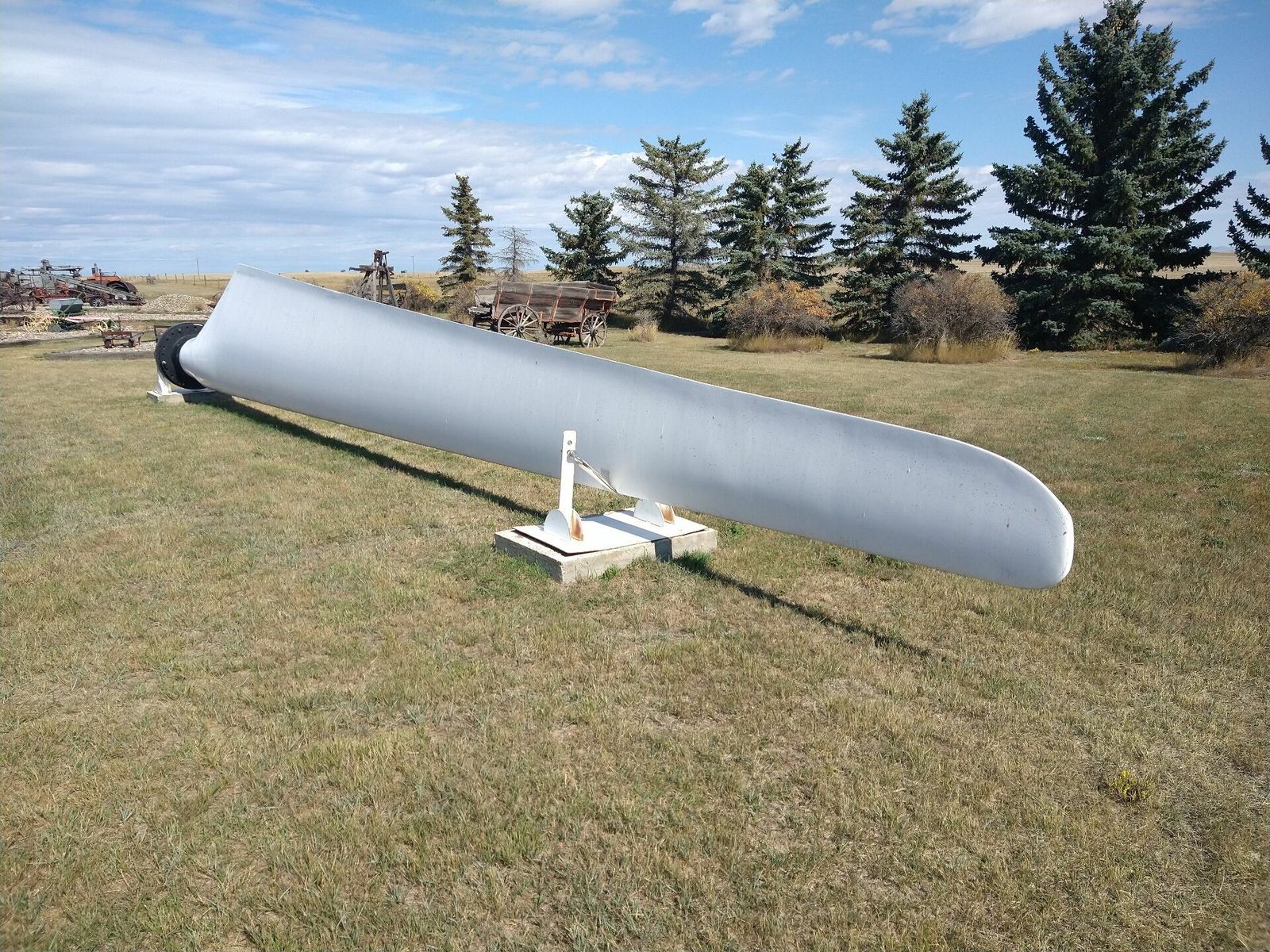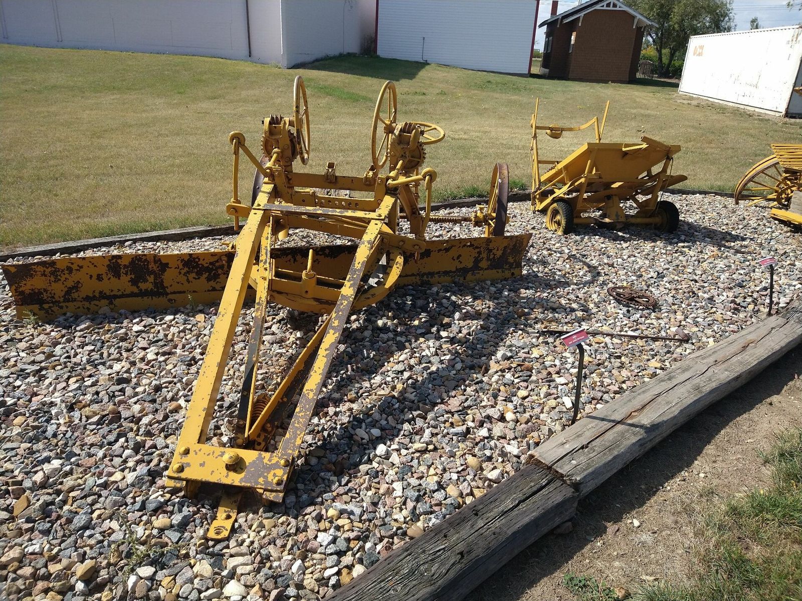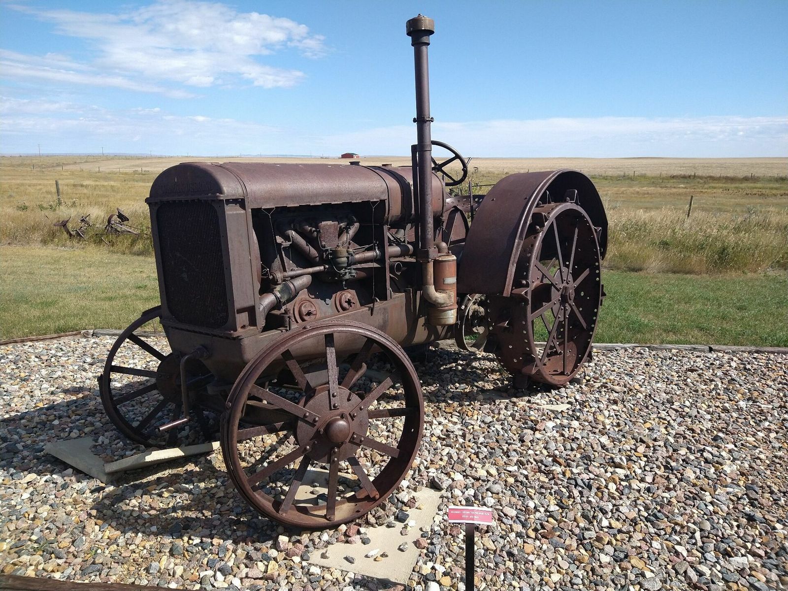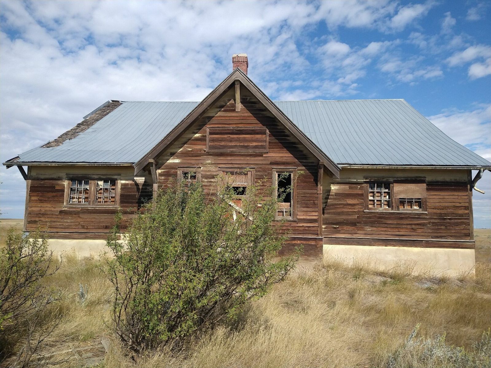 I turned onto the highway to Etzikom, and had to wait by the side of the road to let half of a big house go by, on a big trailer. Strange but kinda cool. I rolled on to town at a decent hour. I hoped that the Windmill museum would have at least bathroom water, but they were closed for the season. Drat. I did get to see all the outside stuff which was impressive. There were various antique metal and wooden windmills but the best one was a huge dutch style one. I poked around the building but didn't see a faucet. I then rode through town and they had a small park but no water. And a small church in disrepair but no dice there either. I rolled on, I still had 4 liters, and only about 40 miles left.