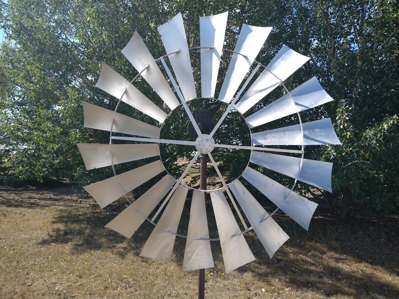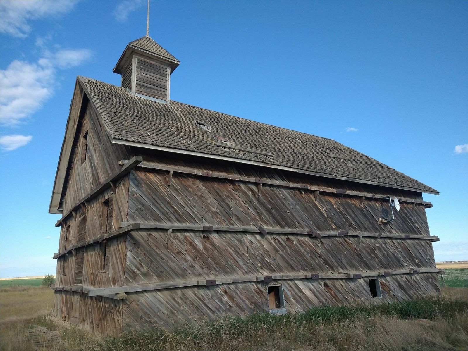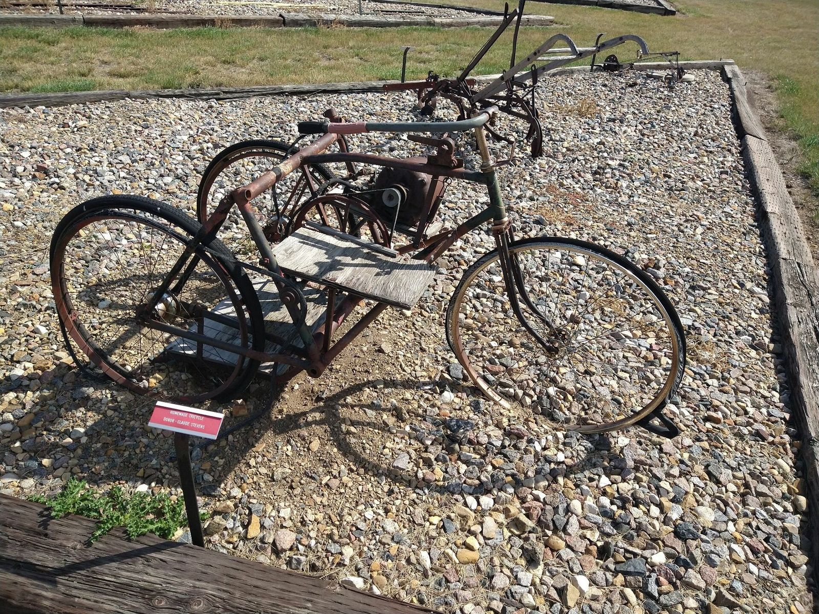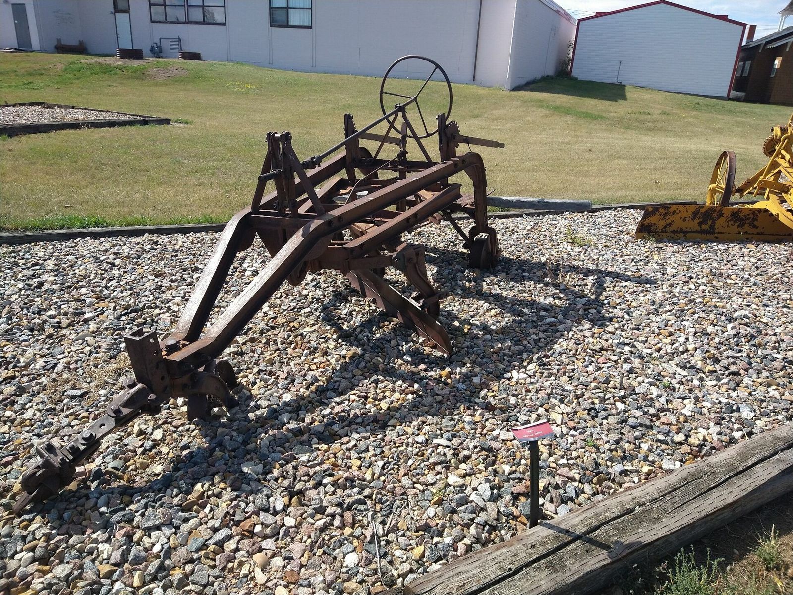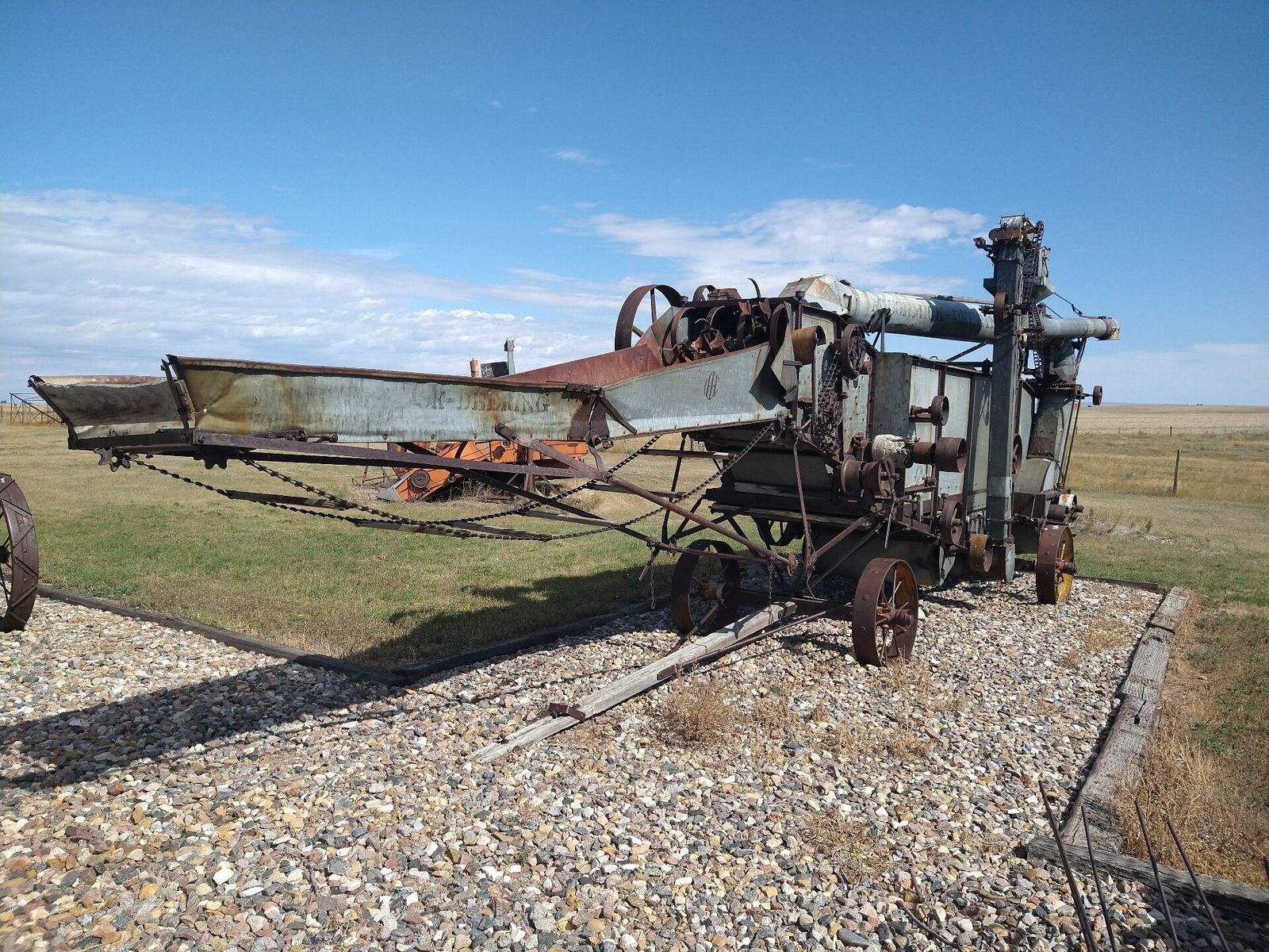 I turned onto the highway to Etzikom, and had to wait by the side of the road to let half of a big house go by, on a big trailer. Strange but kinda cool. I rolled on to town at a decent hour. I hoped that the Windmill museum would have at least bathroom water, but they were closed for the season. Drat. I did get to see all the outside stuff which was impressive. There were various antique metal and wooden windmills but the best one was a huge dutch style one. I poked around the building but didn't see a faucet. I then rode through town and they had a small park but no water. And a small church in disrepair but no dice there either. I rolled on, I still had 4 liters, and only about 40 miles left.