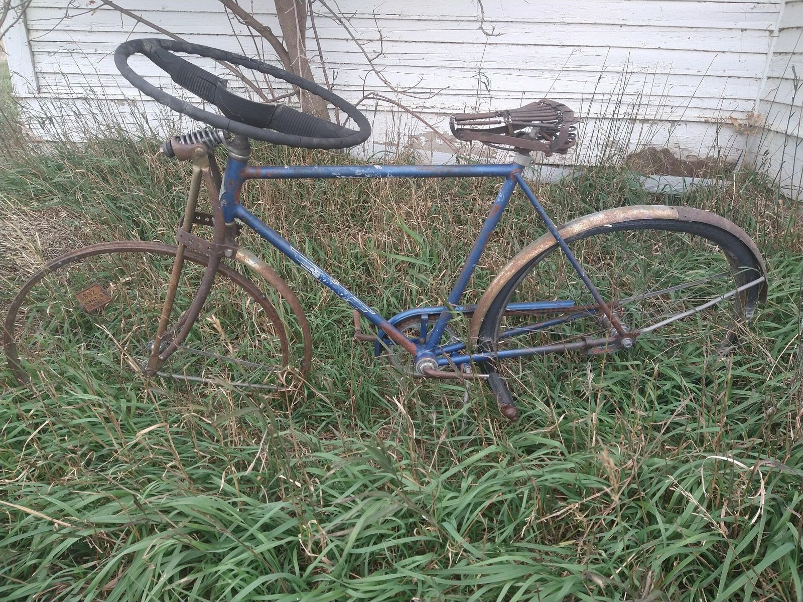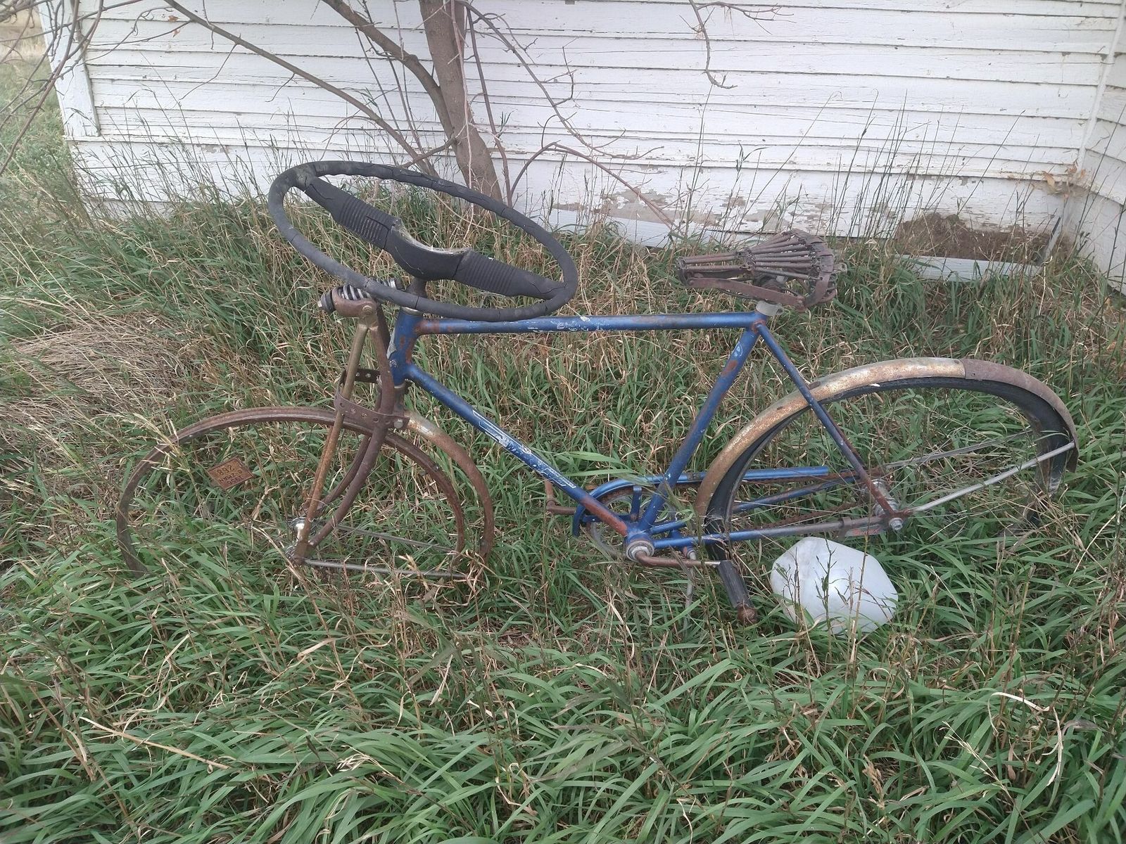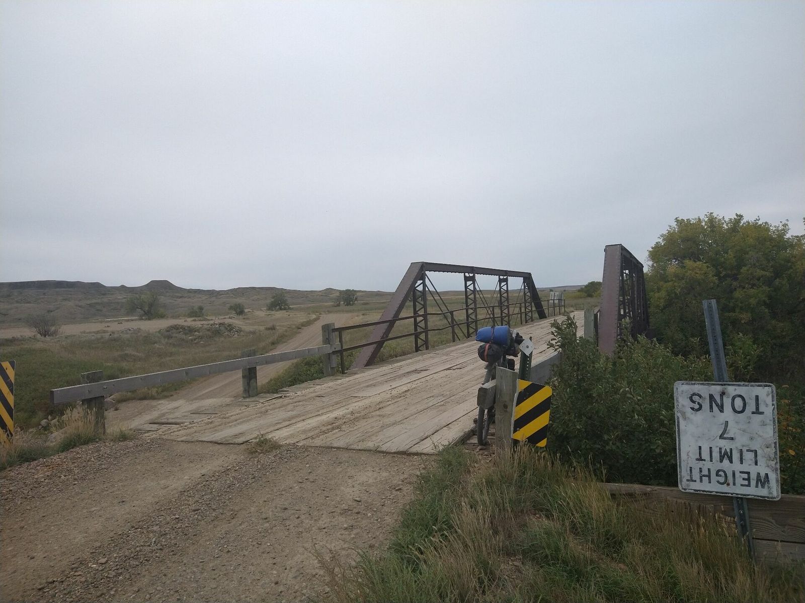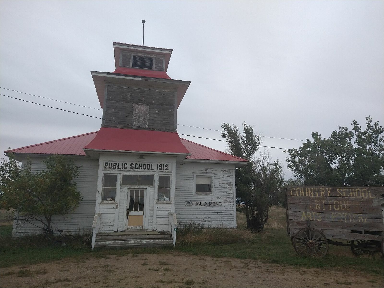 I took a gravel detour soon after my first town of Saco, and I ended up stopping at a nice little store in Hinsdale for a snack around noon. I soon turned off again on gravel and rode through a ghost town called Vandalia on the Milk river and by the railroad. There was an old school and an old post office, and a couple houses. In front of the school was an old bike that had a truck steering wheel welded onto the stem. Next town of Tampico had a historical marker but not much of anything else. It told of boom times as homesteaders moved in in the early 20th century, only to leave soon after they figured out how hard it is to farm here.