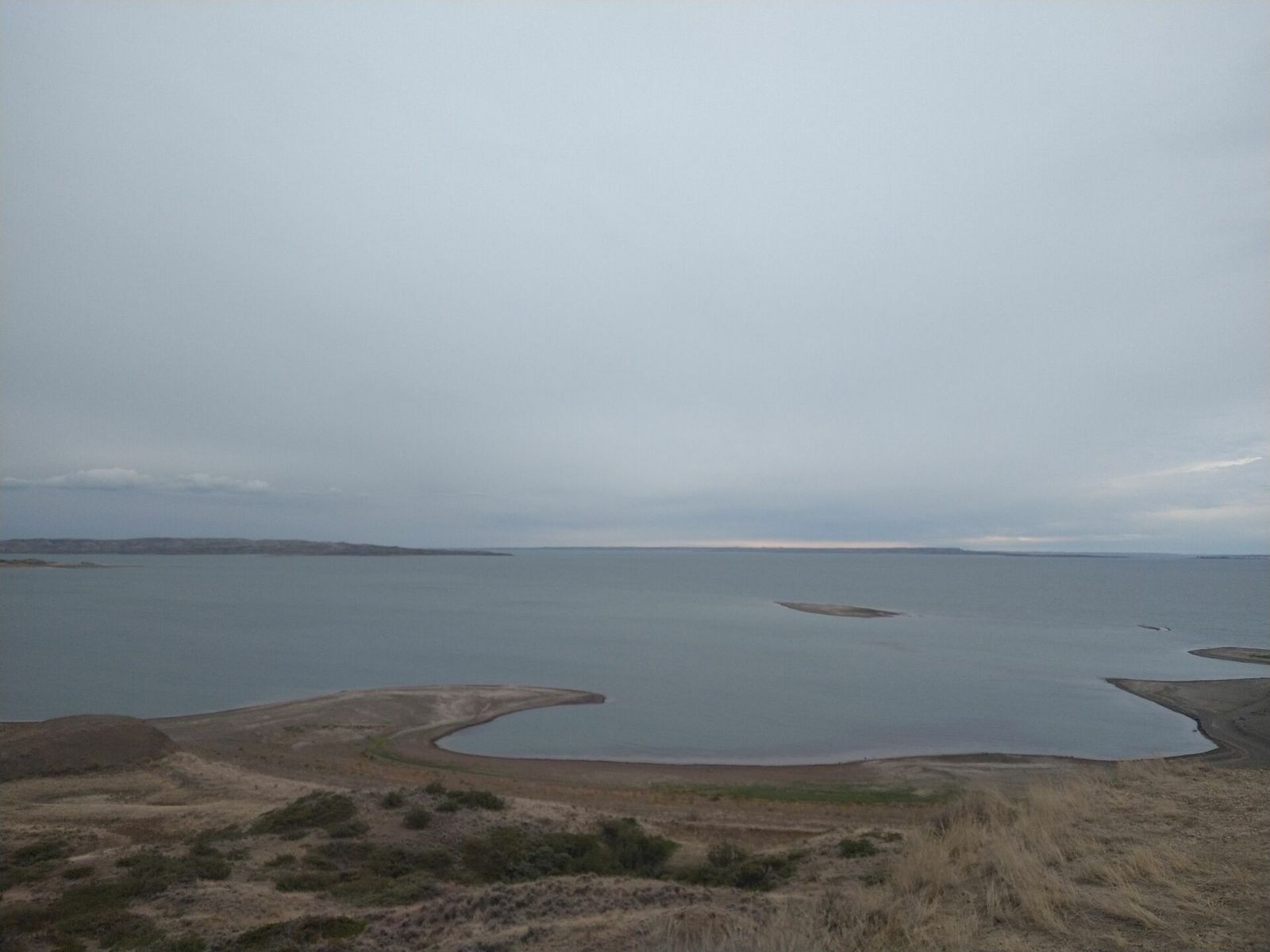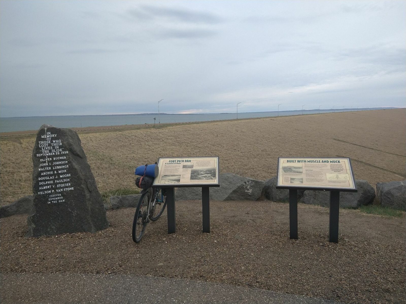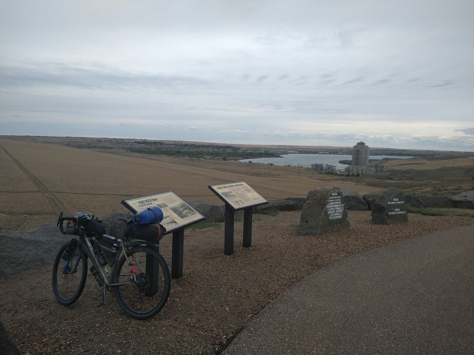 Fort Peck, turned out to not have a store open in Sunday but I had plenty anyway so I rolled on. The official Army Corps campgrounds looked full and I wanted to camp alone anyway. I knew from my maps that tons of public lands were on the other side of the lake. So I climbed a steep hill to get onto the huge dam spillway, and there were a couple of nice overlooks along the way. Apparently Fort Peck dam was built during the New Deal and had more workers than any other project at that time. It's the fifth largest artificial lake in the US. The Missouri river. Also of note is that it flows north here.