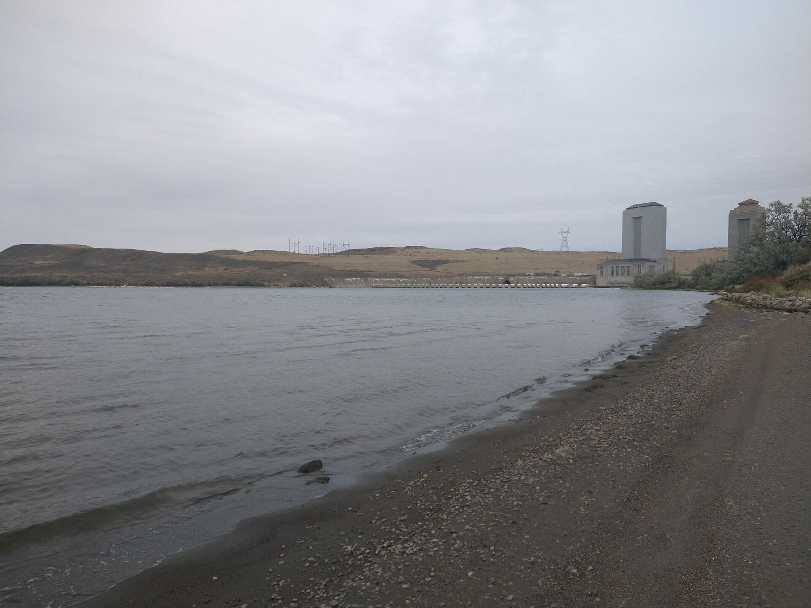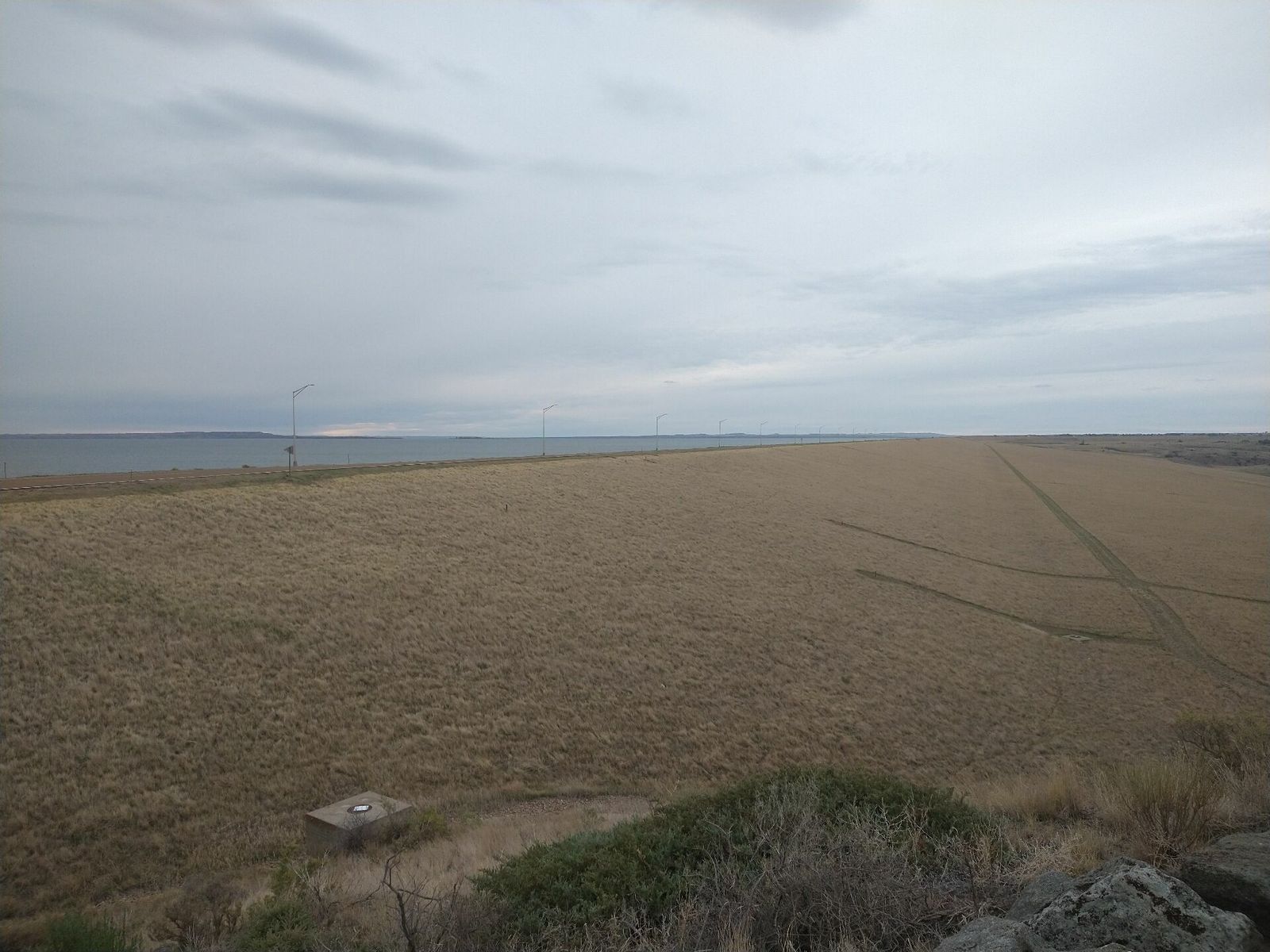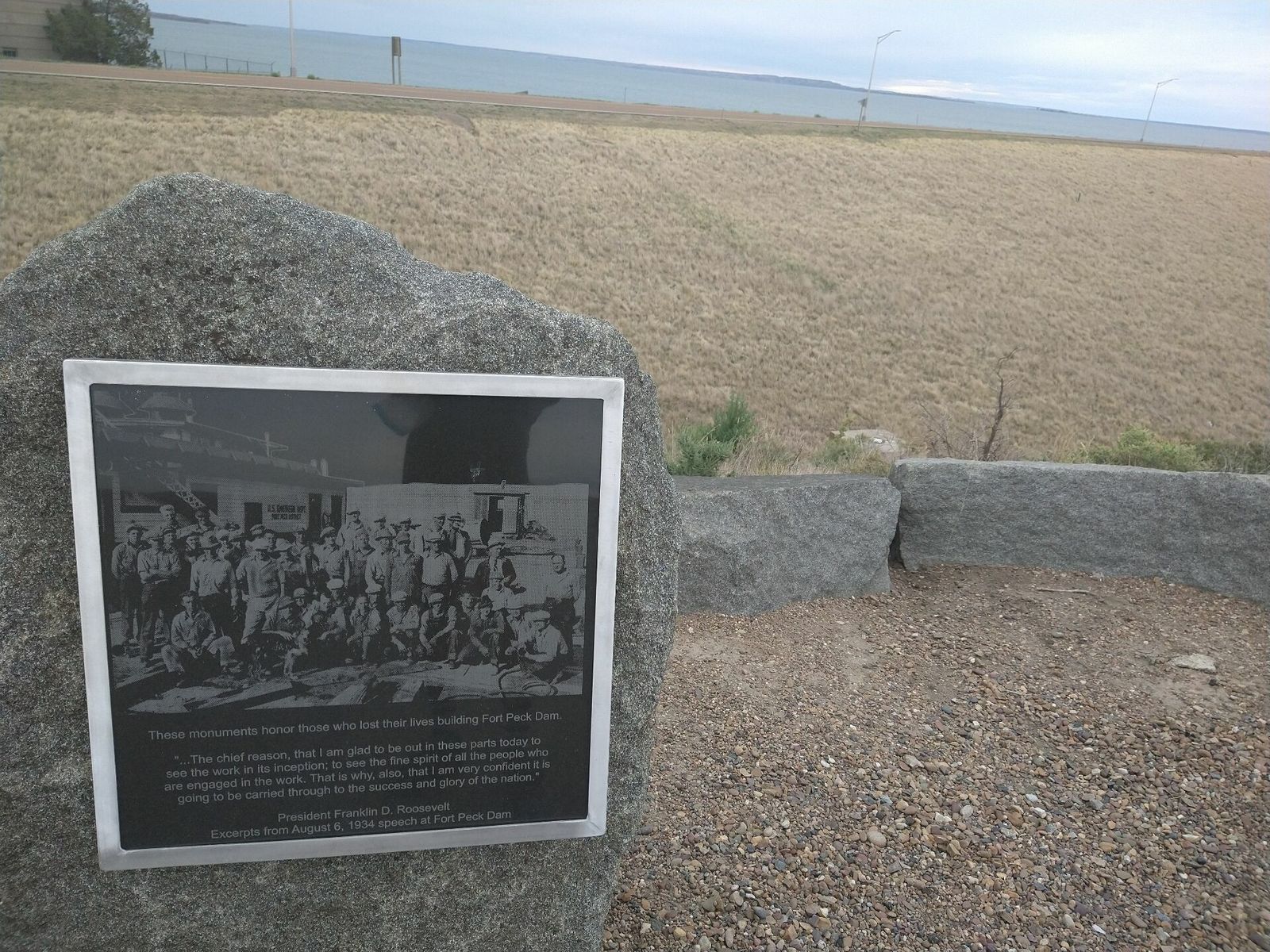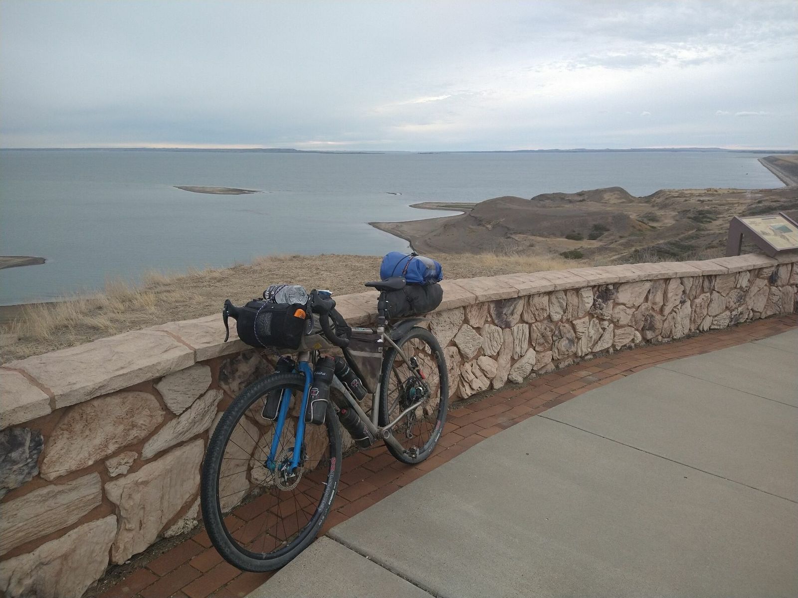 Fort Peck, turned out to not have a store open in Sunday but I had plenty anyway so I rolled on. The official Army Corps campgrounds looked full and I wanted to camp alone anyway. I knew from my maps that tons of public lands were on the other side of the lake. So I climbed a steep hill to get onto the huge dam spillway, and there were a couple of nice overlooks along the way. Apparently Fort Peck dam was built during the New Deal and had more workers than any other project at that time. It's the fifth largest artificial lake in the US. The Missouri river. Also of note is that it flows north here.