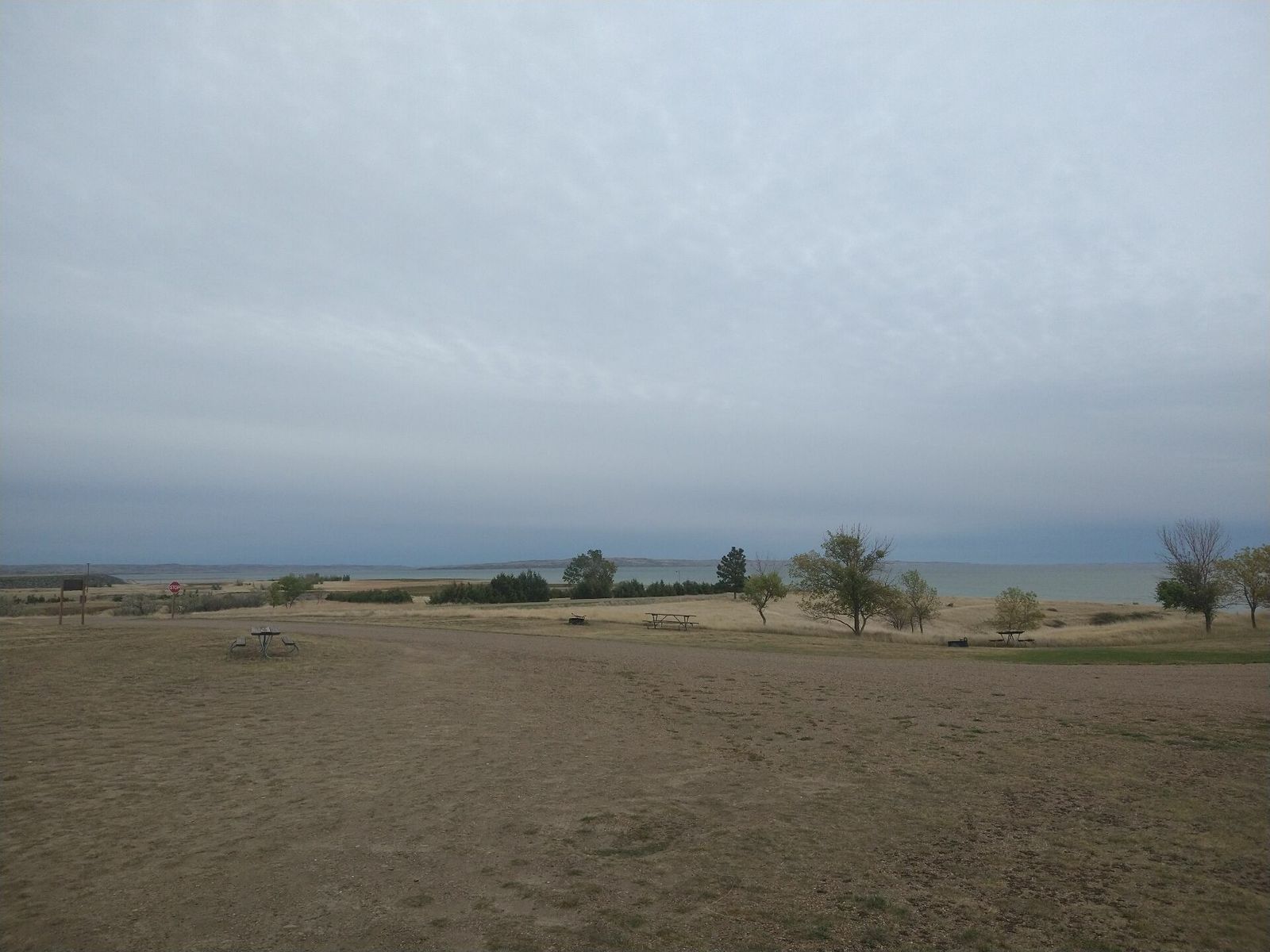 So I rode on down the road to the east side of the lake and found a nice little spot hidden from the road on a small pond dam for cattle water. On the edge of the Army Corps property and some state lands. There are actually some small trees here to block what little wind is left in the evening. Have a great view of the lake and sunset.