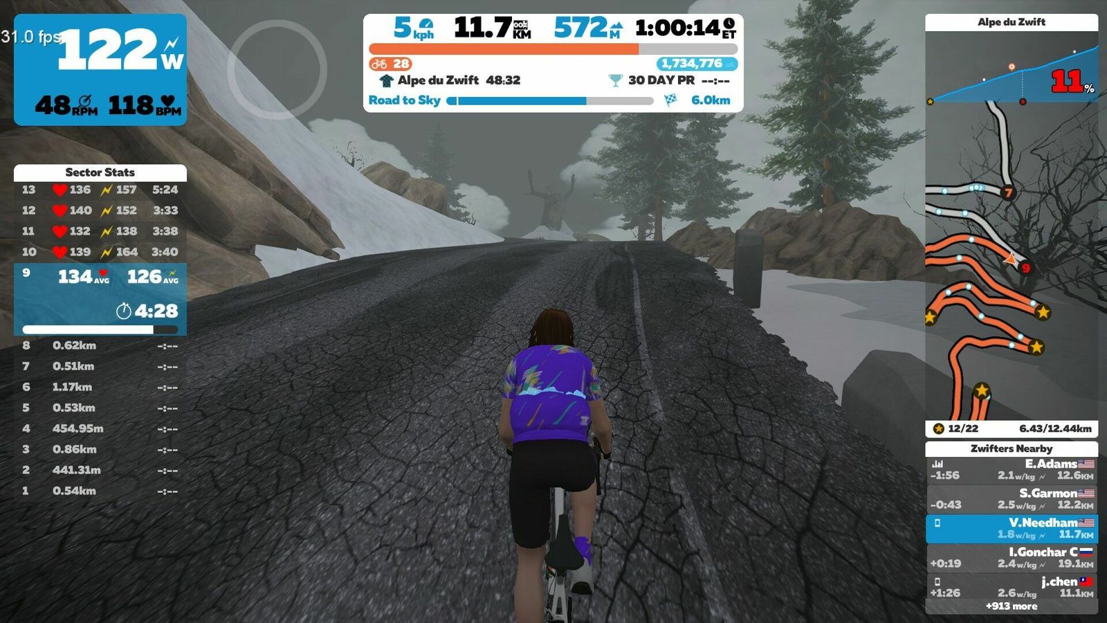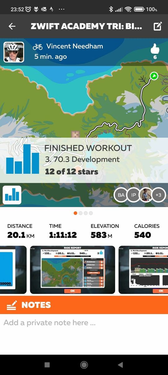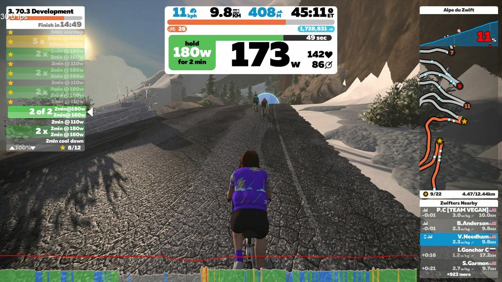 (NB: I let my Garmin battery run dry, so all data for this ride is from Zwift.) A long, dull slog that lets your mind wander to elemental questions like "Did Jimi Hendrix ever record acoustic?". The answer is yes, but they're really rare. "This session is typically known as an up-and-under session, where you perform periods of time slightly over and then slightly under 70.3 race pace power. This is a great way to get more comfortable at your 70.3 pace, while also improving that number. Here, you will be doing 8-minute reps — two rounds of 2 minutes above (around 90% FTP) and two rounds of 2 minutes below (around 80% FTP) 70.3 race pace. From a physiological perspective, these sessions help promote fat oxidation and structural changes at a muscular level."