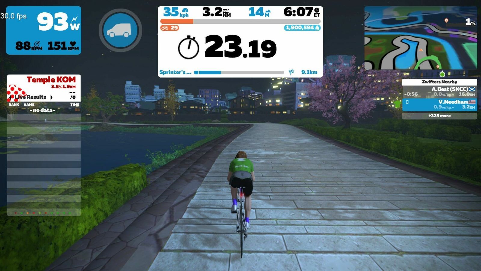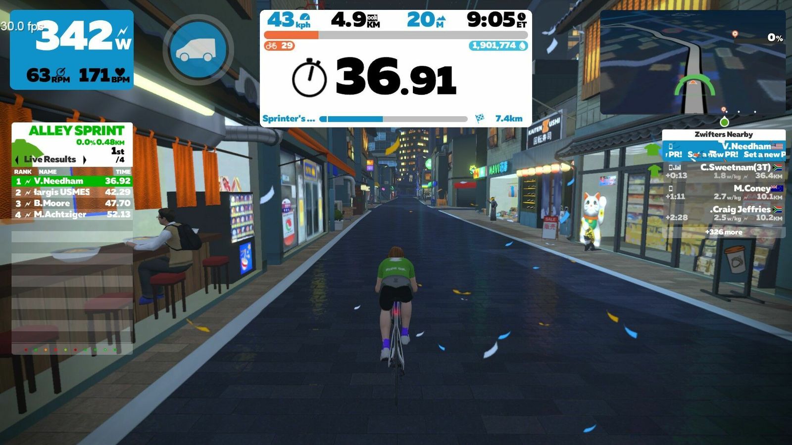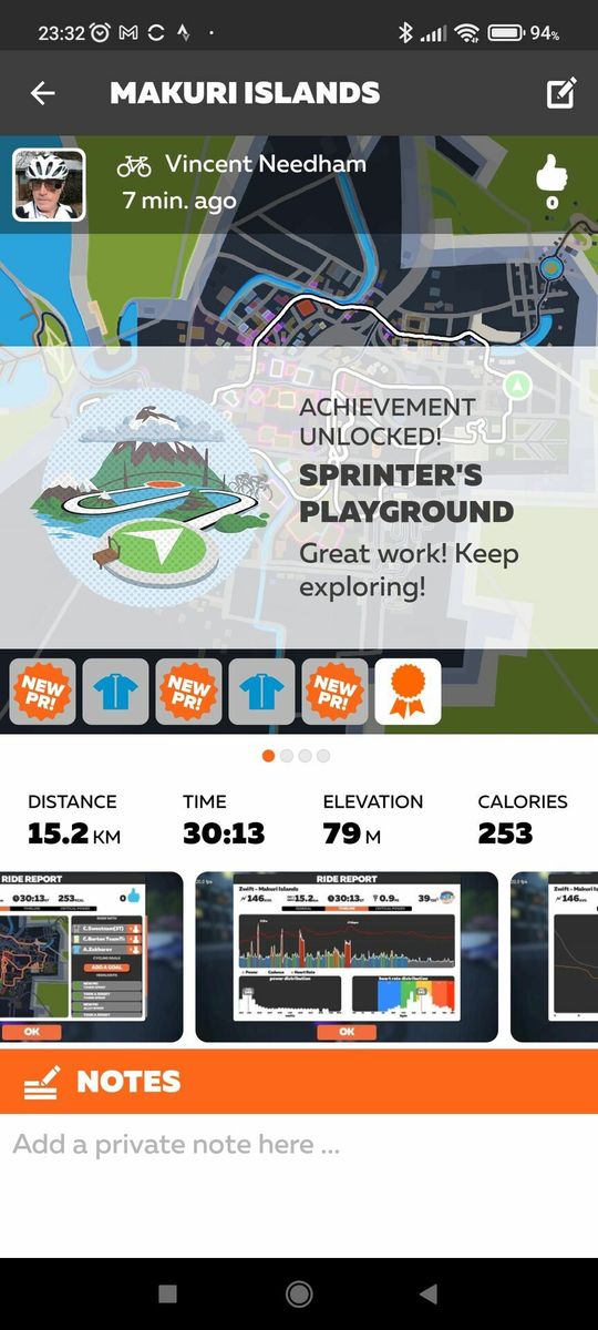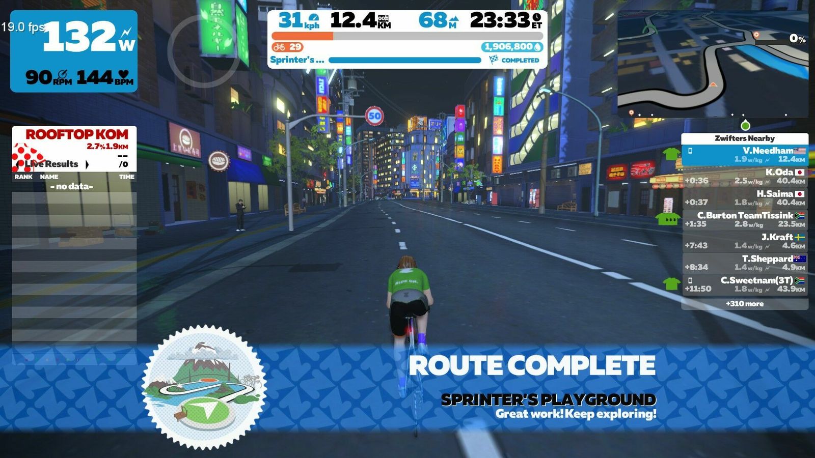 I didn't realize it had gotten this late. I intended to do a couple of short new Makuri routes, but one will have to do. That's the "Sprinter's Playground", a flat 12 km course with like four different sprints on it. Perfect for testing my new Favero Assiomas against the NeoBike! Really hammered some of these sprints to get some nice peaks in the data.