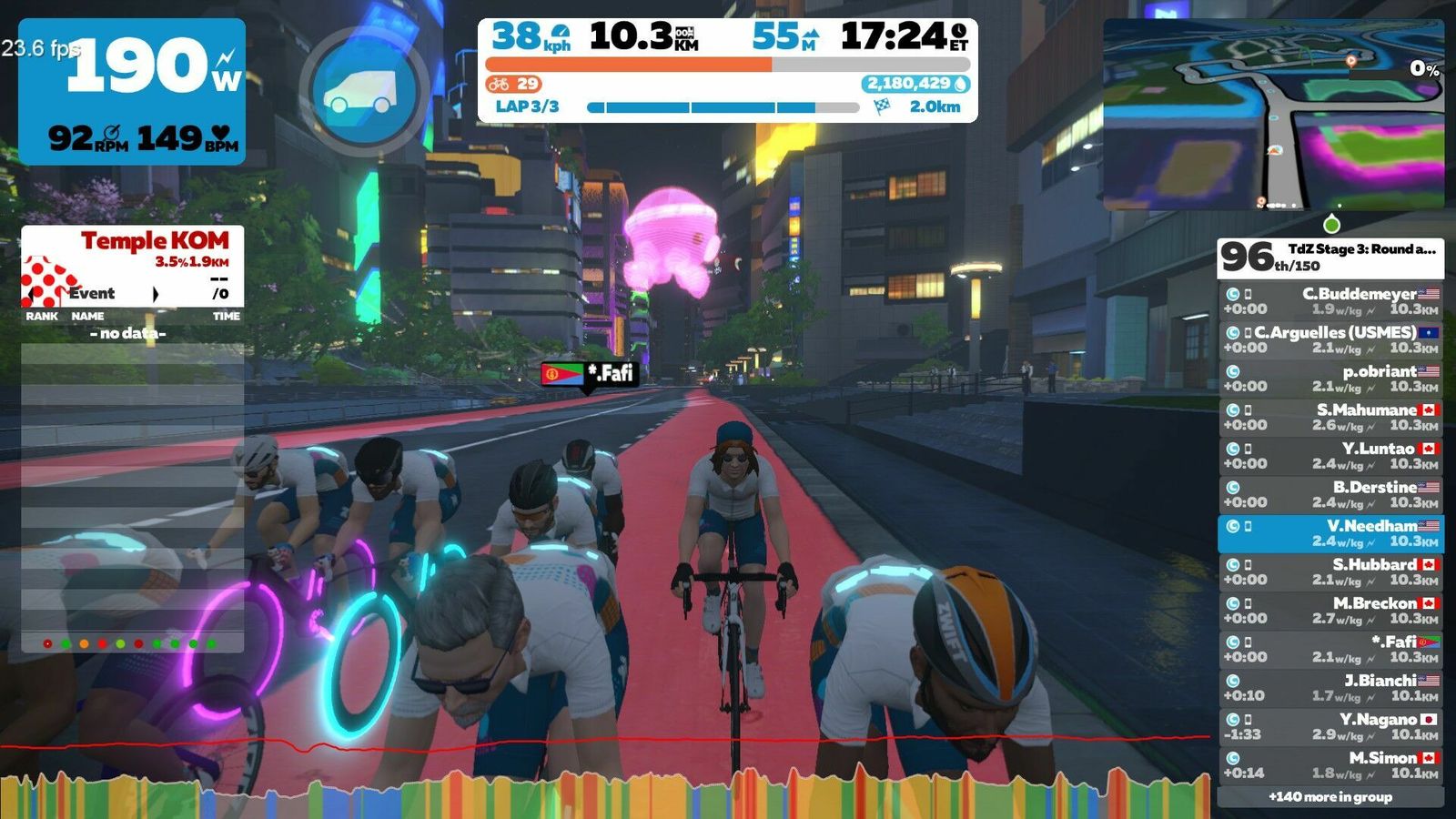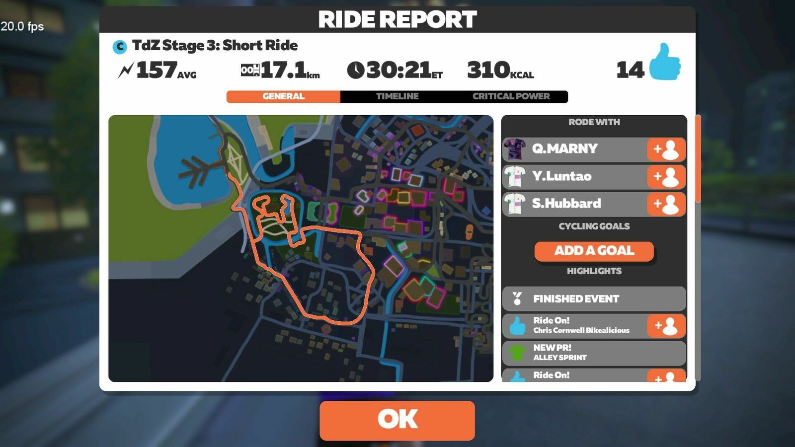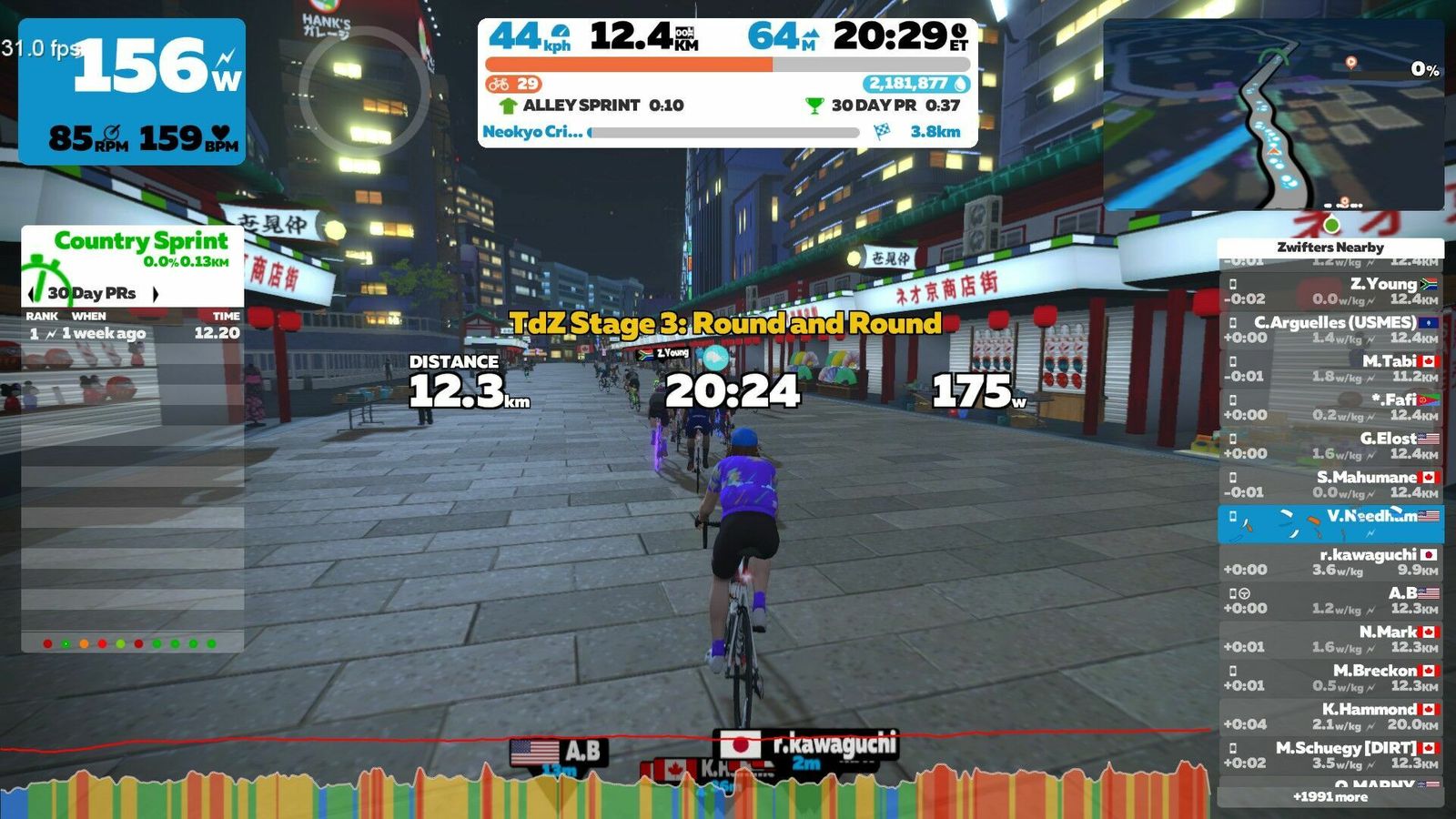 On tonight's stage of the TdZ we went "Round and Round" on the new Neokyo Crit Course. Lots of riders blobbing and taking advantage of the double draft, so it was a fast three laps for the official event. I did an extra lap to cool down and pad out the time and distance.