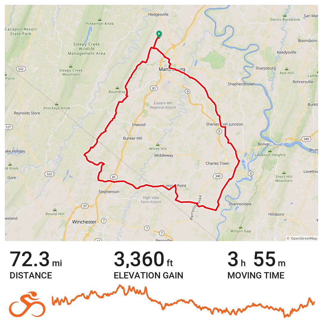 I put this ride together to prepare me for some upcoming centuries. Most of the roads I've traveled before, but several, including those in Virginia, are new. I was surprised by the beauty of the ride. And the hills we're not killer...just enough for a good workout. I'll definitely ride this route again.