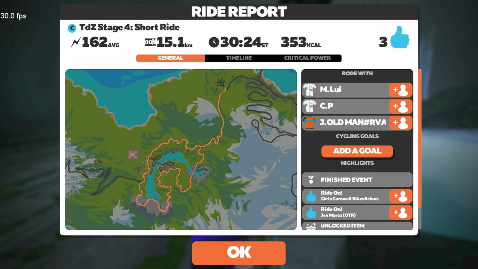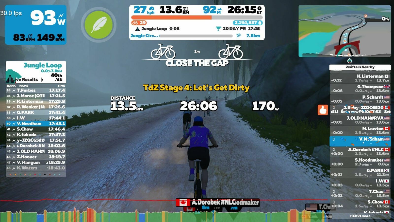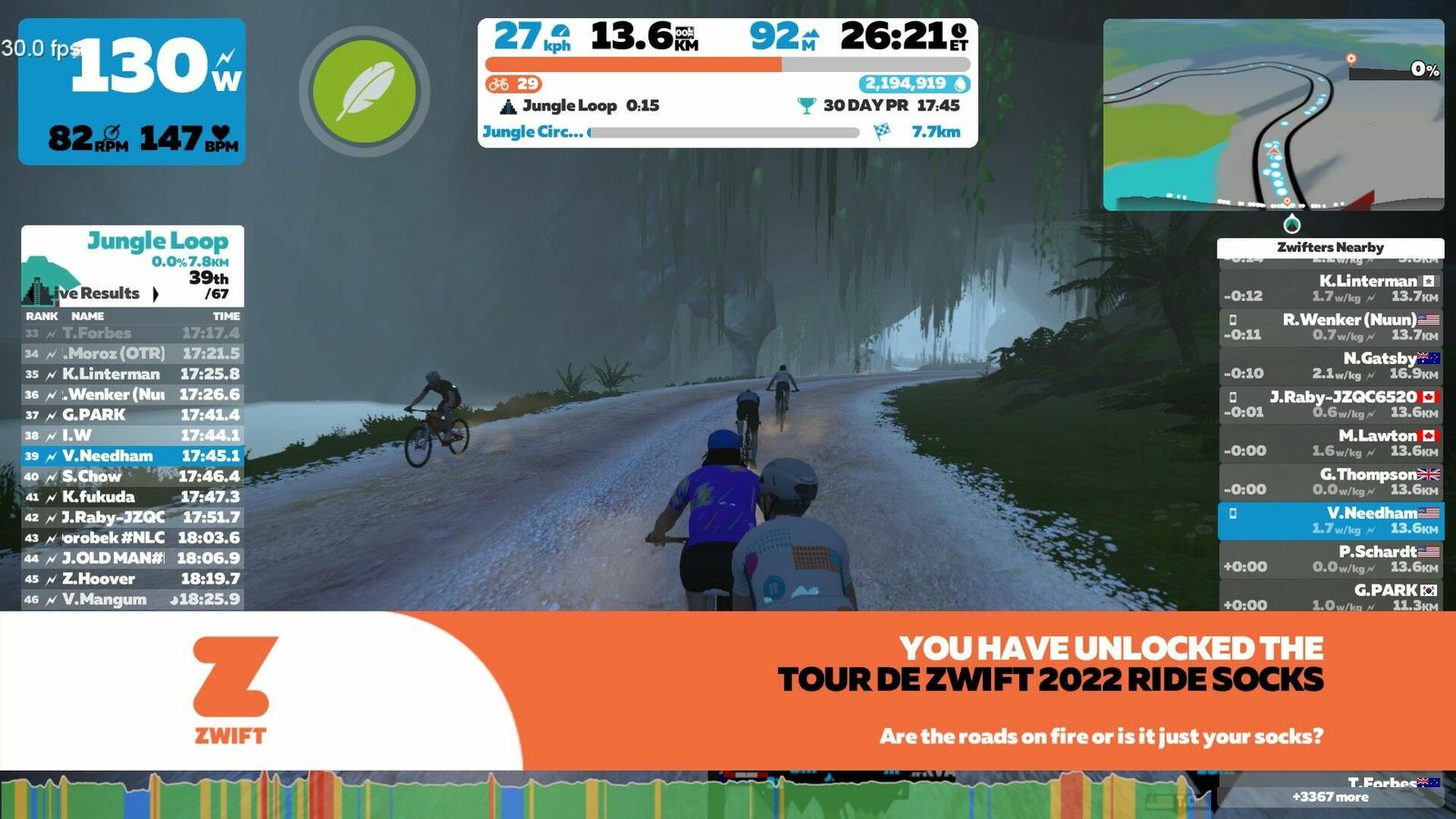 Originally intended to do the Jungle Loop for Stage 4 of the TdZ at 1600 hrs, but my network had other plans. Somehow only the Zwift box got its connection mangled and it took time to figure that out, restart the router and make sure everything was happy again. So we rode with about 150 others on the 1800 hrs start. Rode the jungle on the MTB, earning socks in the process. Changed to the new socks afterwards, and changed back to the Aeroad and Zip[p 808s, too. Don't want to be accidentally riding any TTs on an an MTB!