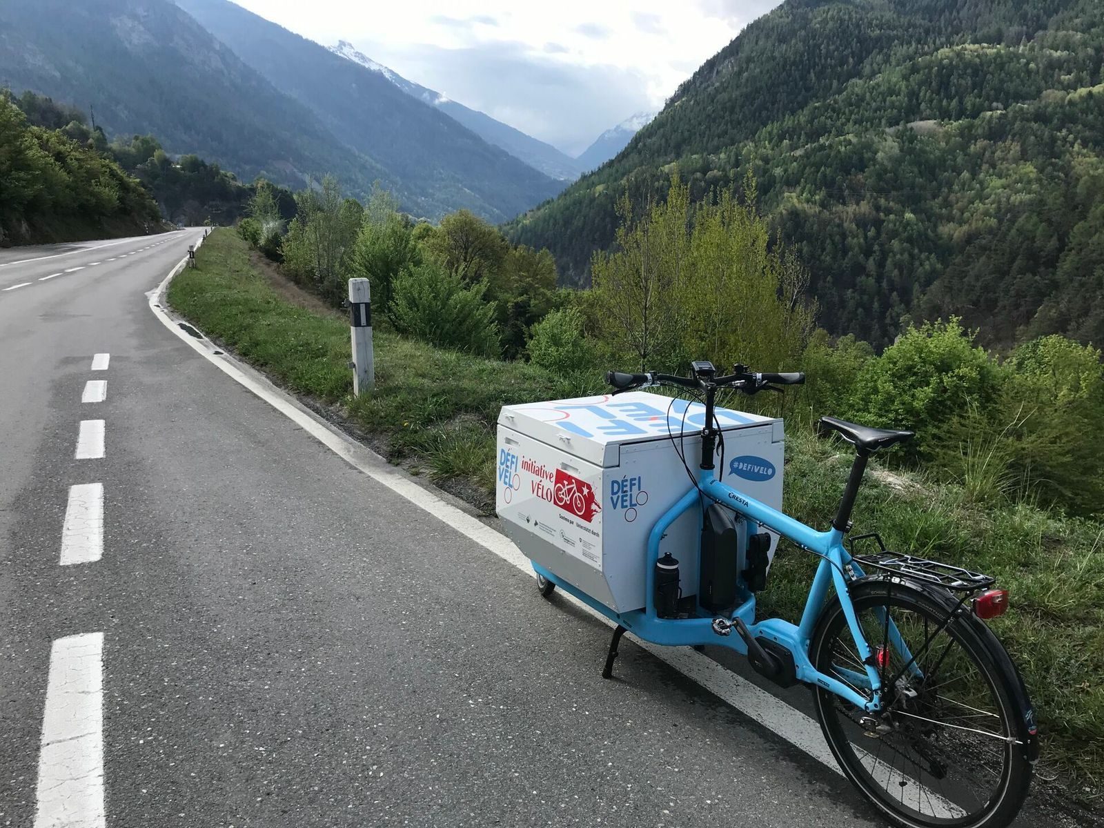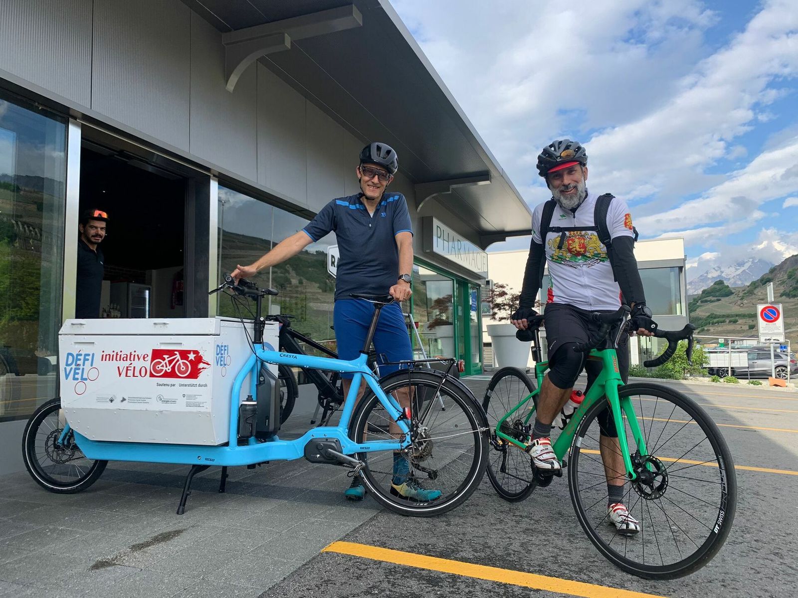 Avec le cargo ini-velo-vs.ch pour récolter quelques bonnes dizaines de signatures. Photos Lucien Barras, entre autres. Merci à https://www.ciclissimo.ch/valais pour le café!