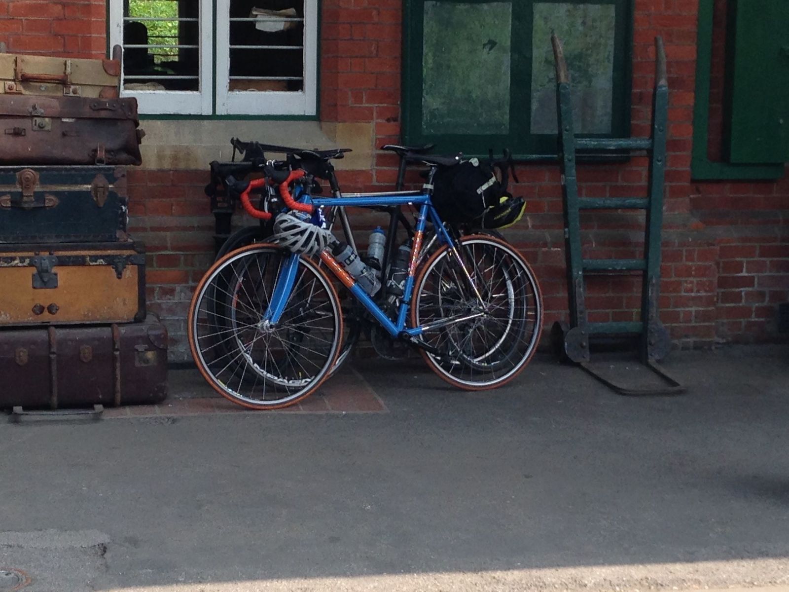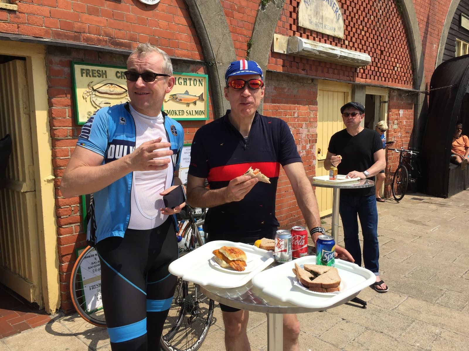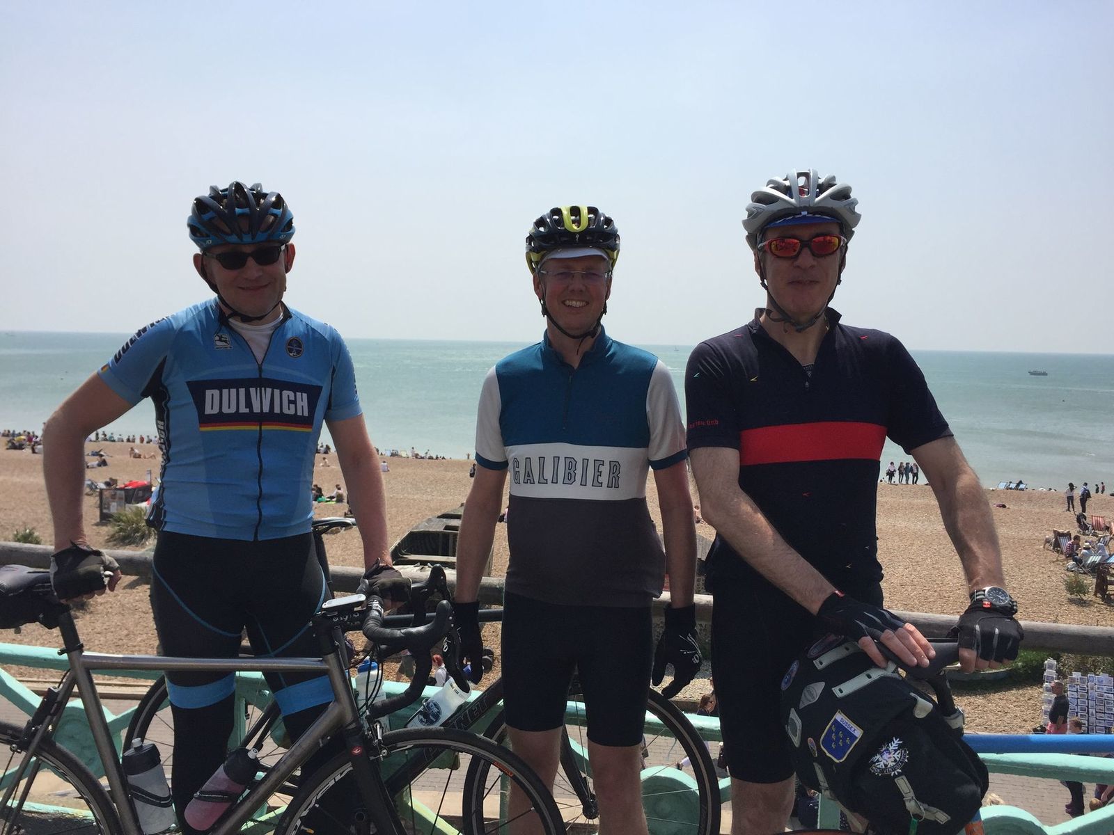 Swept up Joel at Horsham station and headed south. Refreshments at Horsham Pavilion cafe, Brighton seafront smoked fish cafe, Horsted Keynes (Bluebell) station cafe. Northerly head wind all the way back north - 2 points of wit-beer did not touch the sides at ride's end at pub in London.
