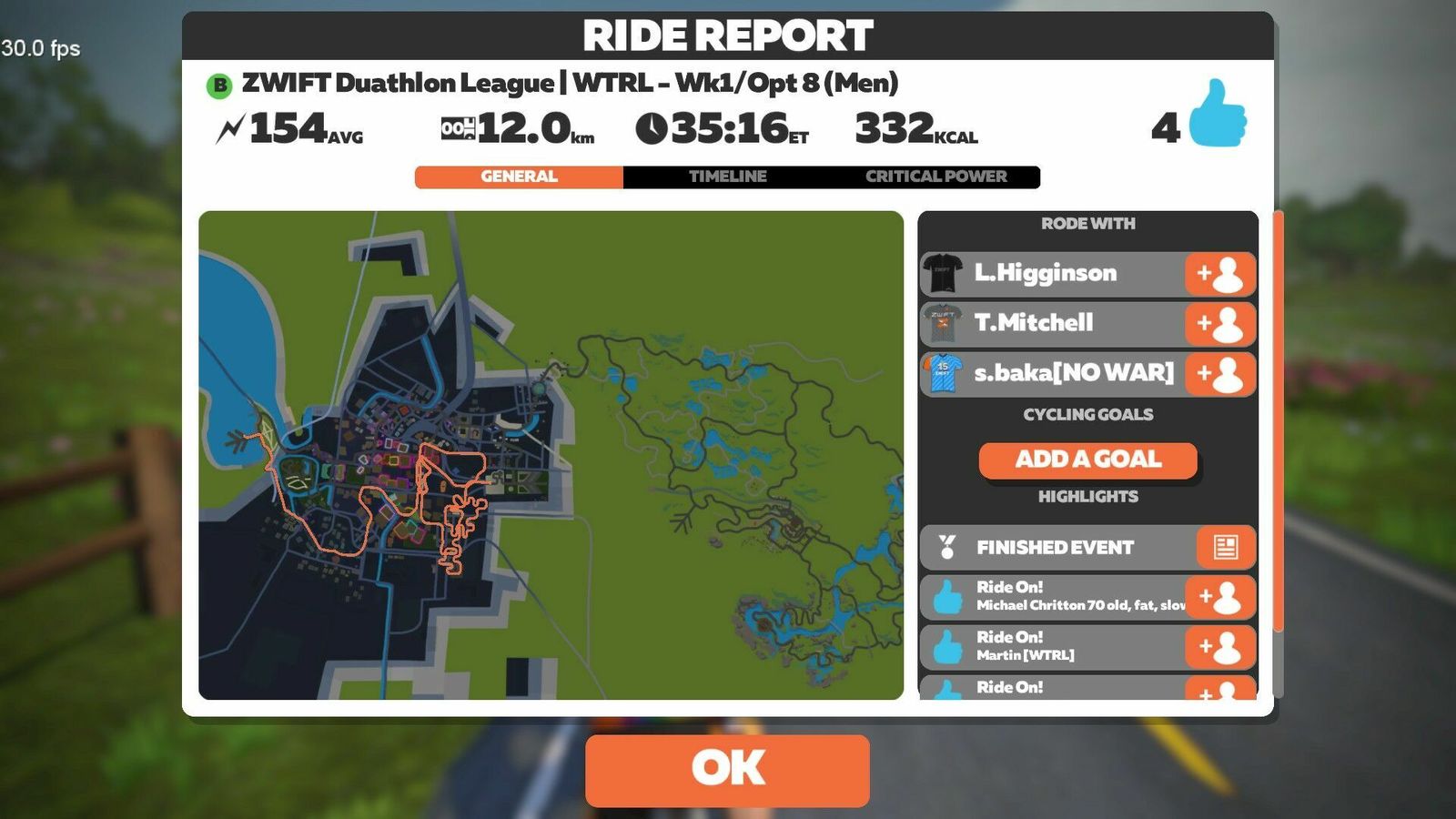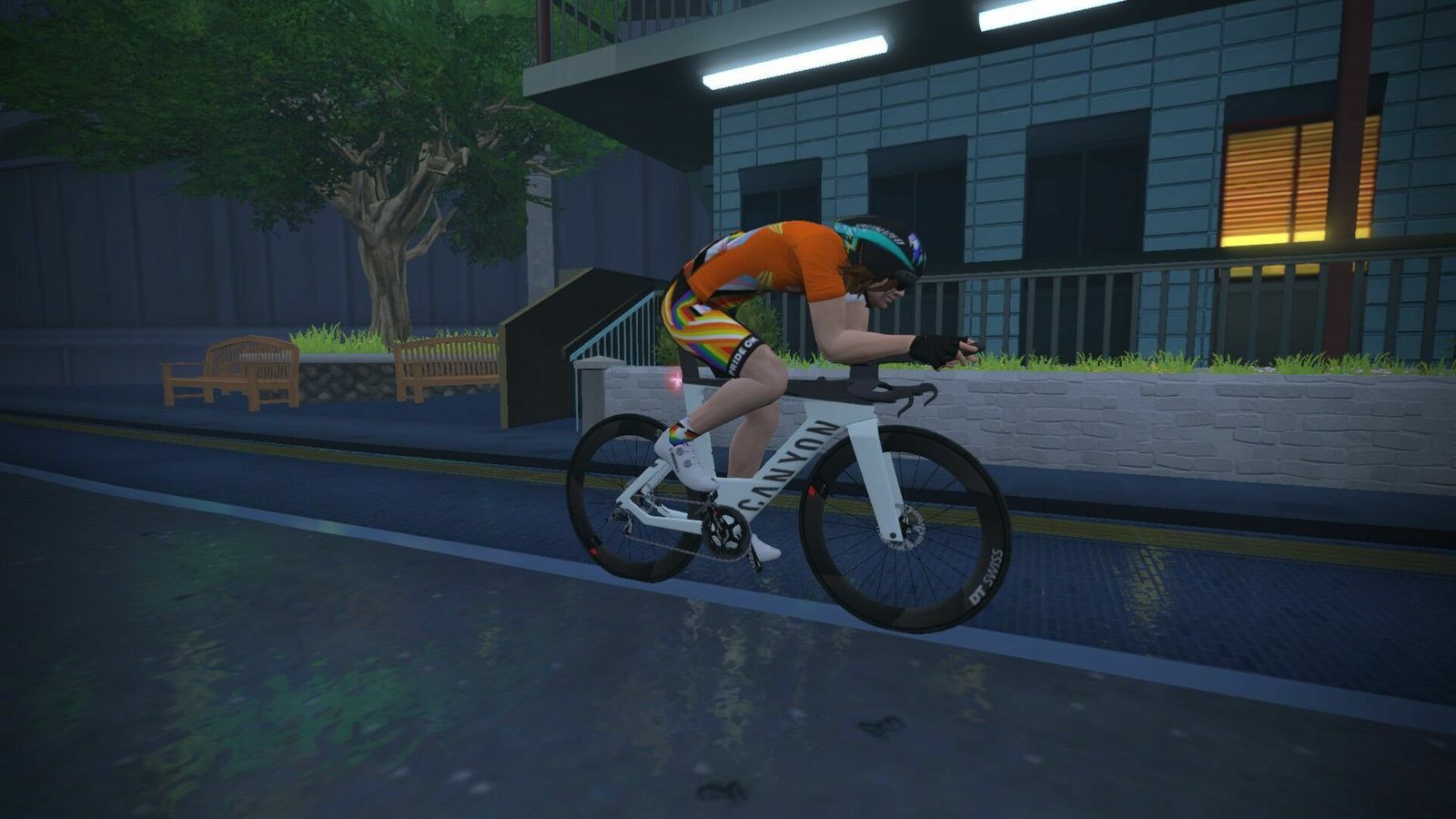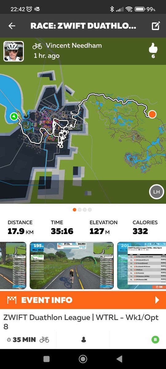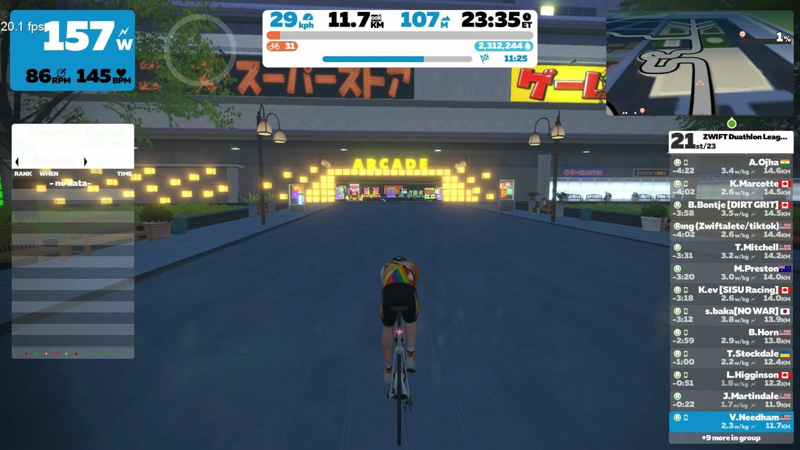 Not a bad debut for a slow, out-of-shape old man. This route had the rooftop climb on it and the option to ride a non-TT bike, though, and if that was announced I missed it. So I carried my heavy-ass SpeedMax with my deep DT Swiss wheels up over Neokyo. Otherwise I was well-prepared and things went smoothly. Ate one Gu at the start and another in the middle. Had a bottle on both machines. Had my YouTube SuperMix on both stations.