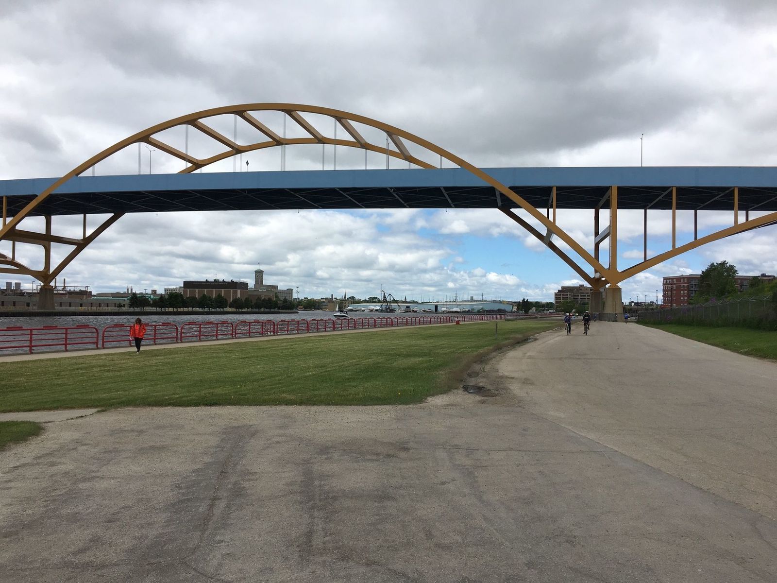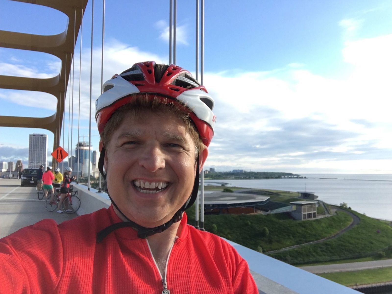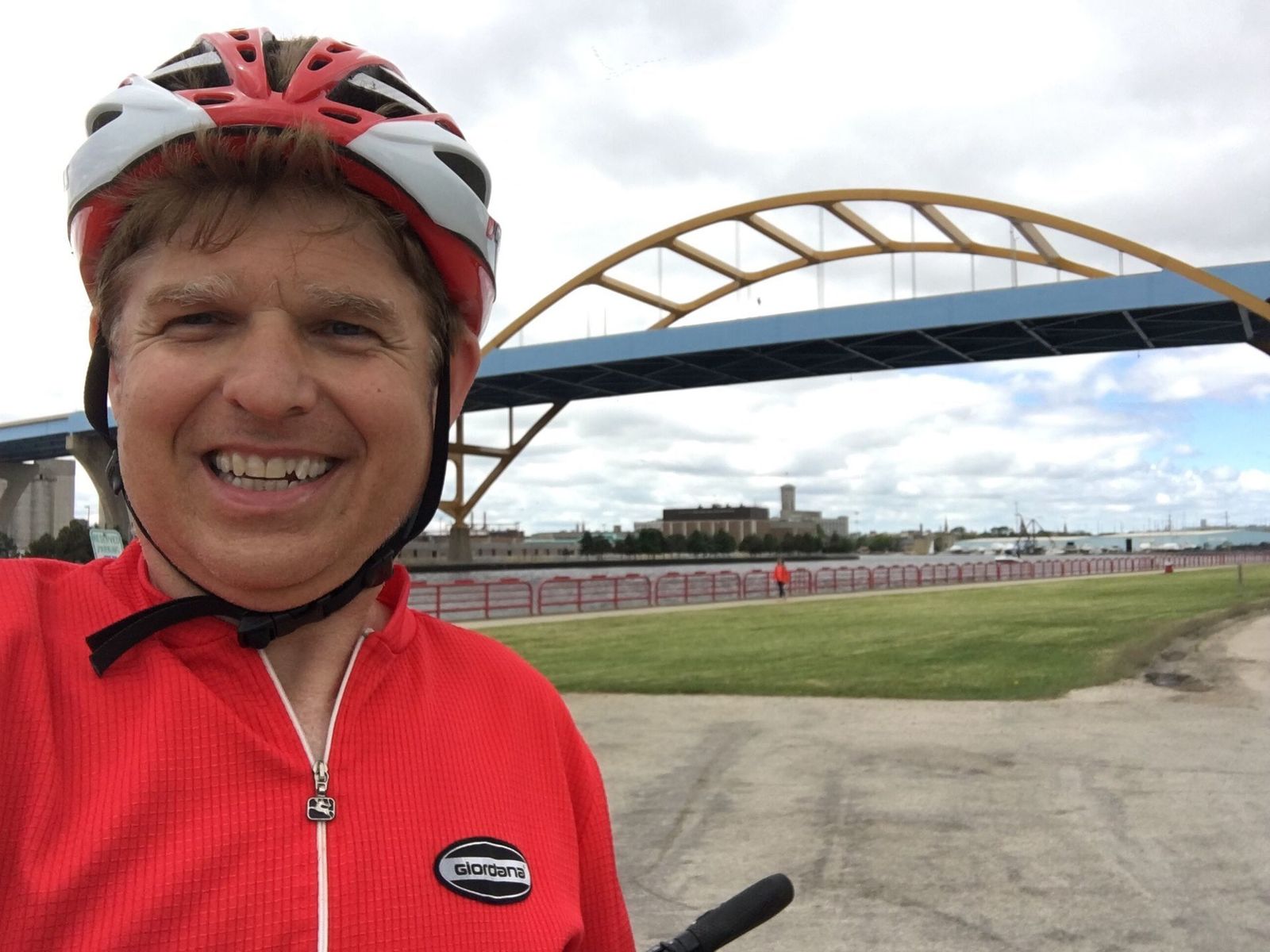 I participated in my sixth consecutive UPAF Miller Ride, which began and ended at Milwaukee's Summerfest grounds. I rode with "Team GLPA" consisting of Gary S., Dave D., Bob B., Geoff H., Todd D., and me. Retired Michigan educator Bill also rode with the main group. Bob B. and I rode the 45 mile route and the others rode the 25 mile Hoan ride. I left Gary's house at 6:08 a.m. and I arrived on-site at 6:35. I began my ride on time at 7:03. Our route crossed the Daniel Hoan Bridge twice, then continued northward along Lake Drive and Lake Shore Drive through Shorewood, Whitefish Bay, and Fox Point to Concordia University and then back to the Summerfest grounds. The weather was cloudy to mostly cloudy with temperatures rising from 60 to 68 with light to moderate WNW winds. I wore Castelli shorts, short sleeve jersey, arm warmers, leg warmers, and Giro gloves.